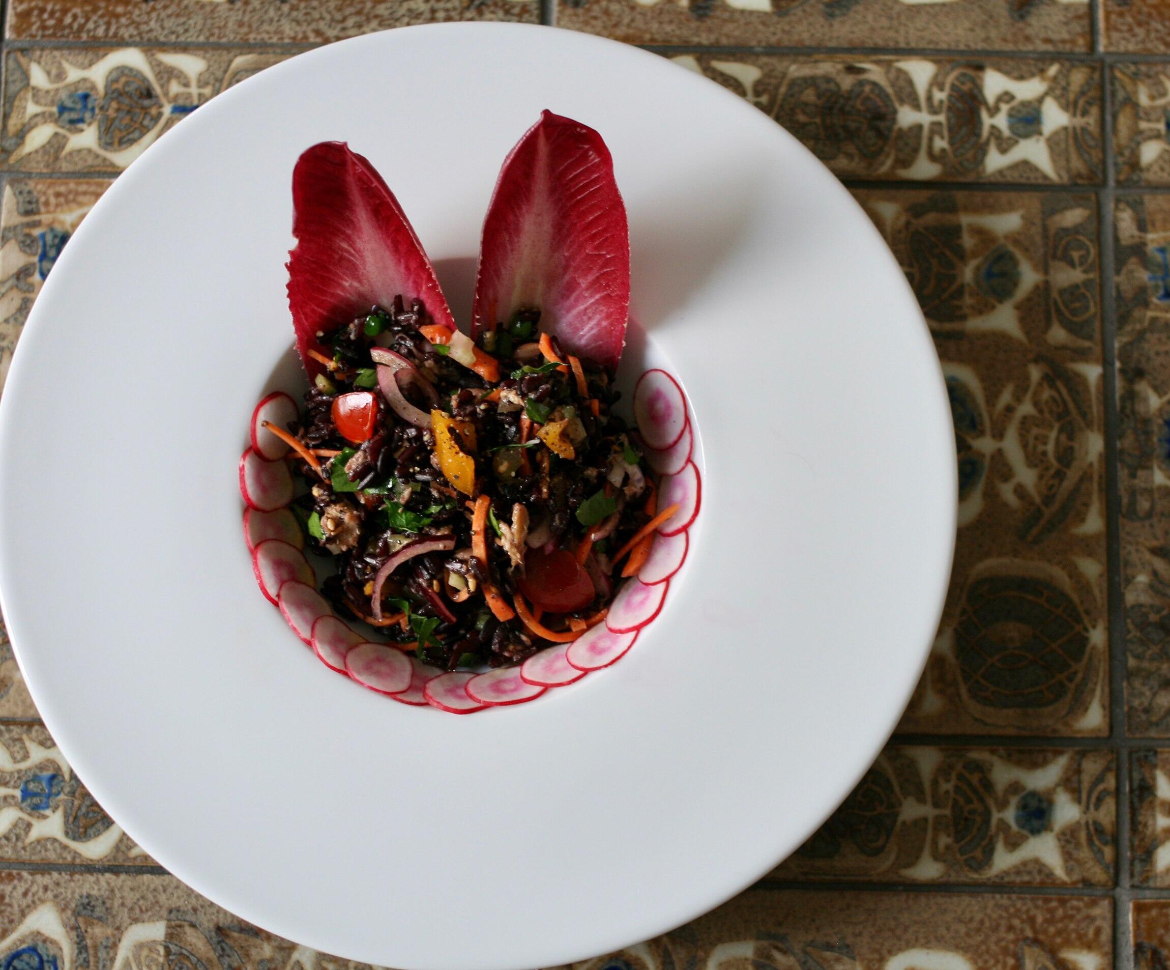 写真のように、今日は紫アンディーブがあったので、黒米サラダを載せて、スプーンがわりにし、まるごと食べてみた。いやはや、なかなか他では味わうことの出来ない贅沢な食感となった。ちょっとウサギさんのようなデコレーションを施し、遊び心を加えてみた。紫のパワーが溢れる黒米サラダ、ぜひ、長寿のために、つくって頂きたい。