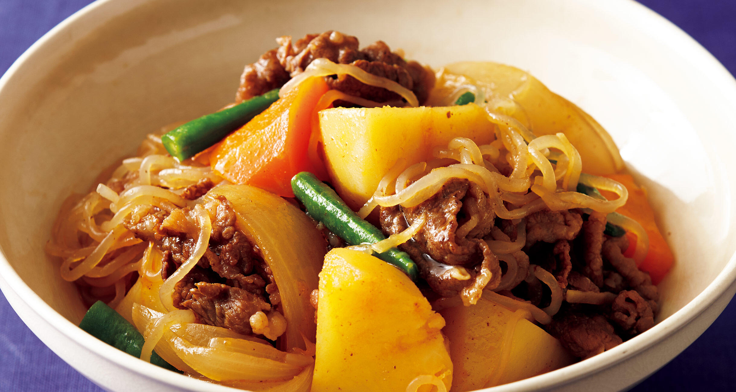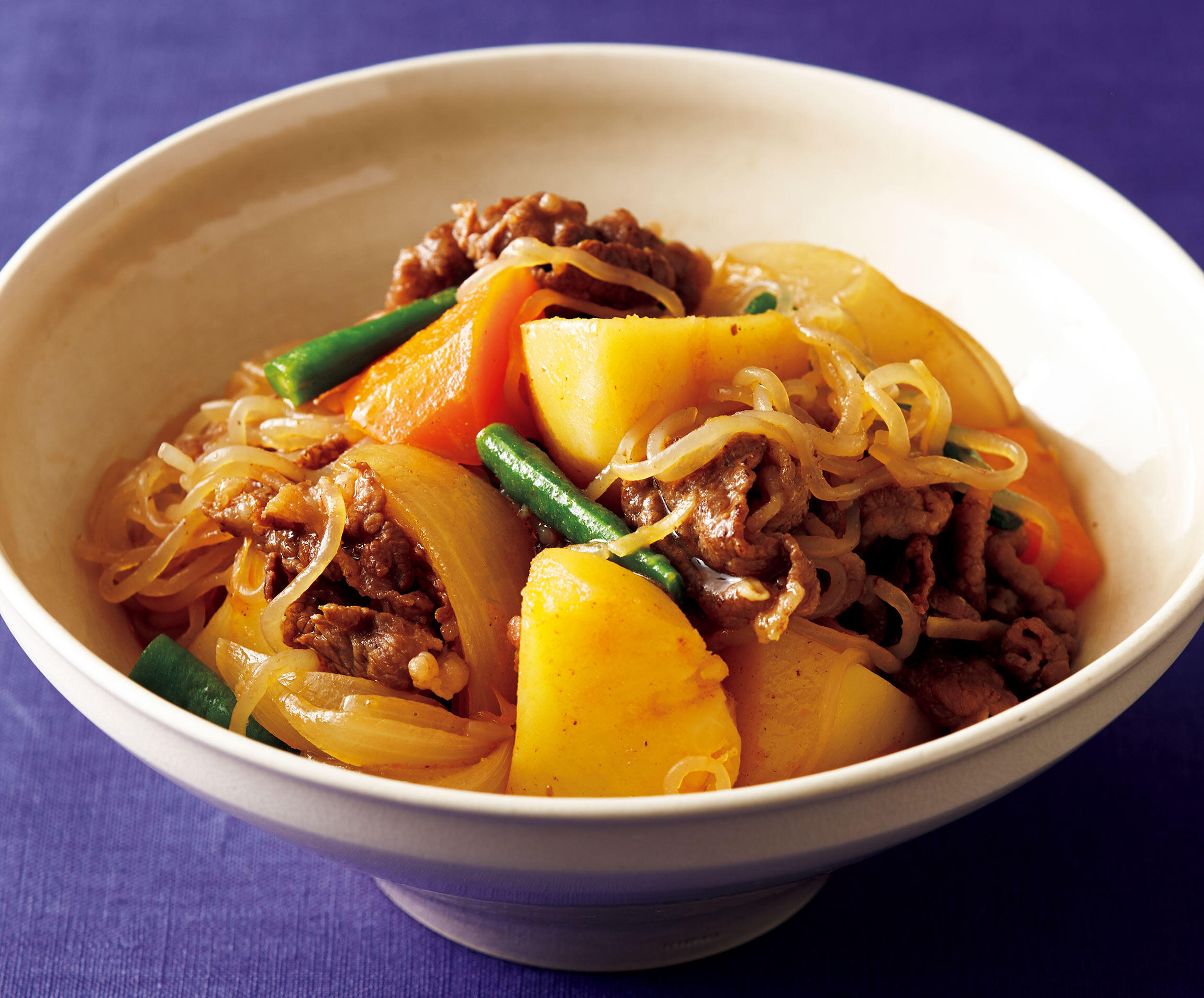 鍋にサラダ油を入れ、火にかけて鍋をならし、牛肉を入れて炒める。肉の色が変わったら、じゃがいも、にんじん、玉ねぎ、しらたきを加えて炒め合わせる。