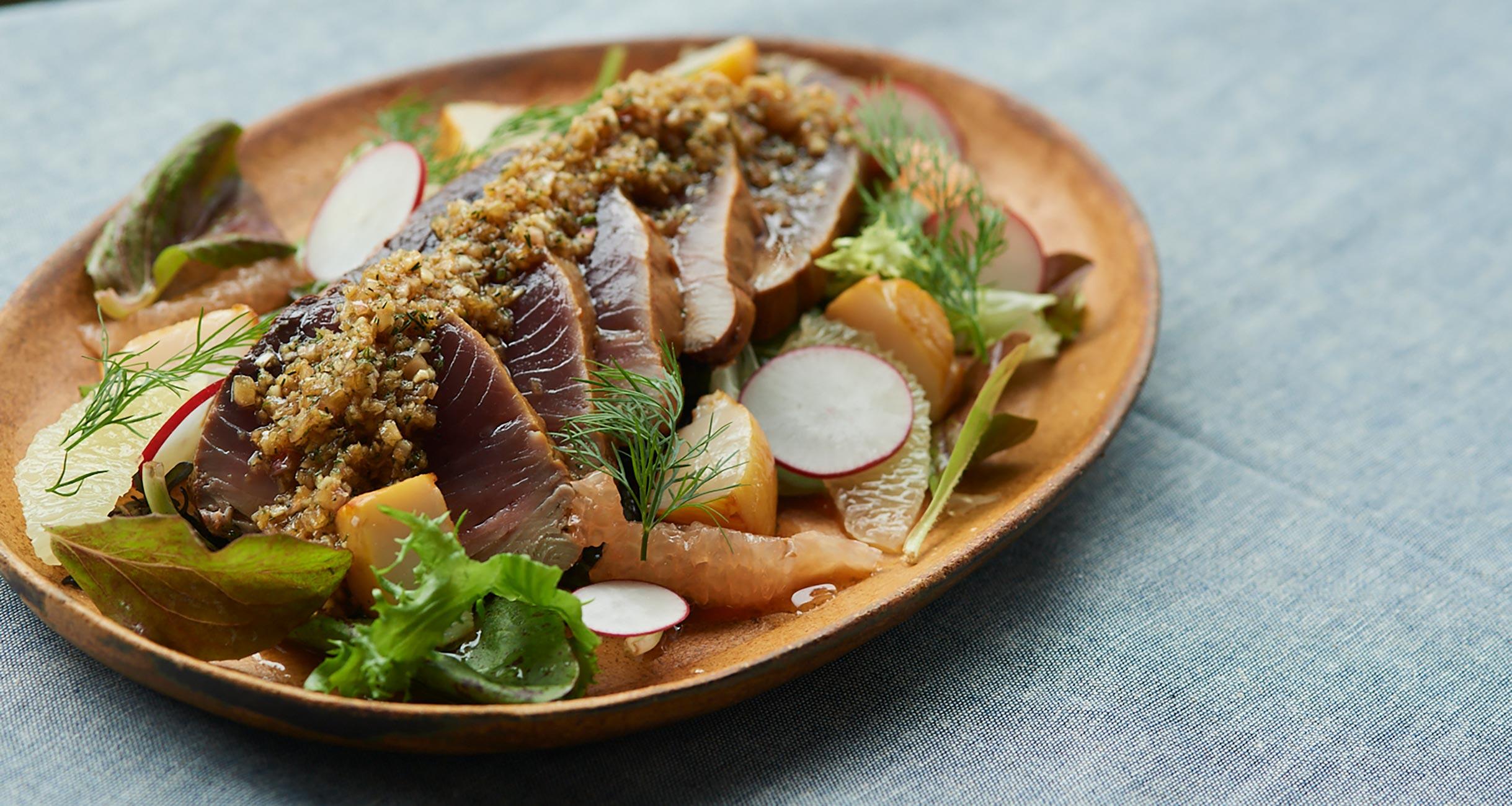 器に3を盛り、好みの野菜類(ベビーリーフ、グレープフルーツ、ラディッシュ、ディルなど、すべて分量外)を添える。[タレ]の材料を混ぜ合わせてかける。