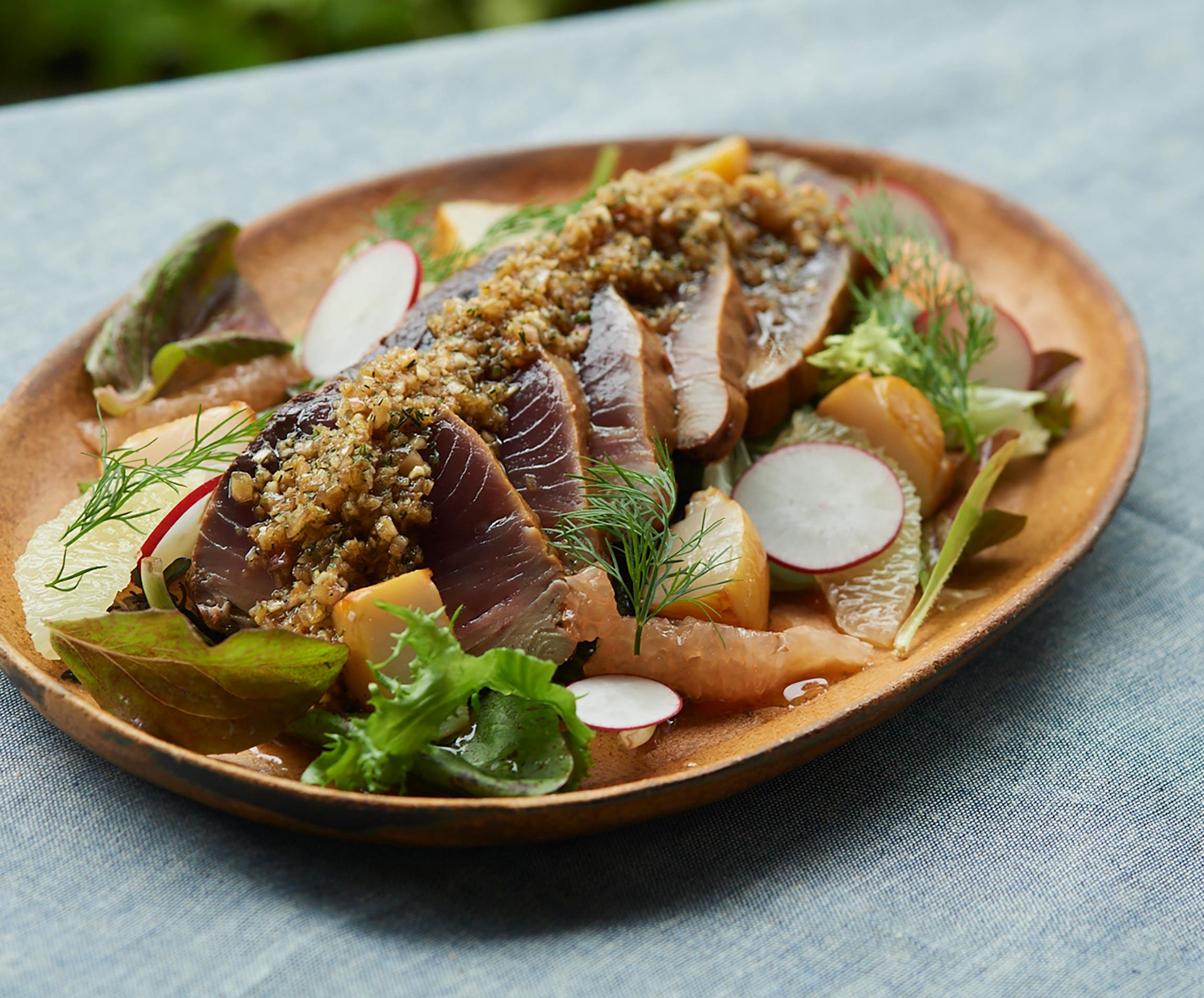 これはまさに、カツオのたたきの如し!ホタテにもほどよく半生に火が入っていて、生姜やみょうがを刻んだ香味ダレがスモーキーな香りに合います。開放感たっぷりの外で飲むお酒、味わうごはんは気持ちいいし、美味しいですよね。そんな「外ごはん」のために、東京・清澄白河の中華「O2」の大津光太郎さんが本気で考えた、オープンエアな美味レシピをご紹介します!