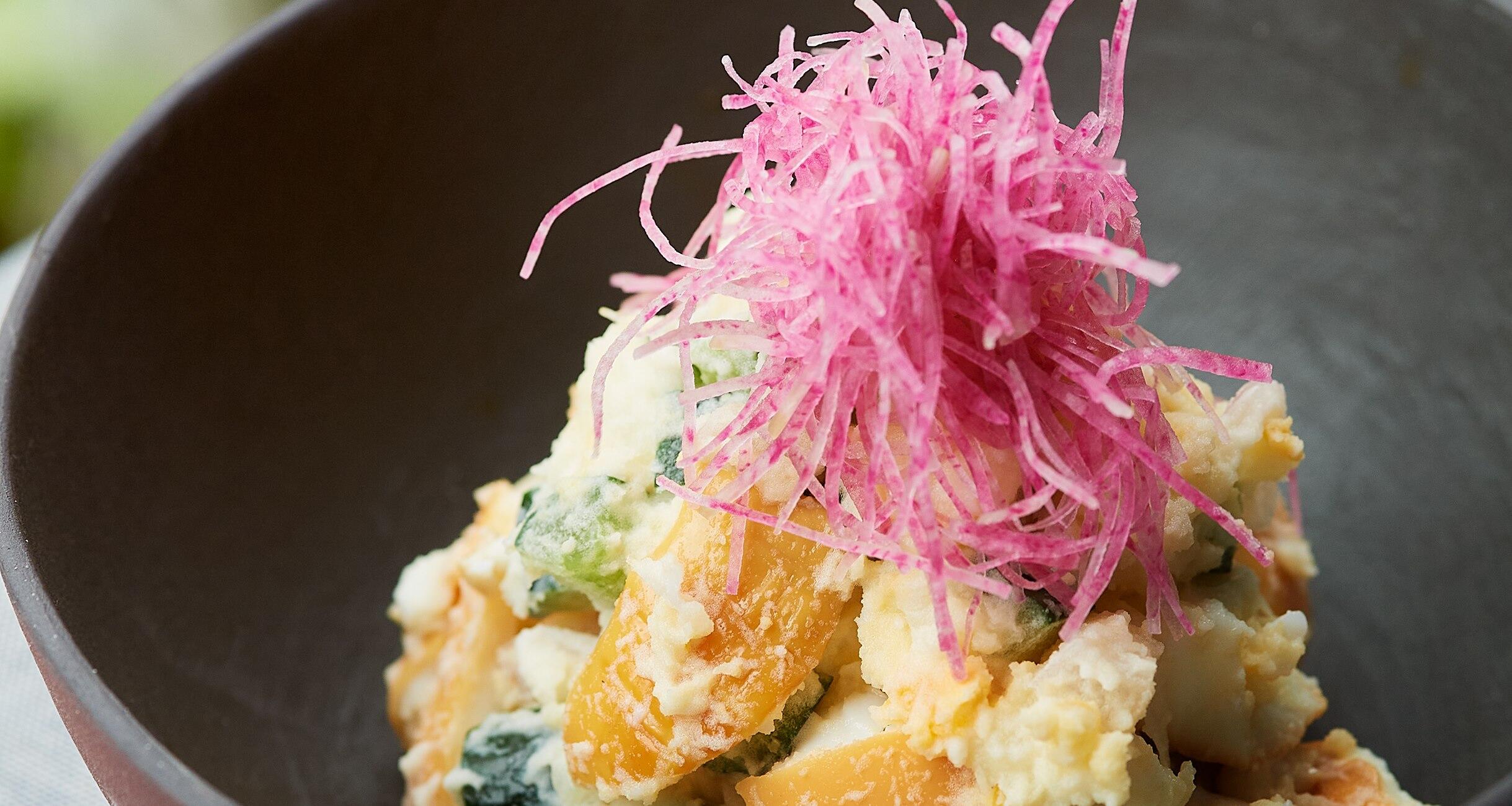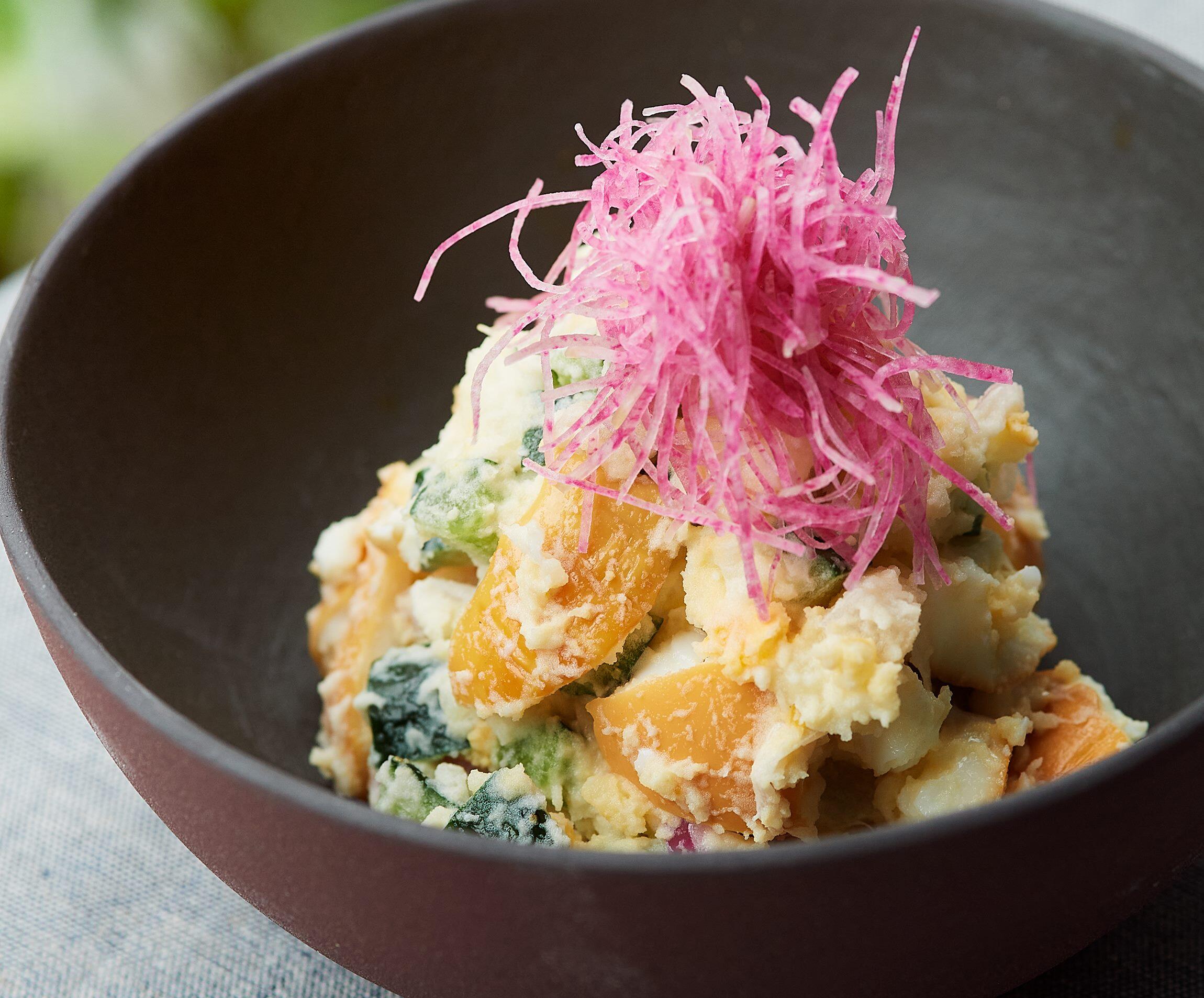 「カツオとホタテの中華風燻製」で一緒に燻しておいたゆで卵を使うのがポイント。グシャッと粗くつぶして混ぜるのが、おいしく仕上げるコツだ。さらにザーサイを加えることで、中華ならではの味わい深いポテサラに!