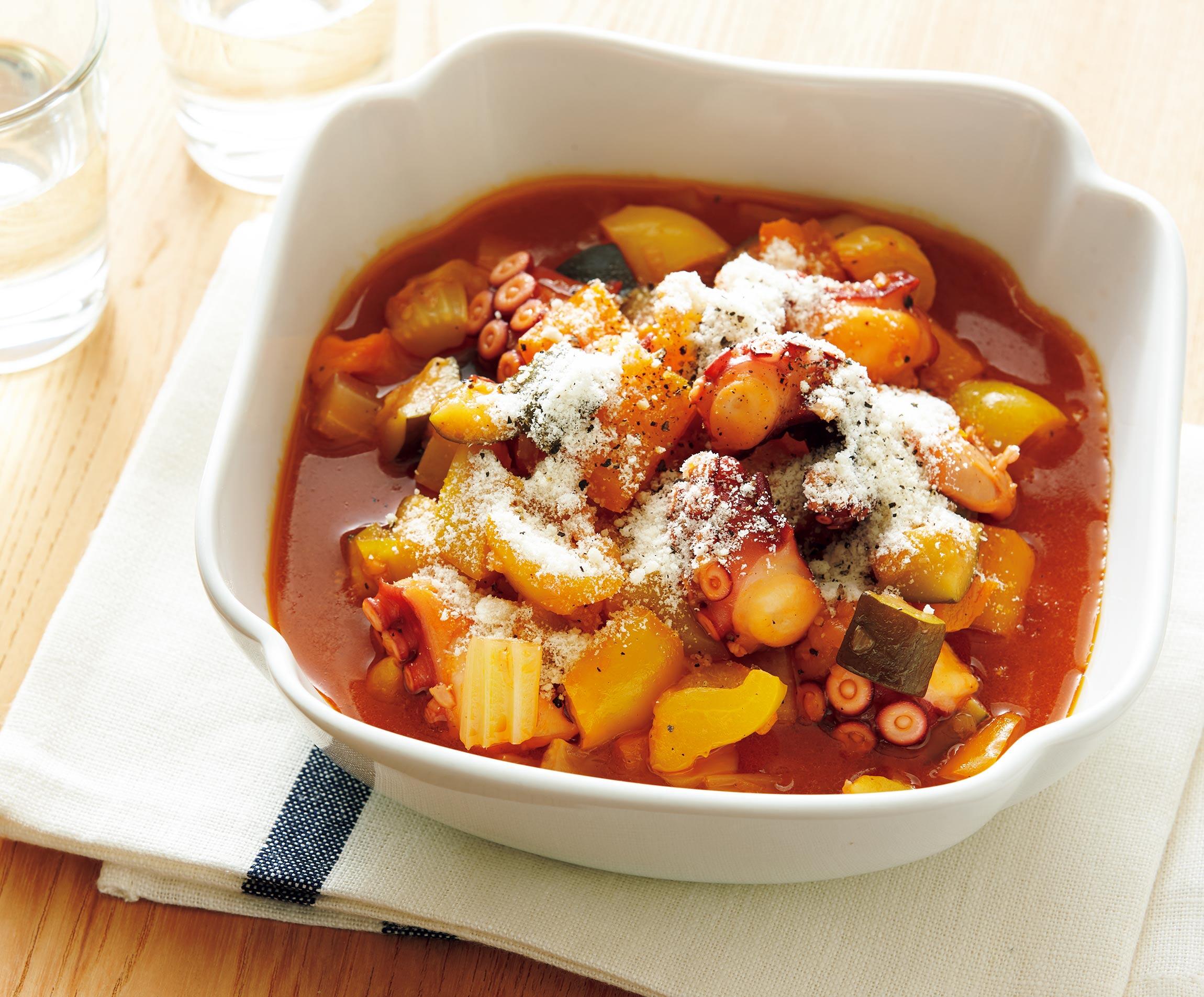 フライパンにオリーブオイルを熱して玉ねぎ、にんにくを入れ、中火でしんなりするまで炒める。残りの野菜を加えて全体に油が回ったら、タコを加える。