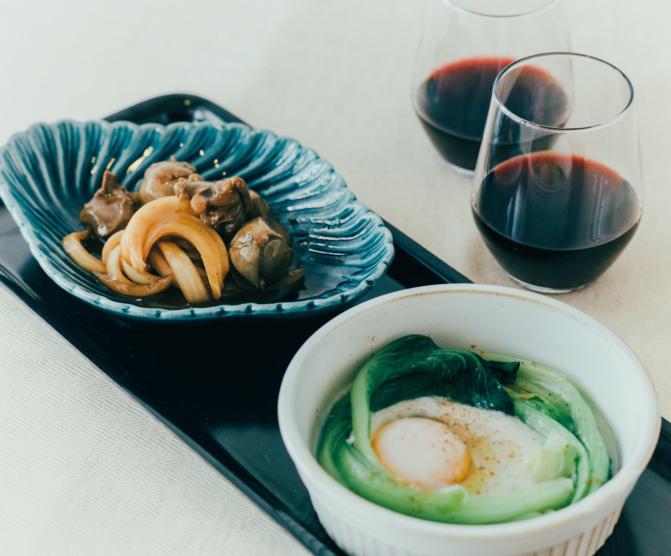 みずみずしい菜っ葉は、どすんと存在感のある半熟卵やオリーブオイルでこっくり味に。赤ワインの盟友にしてしまうナツメグの腕力をお試しあれ!