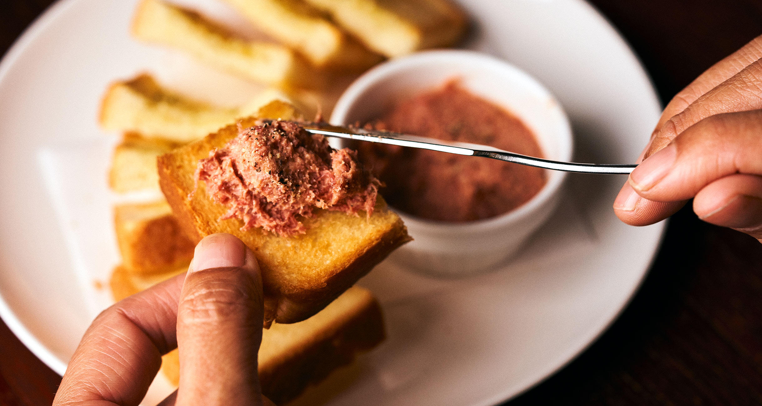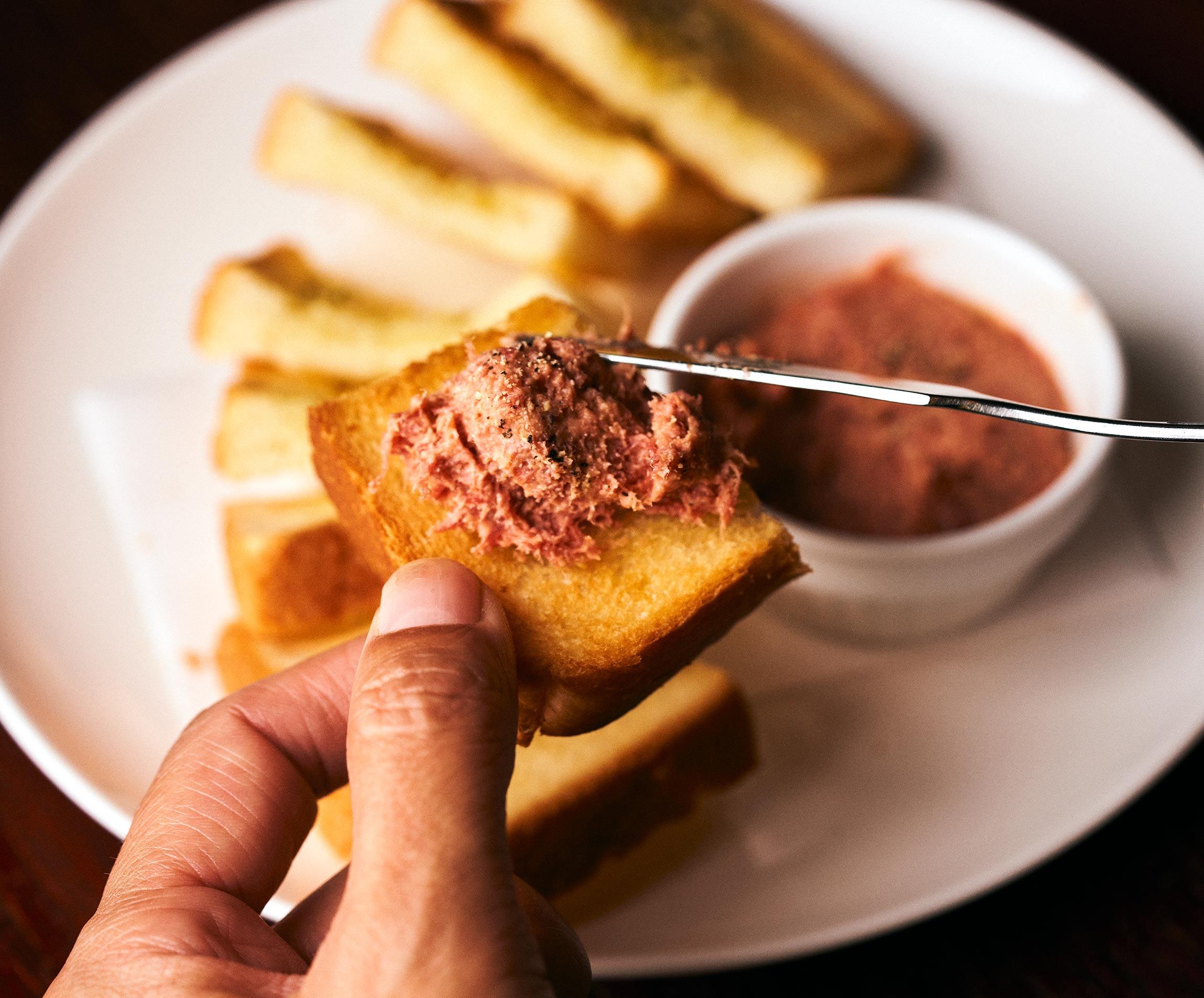 香ばしいガーリックトーストにやわらかな酸味をまとったコンビーフが好相性。銀座の人気店「銀座ロックフィッシュ」の間口一就さんは、 ハイボールと缶詰おつまみの第一人者 !そんな間口さんにコンビーフ缶つまの定番から最新作まで、10品を教えてもらいました。