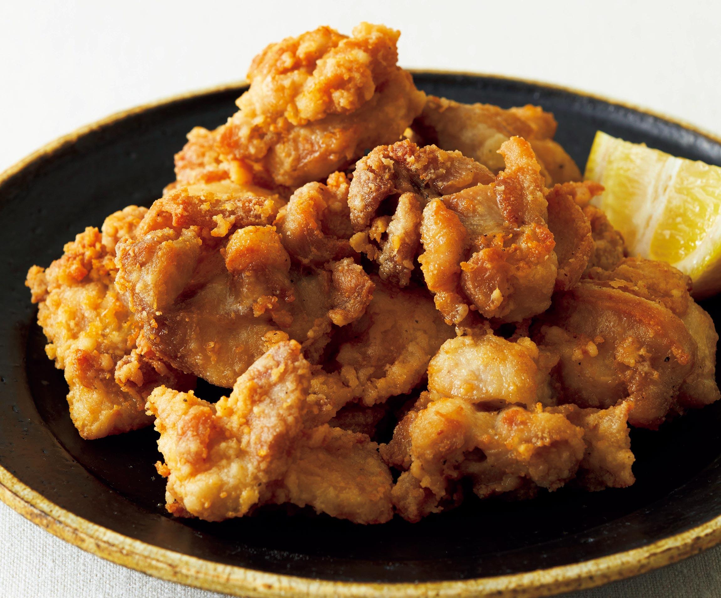 フライパンの深さ1/2まで揚げ油を入れて中温(170~175℃)に熱し、鶏肉をひと切れずつ入れ、中火で4~5分、カリッと揚げて取り出す。器に盛ってレモンを添える。