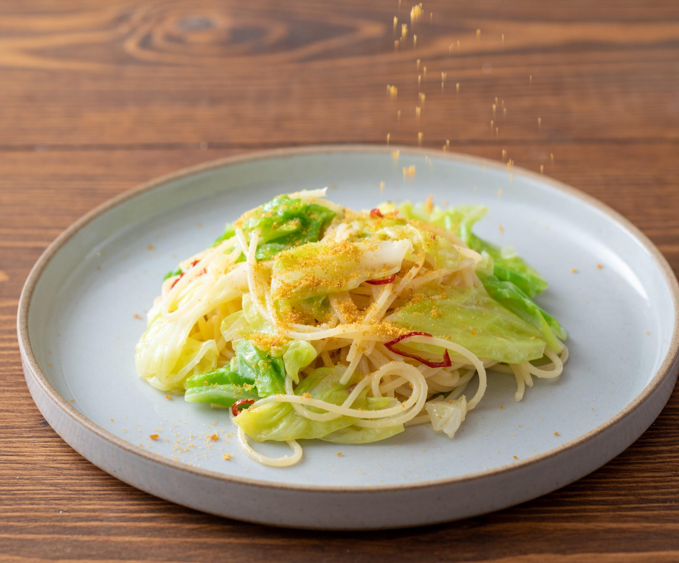 仕上げのカラスミが無い時は、しらすを乗せたり、ほぐしたタラコを乗せても良い。ちょっとの塩味がキャベツを引き立ててくれます。