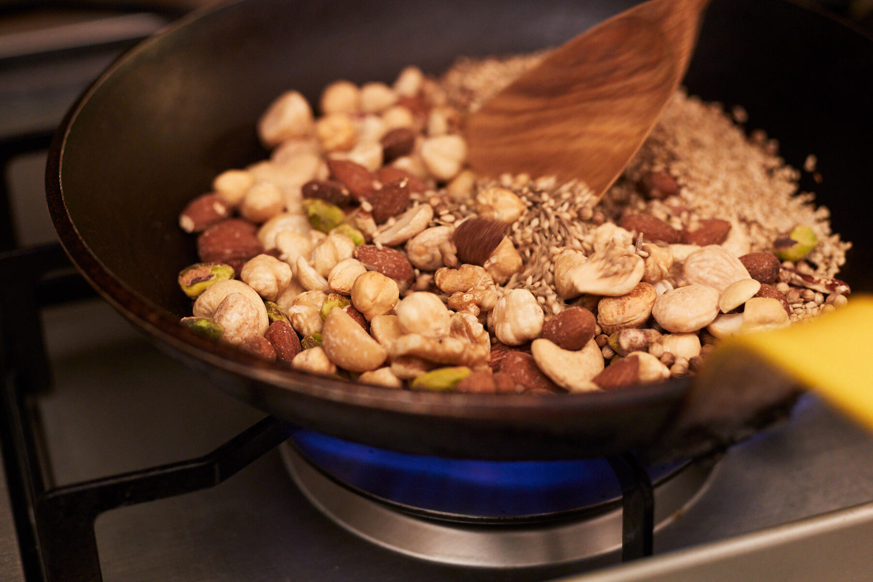 フライパンにミックスナッツとピスタチオ、胡麻、クミンシード、コリアンダーシードを入れて火にかけ、胡麻がパチパチいうくらいになるまでから煎りする。