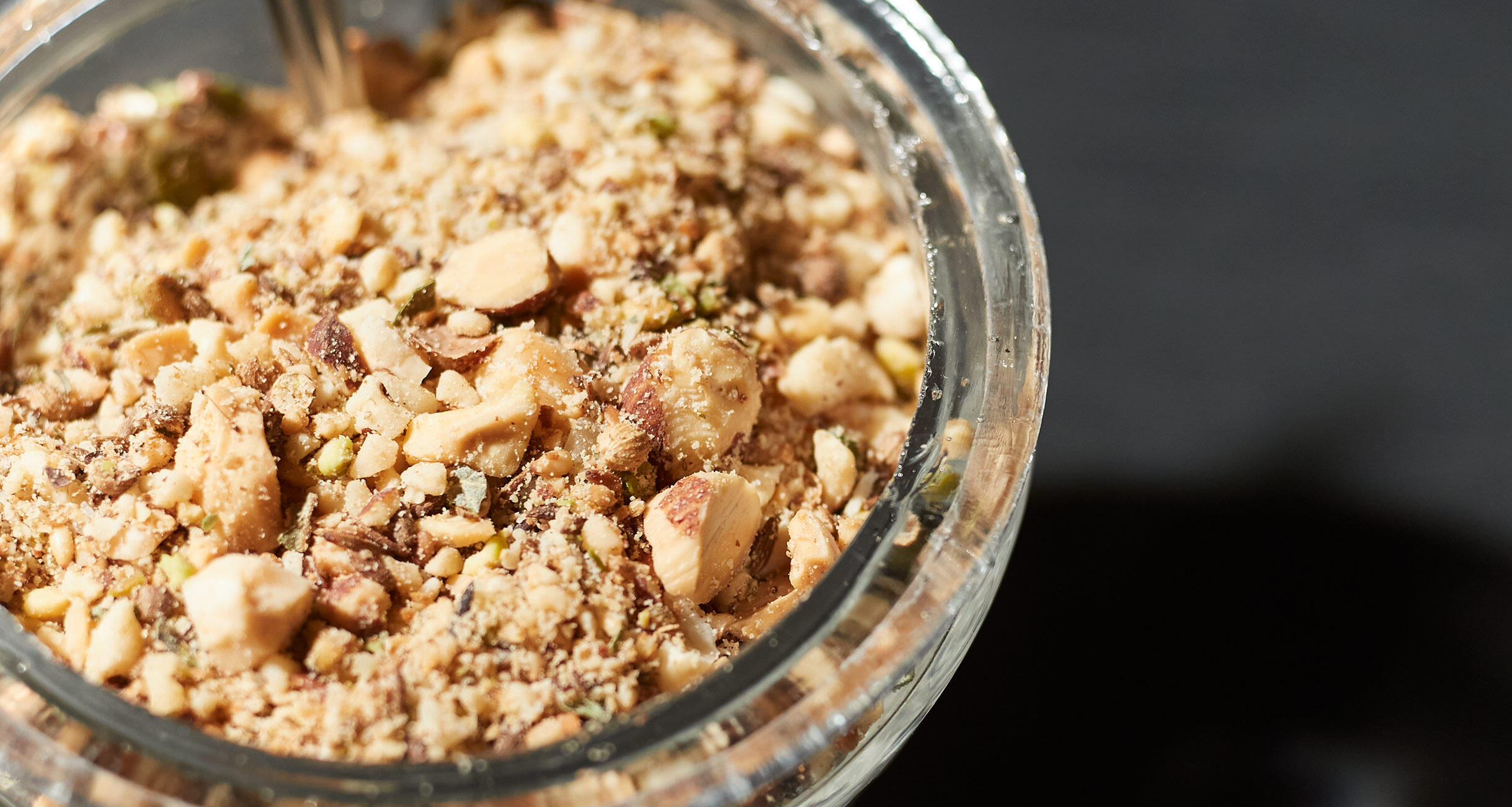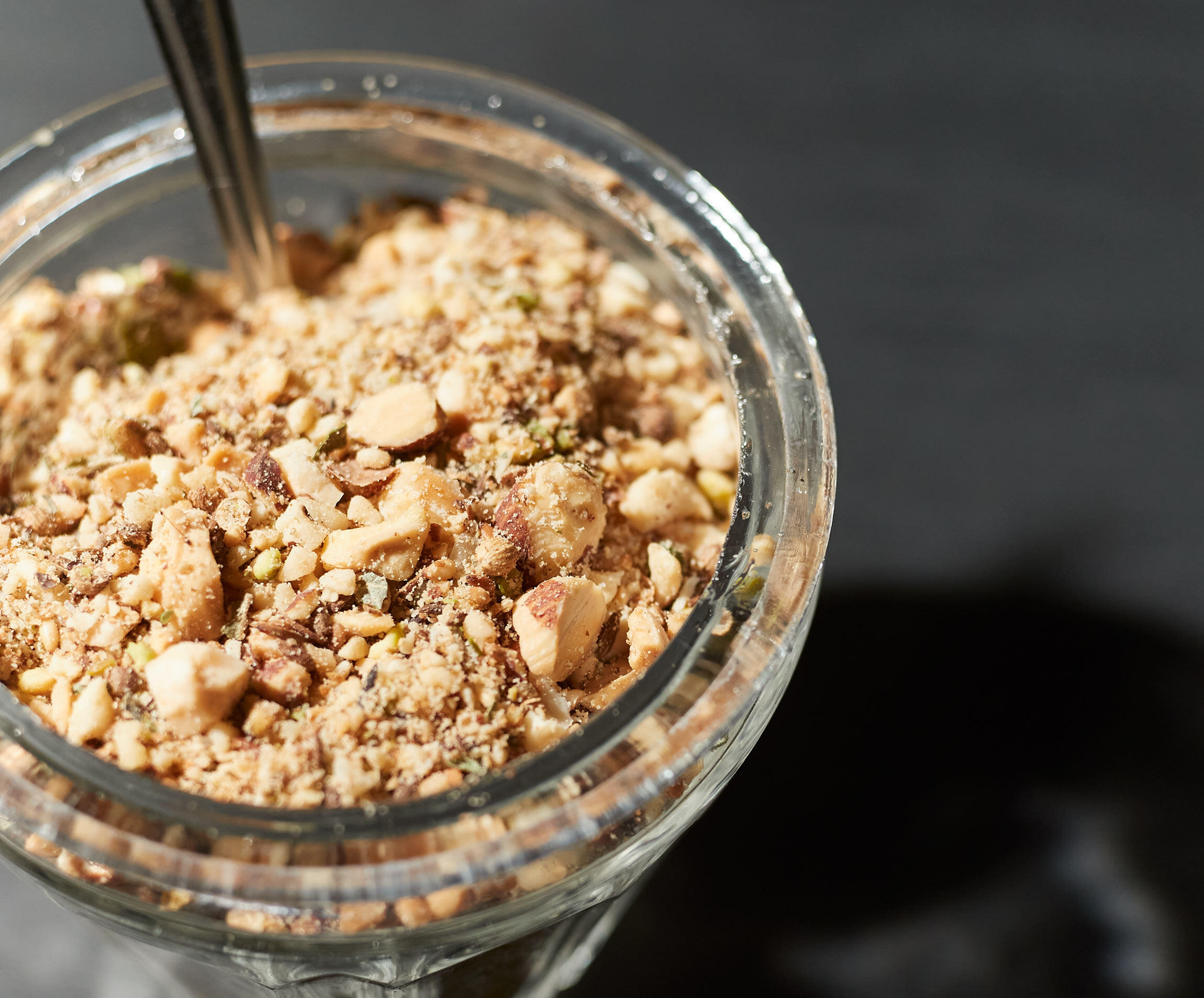 デュカは数種類のスパイスとナッツを混ぜてつくる、中東で誕生したスパイスナッツ。クミン、コリアンダー、ナッツ、塩が基本の材料ですが、あとは各家庭によってさまざま。手軽にエスニックな味わいを楽しめるのが魅力です。