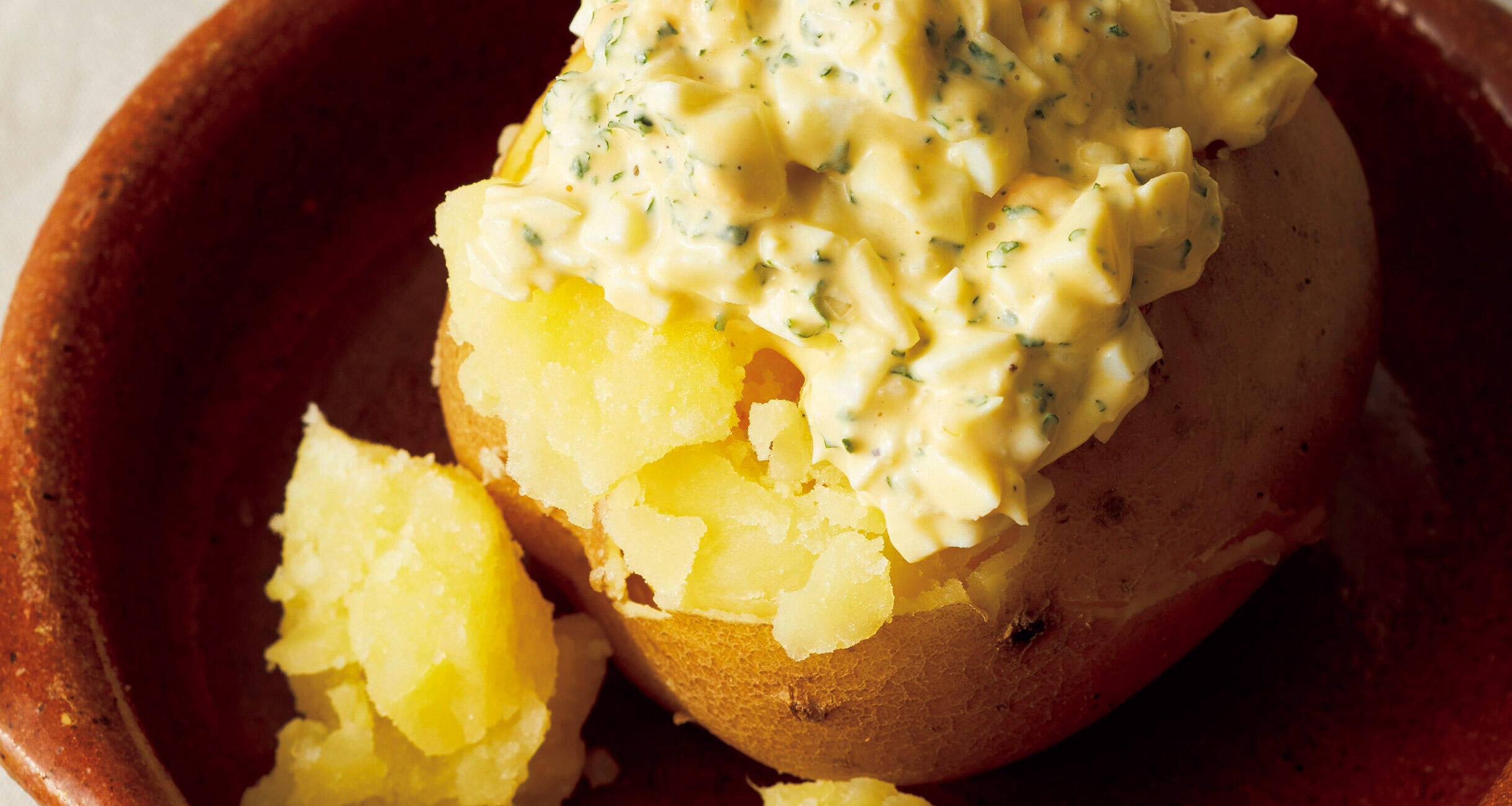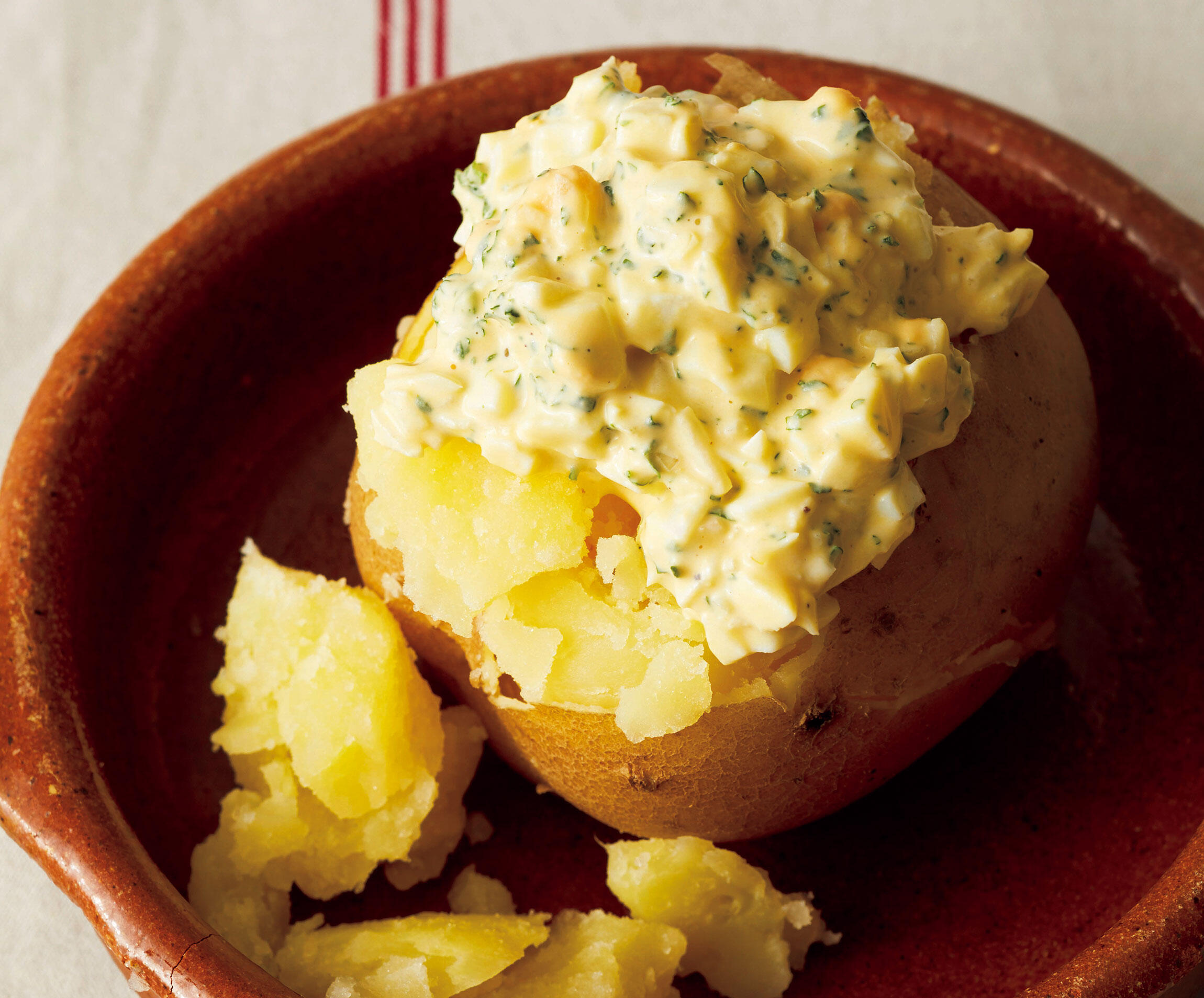 じゃがいもを器に盛り、上部の皮をはがしてタルタルソースをかける。
