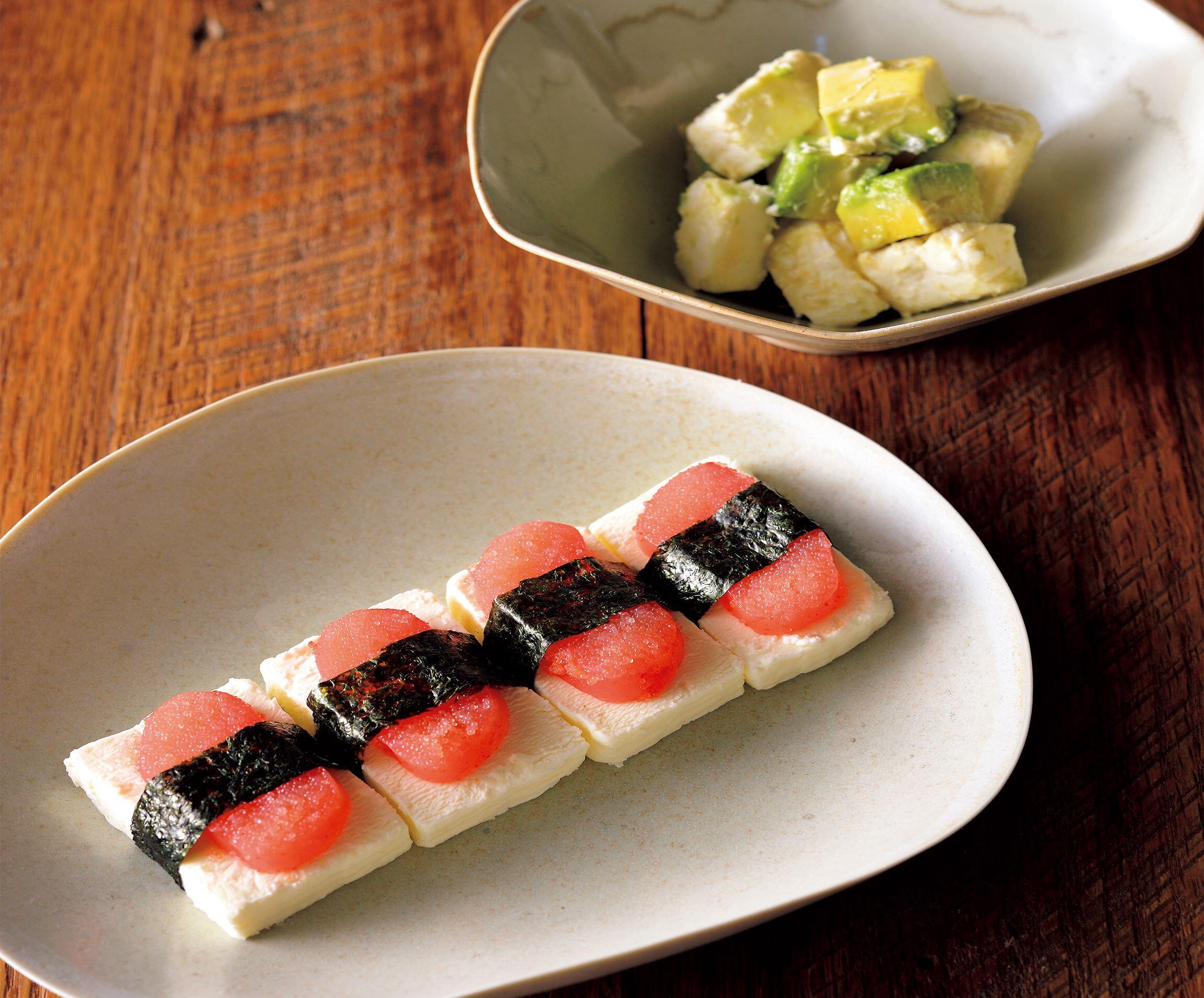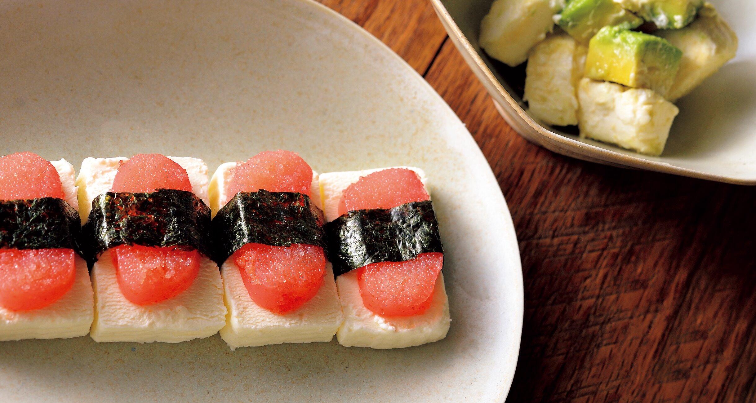 ブリヤサヴァランと明太子を重ね、帯状に切った海苔を巻く。