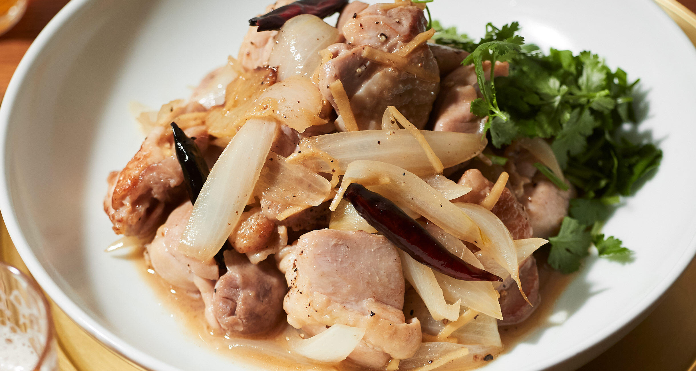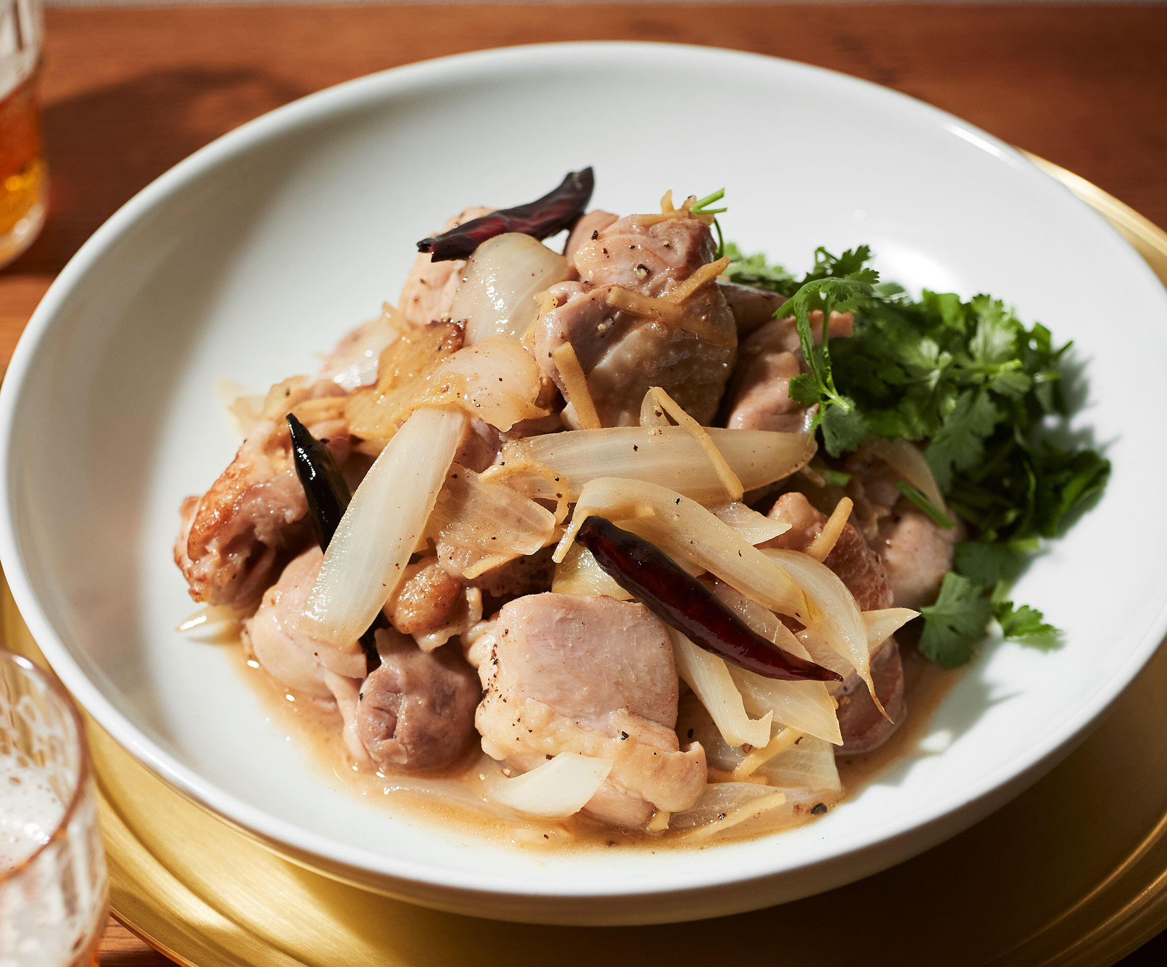 鶏肉は下味をつけておくとやわらかく、炒めてから蒸し煮することでジューシーに仕上がります。仕上げに香菜を添え、全体に混ぜていただきます。炒め物といっても、蓋をして火を通して仕上げるので、口当たりはやさしく、スパイスとハーブの香りで飽きのこないおいしさです。香菜は好みで加減してください。