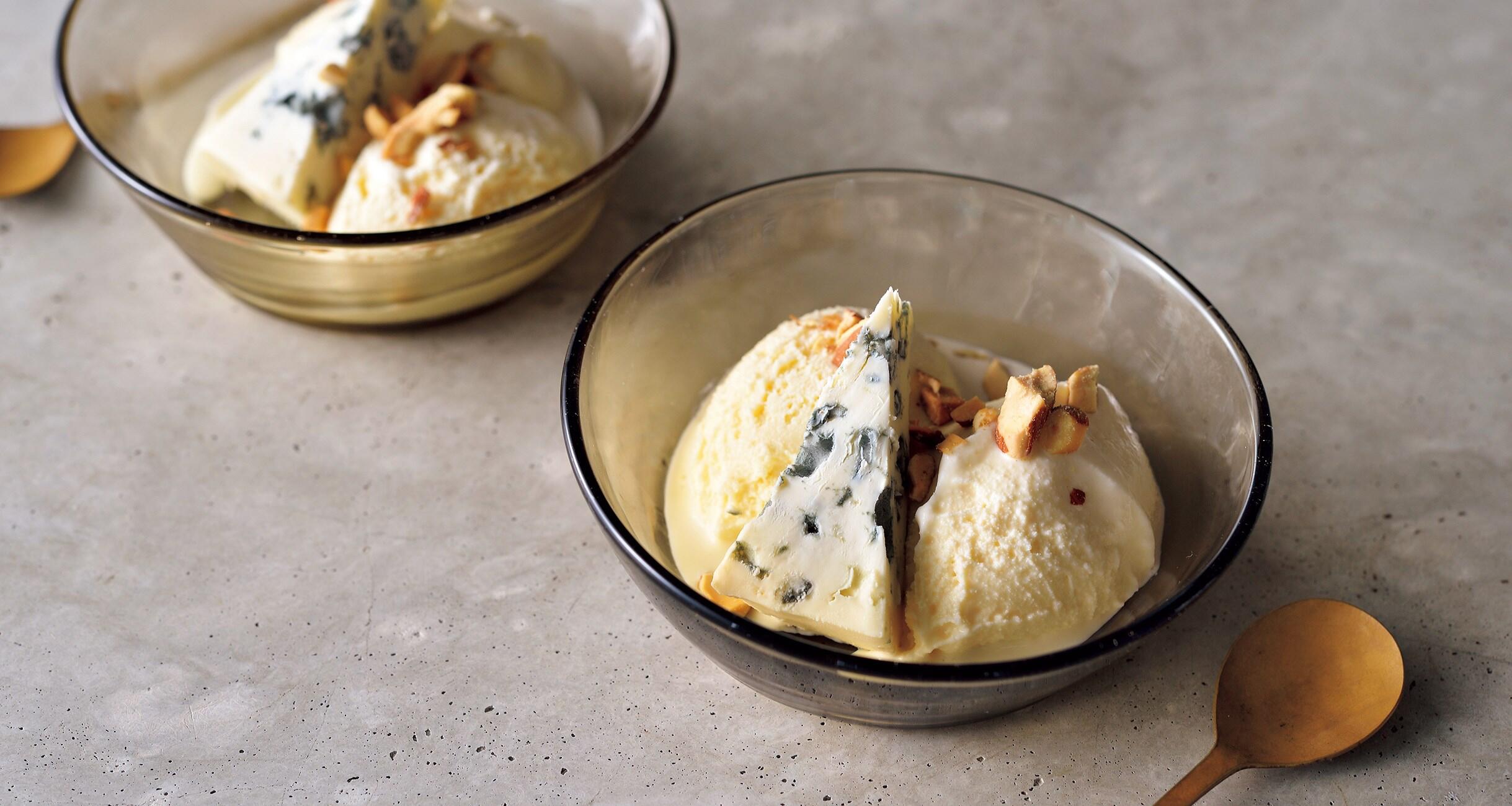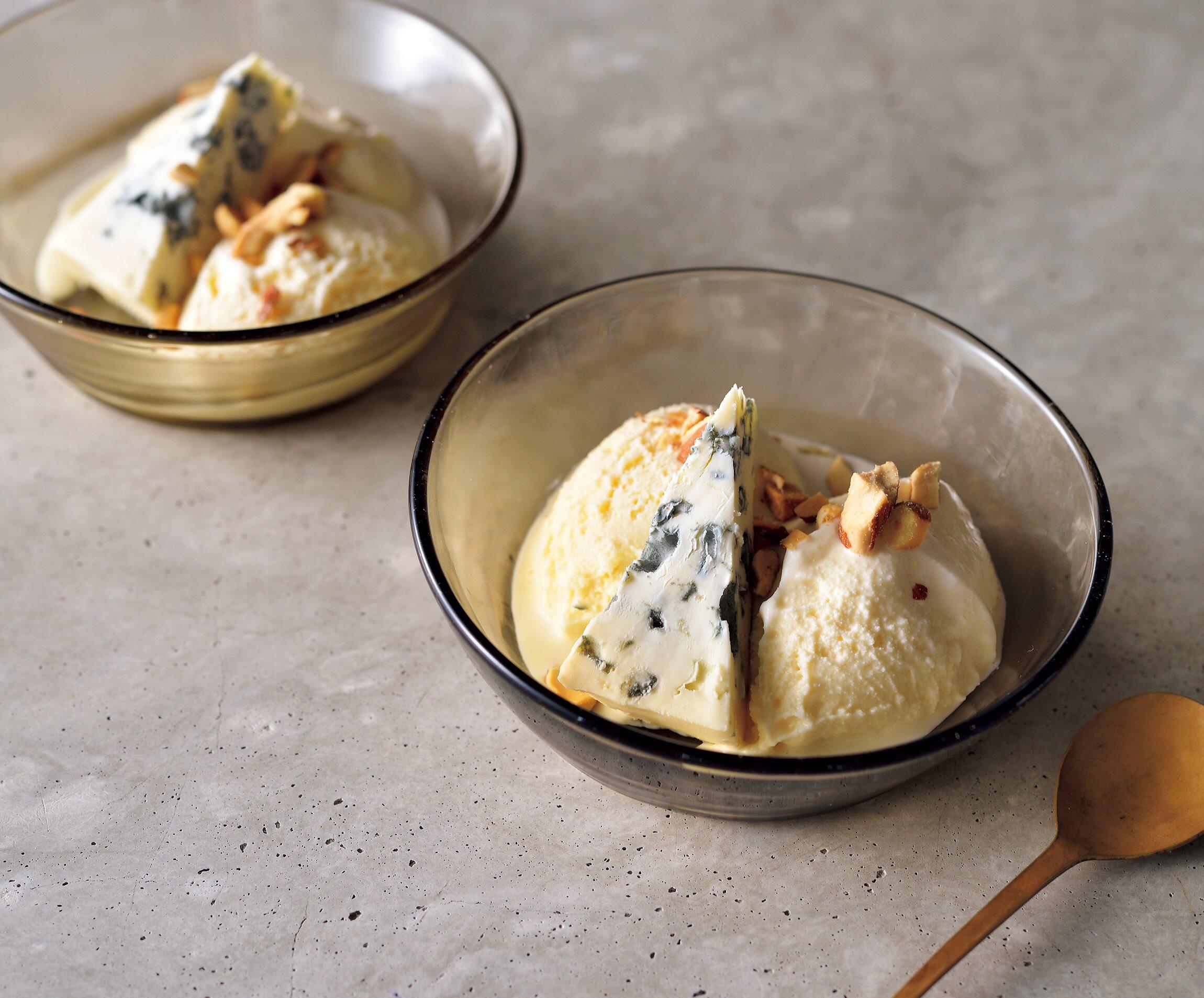 青カビチーズのなかでも、比較的まろやかで優しい味わいのフルムダンベールを使ったデザートです。チーズのほろ苦い青カビがアイスの甘味と好相性。ナッツの食感もアクセントに、おいしさ倍増です!そのまま食べても美味しいチーズに+αのアイディアで、ぐっと魅力的なつまみにアップグレードする技を、チーズ専門店の「チーズ王国」に習いました。