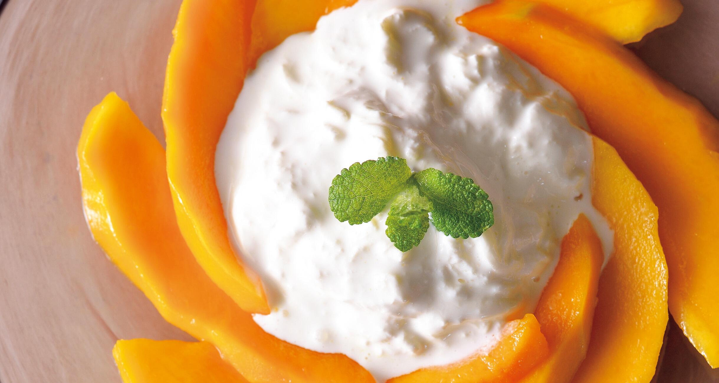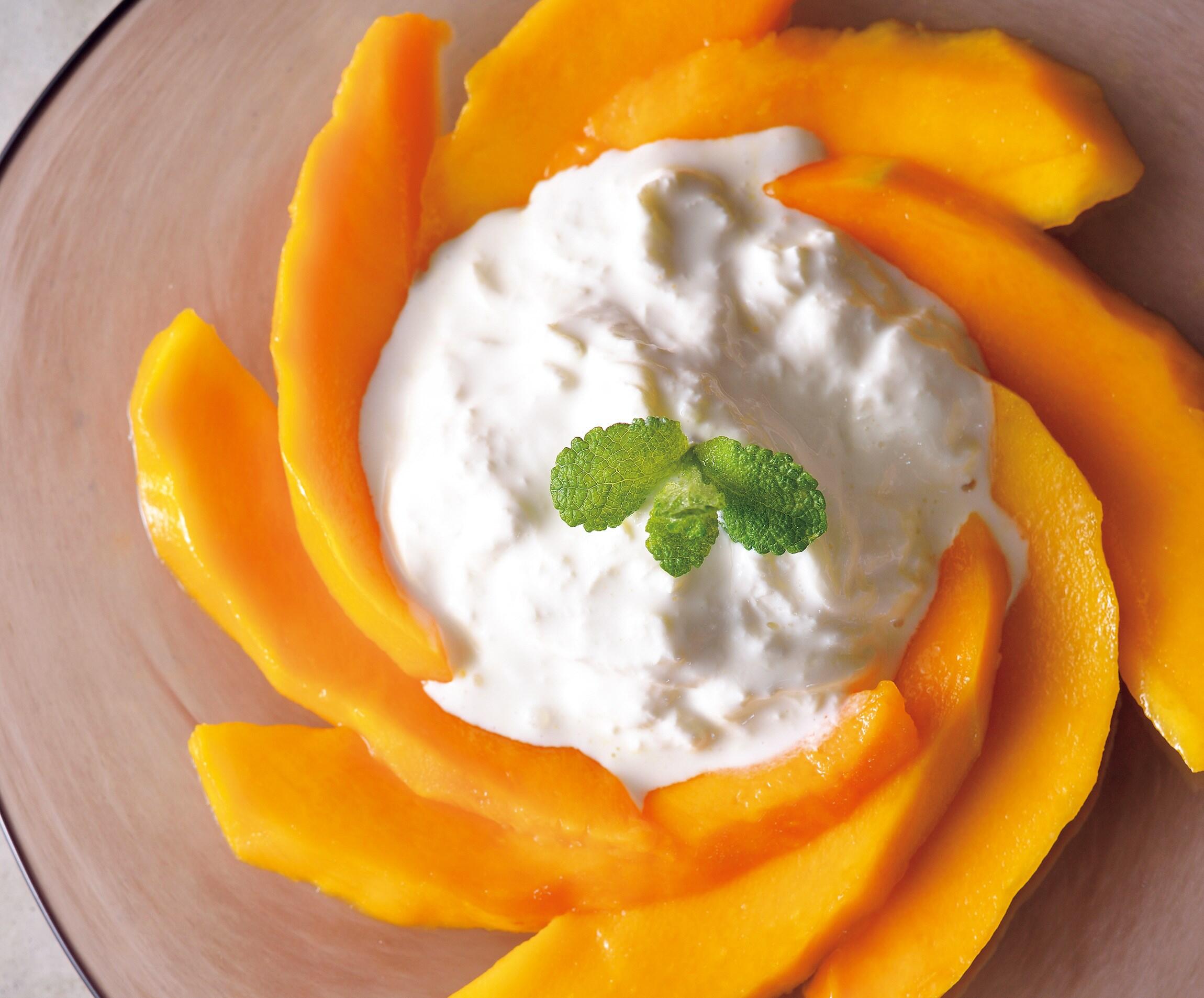 ミルキーなフレッシュチーズ“ブラータ”とマンゴーが織りなす、ジューシーで芳香豊かな一品。そのまま食べても美味しいチーズに+αのアイディアで、ぐっと魅力的なつまみにアップグレードする技を、チーズ専門店の「チーズ王国」に習いました。