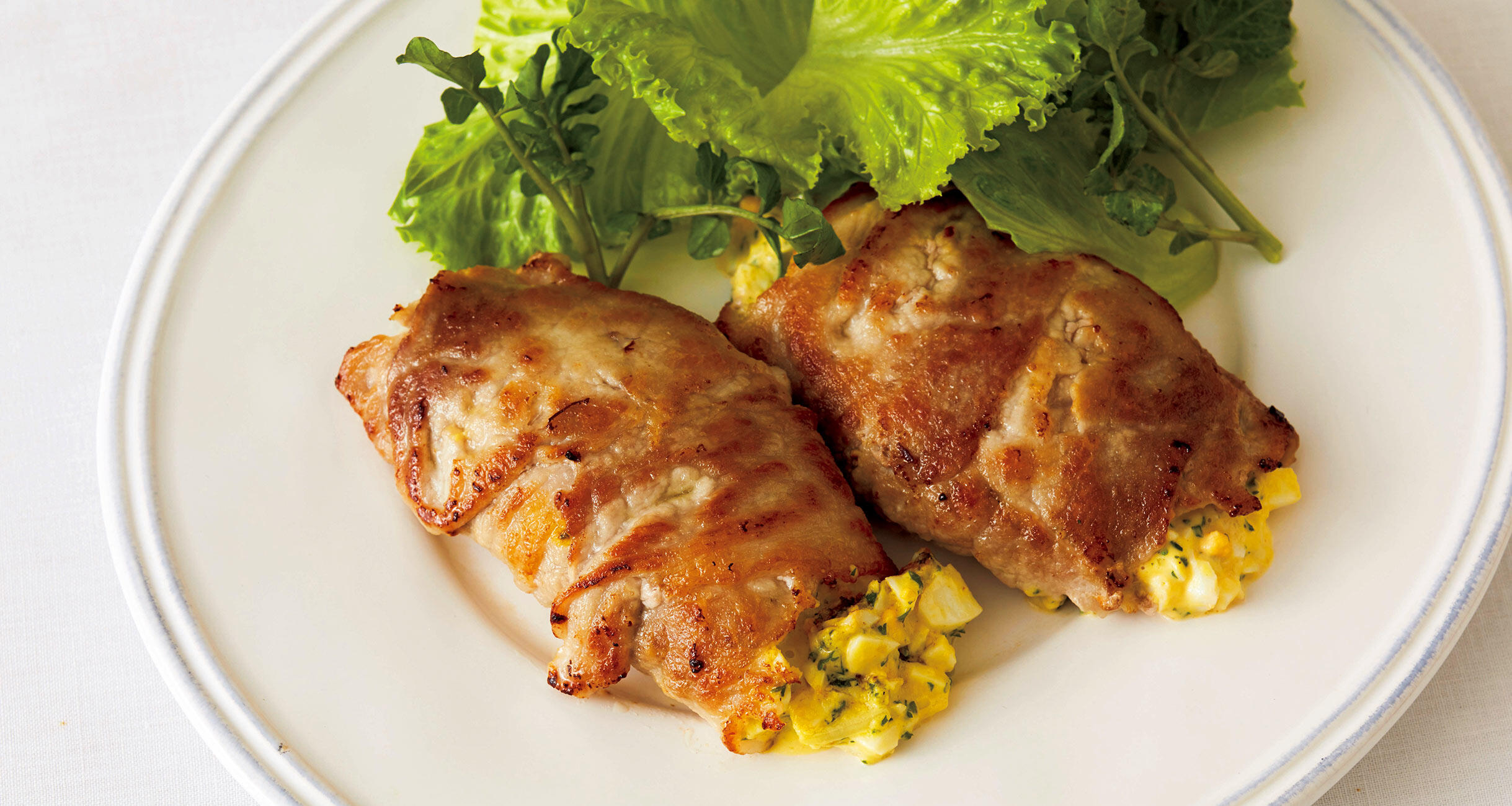 豚もも肉は2枚を少し重ねて広げ、両面に塩、胡椒をふる。上の面に小麦粉を薄くふり、バジルの葉2枚を敷く。タルタルソース大さじ2をのせて肉を折って挟み、端を巻き込む。残りも同様にしてつくる。