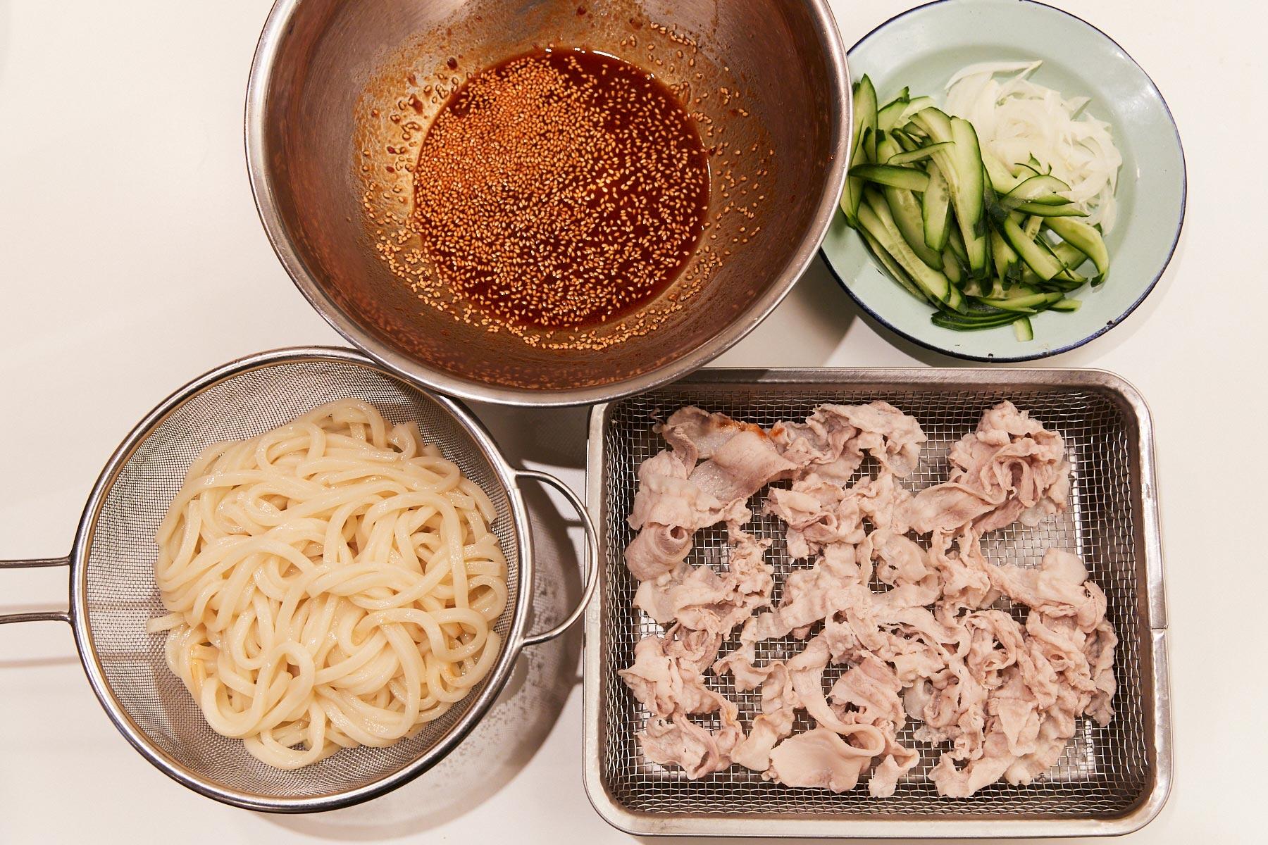 うどんは袋の表示どおりにゆで、ザルにあげて流水で洗い、冷めたら水気をしっかりときる。
