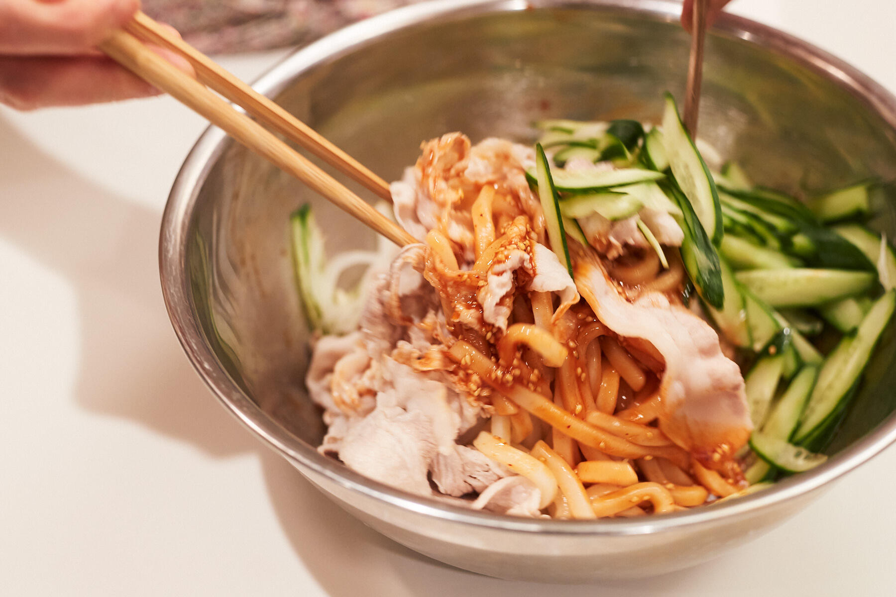 4のボウルにうどんを入れて和え、1の豚肉と2のきゅうり、玉ねぎを加えてよく和える。