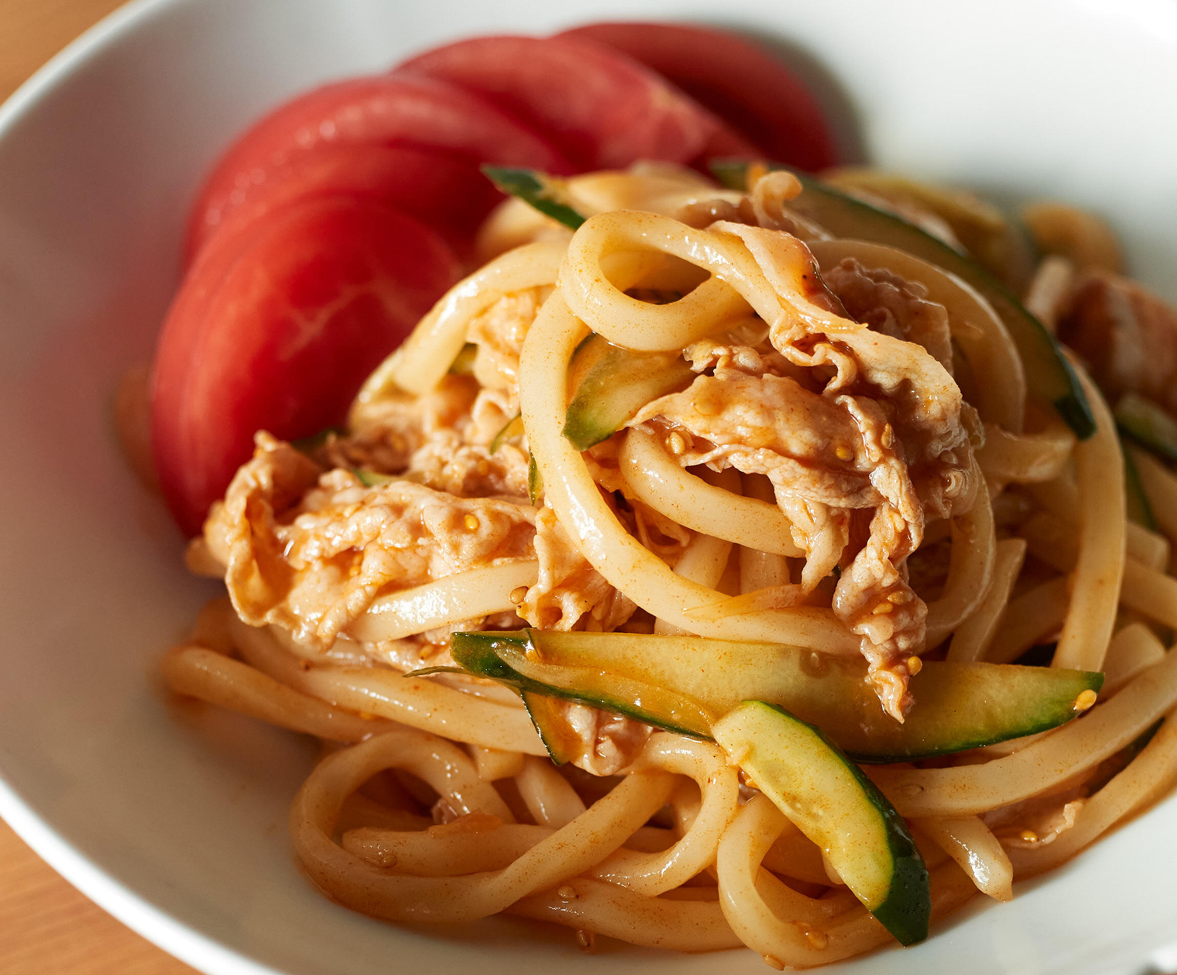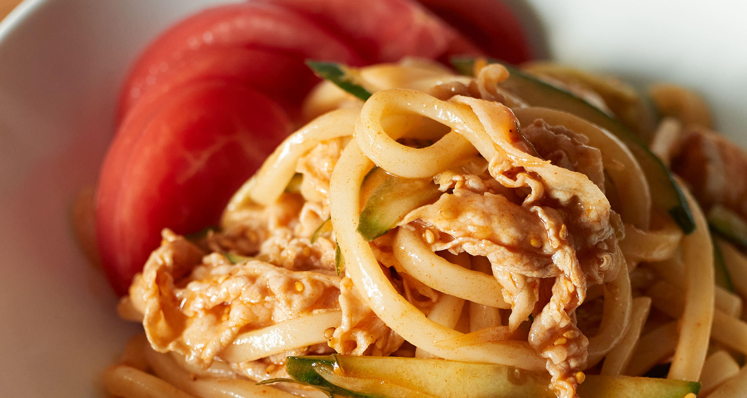 旨辛調味料のヤンニョムと豚しゃぶの相性は間違いなし。食欲を刺激する味わいは、うどん料理のテッパンになること間違いなし!ピリッとしたスパイスや爽やかなハーブをつかった夏にぴったりの料理を、料理家の小堀紀代美さんに教えていただきました。