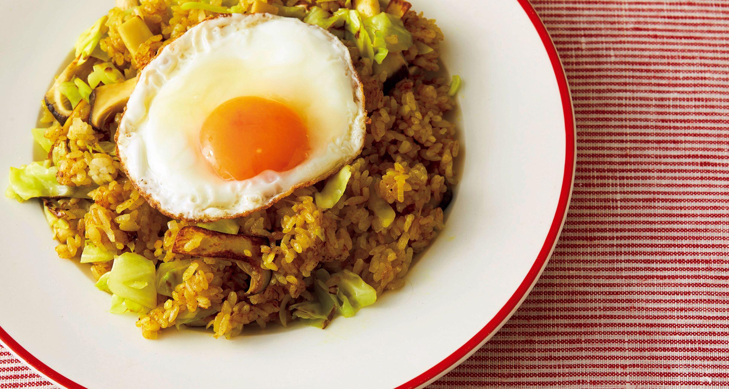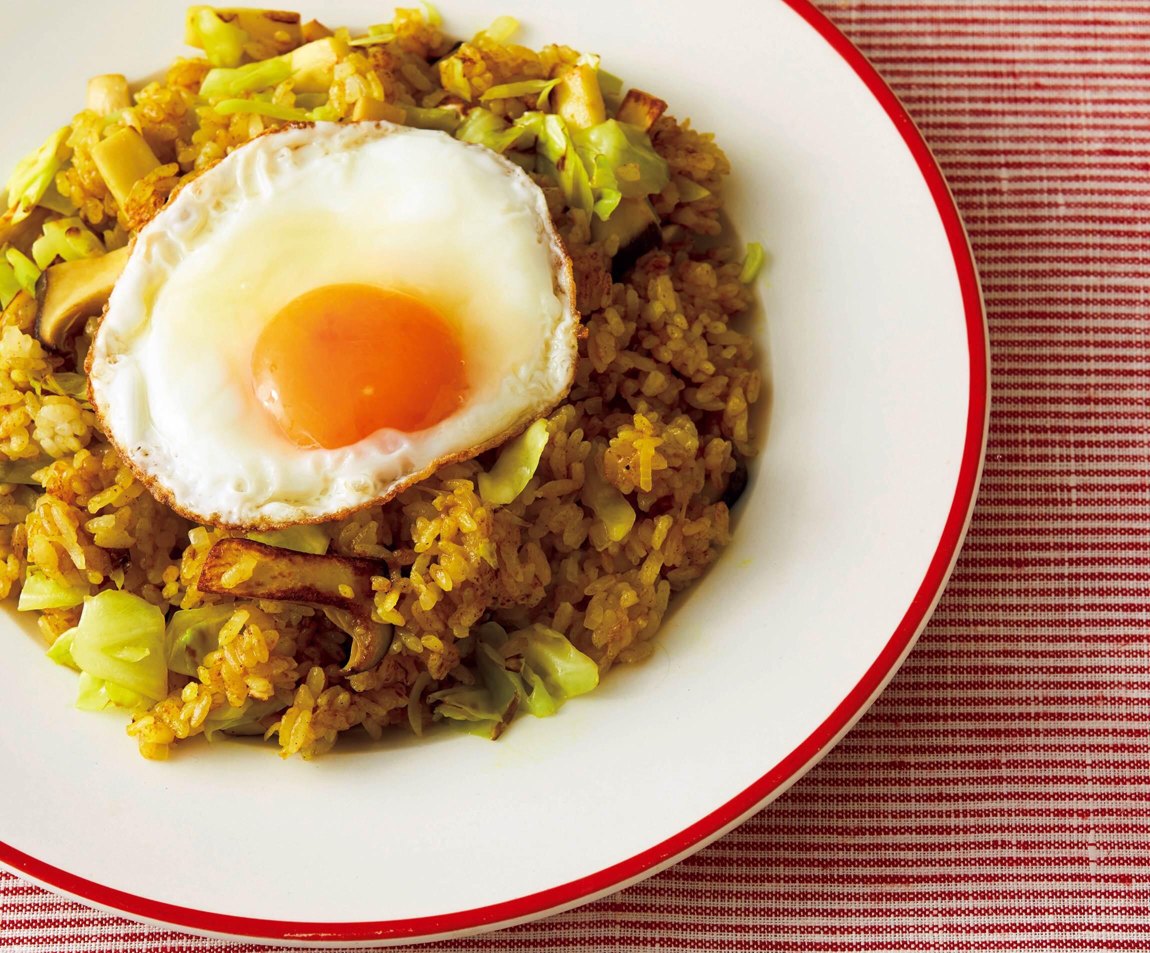ご飯、カレーマヨソースを加えて炒め合わせ、キャベツを加えてしんなりするまで炒め合わせて器に盛る。
