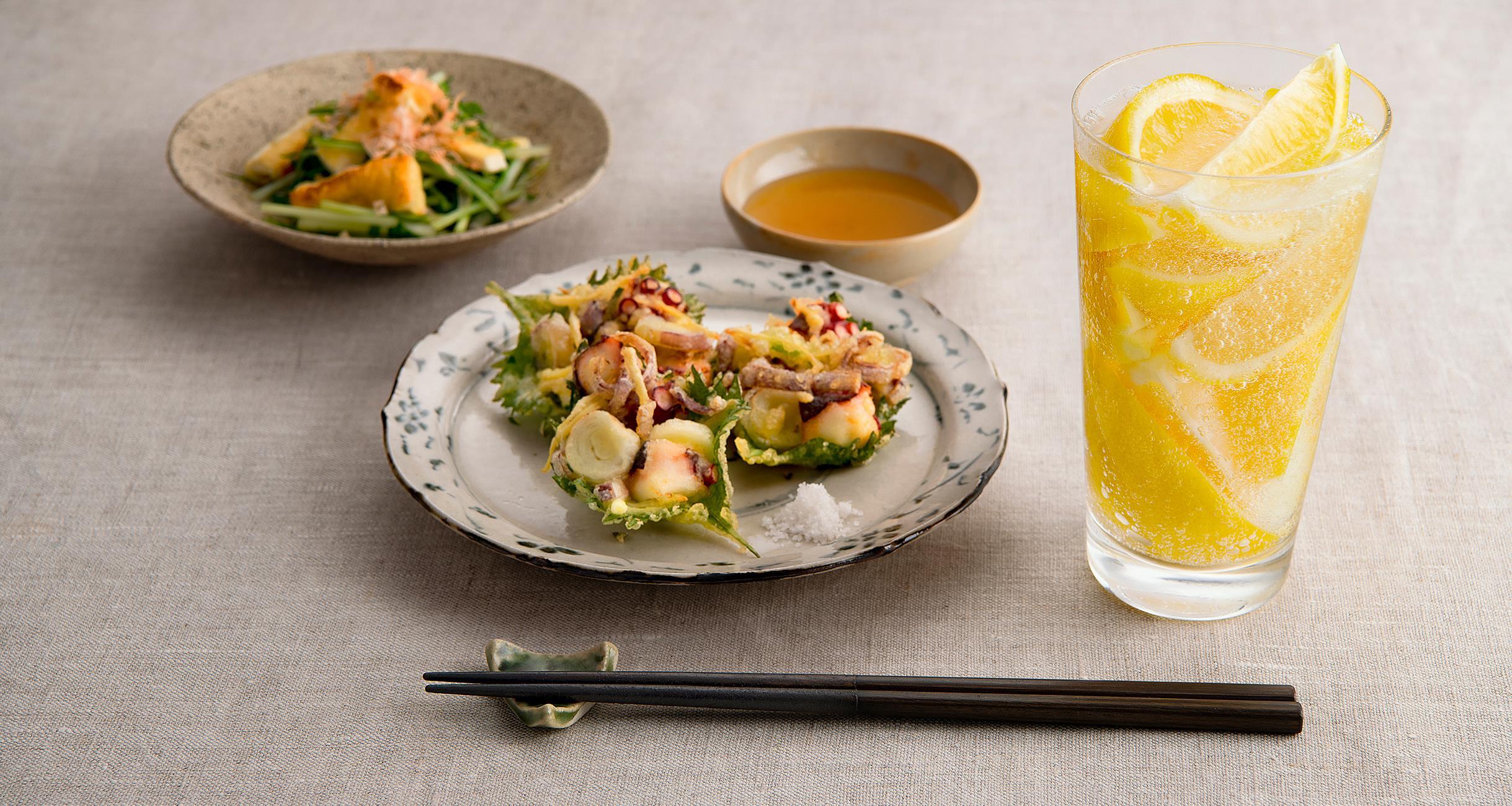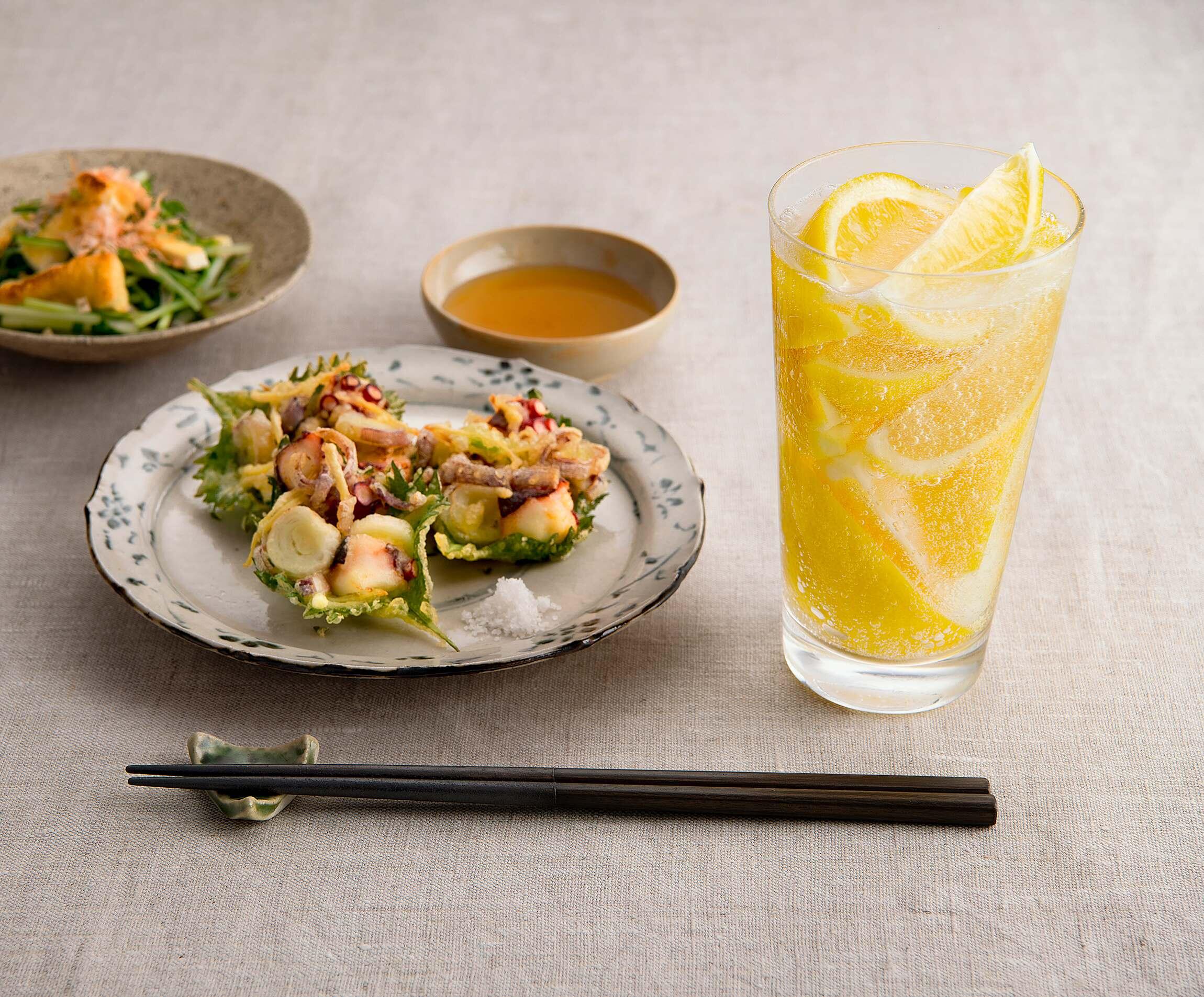 先日聞いた話によると、夏場はタコが旬を迎え、うまみが増すという。ならば、今日のメニューは、タコと香味野菜を使ったかき揚げに決めた。タコはぶつ切りにして食感を生かし、しそやみょうがなどを加えて、さっぱりと揚げて出来上がり。はやる気持ちを抑えて調理した熱々のかき揚げをさっそく一口。さらに、MAXレモレモンサワーを続けて一口。