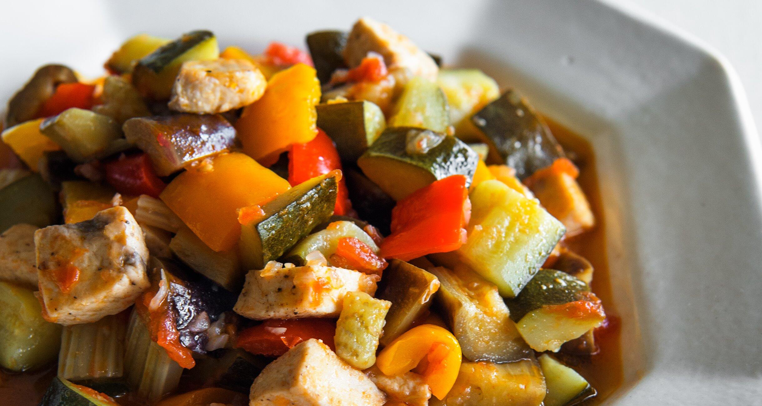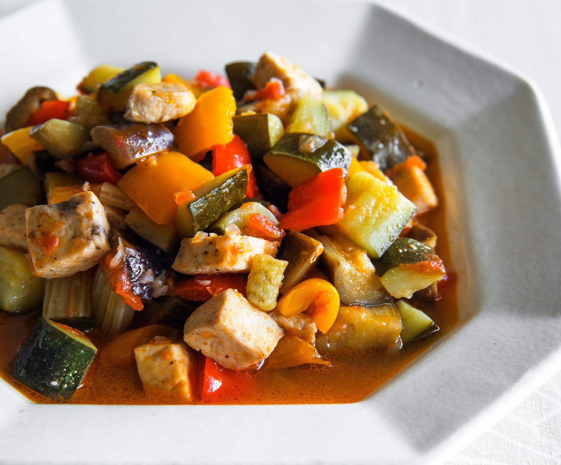 カラフルな夏野菜で元気いっぱい。塩で引き出された野菜の旨味が折り重なって深い味わいに。トマトの酸味で味をまとめるのがポイントです。めかじきをプラスしてボリュームアップ。