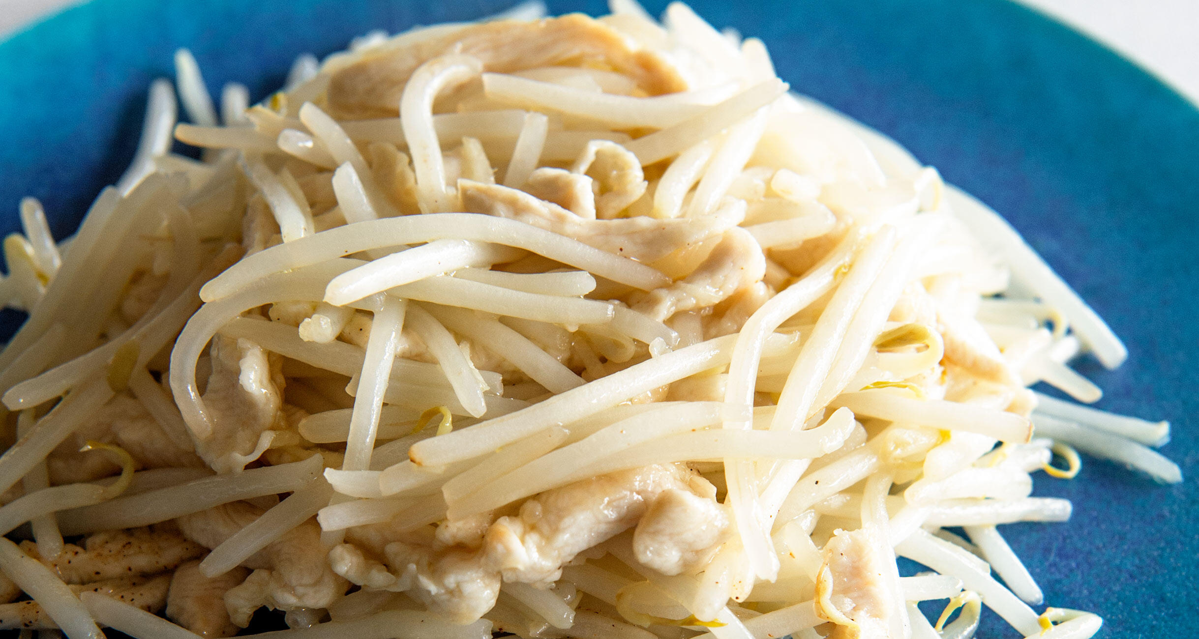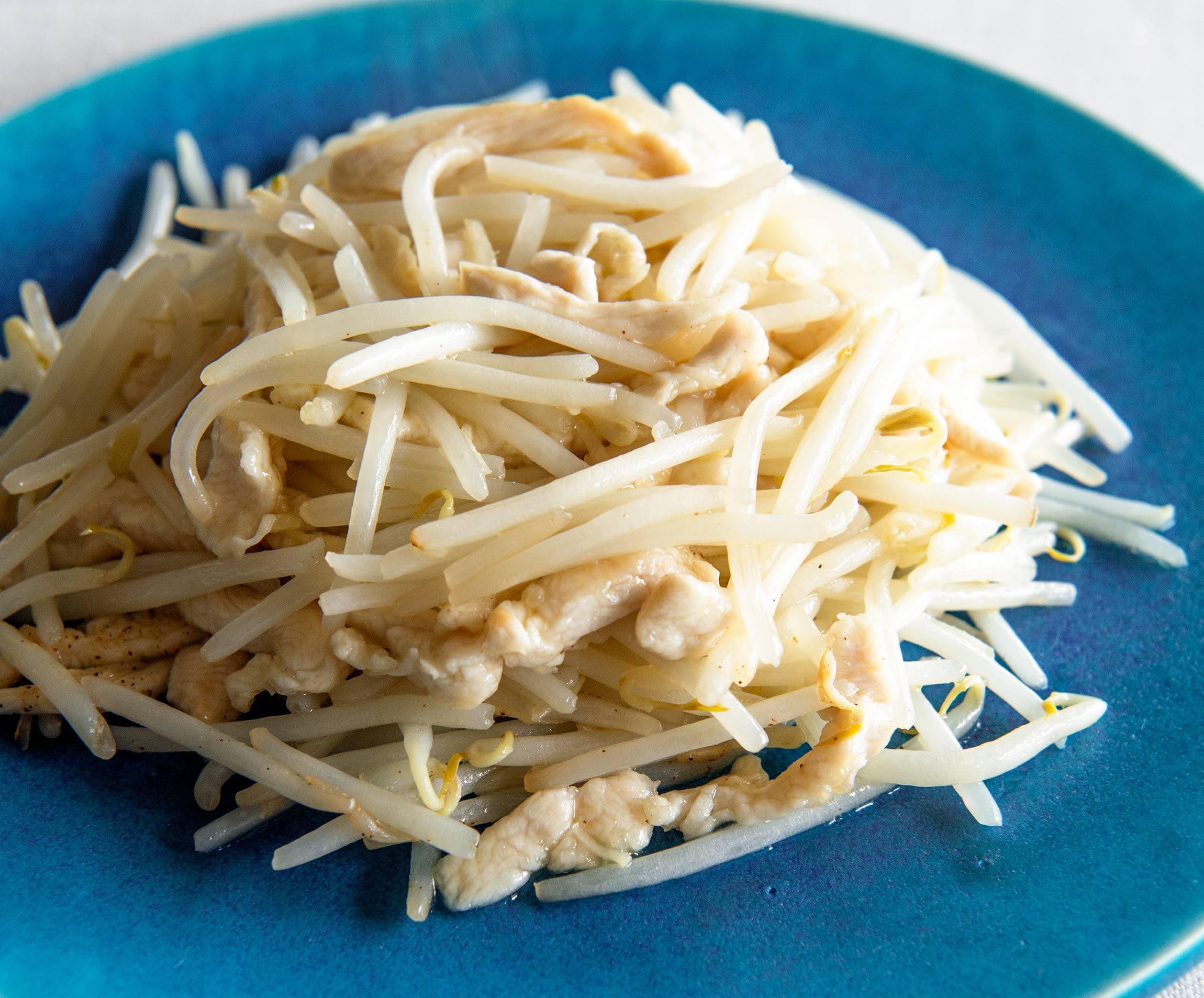 潔さが際立つ白いひと皿。もやしとささみを別々に炒めて手早く火を通すのがポイント。ささみに片栗粉をまぶして炒めると、ぷるんとジューシーに、そして味がしっかりなじみます。