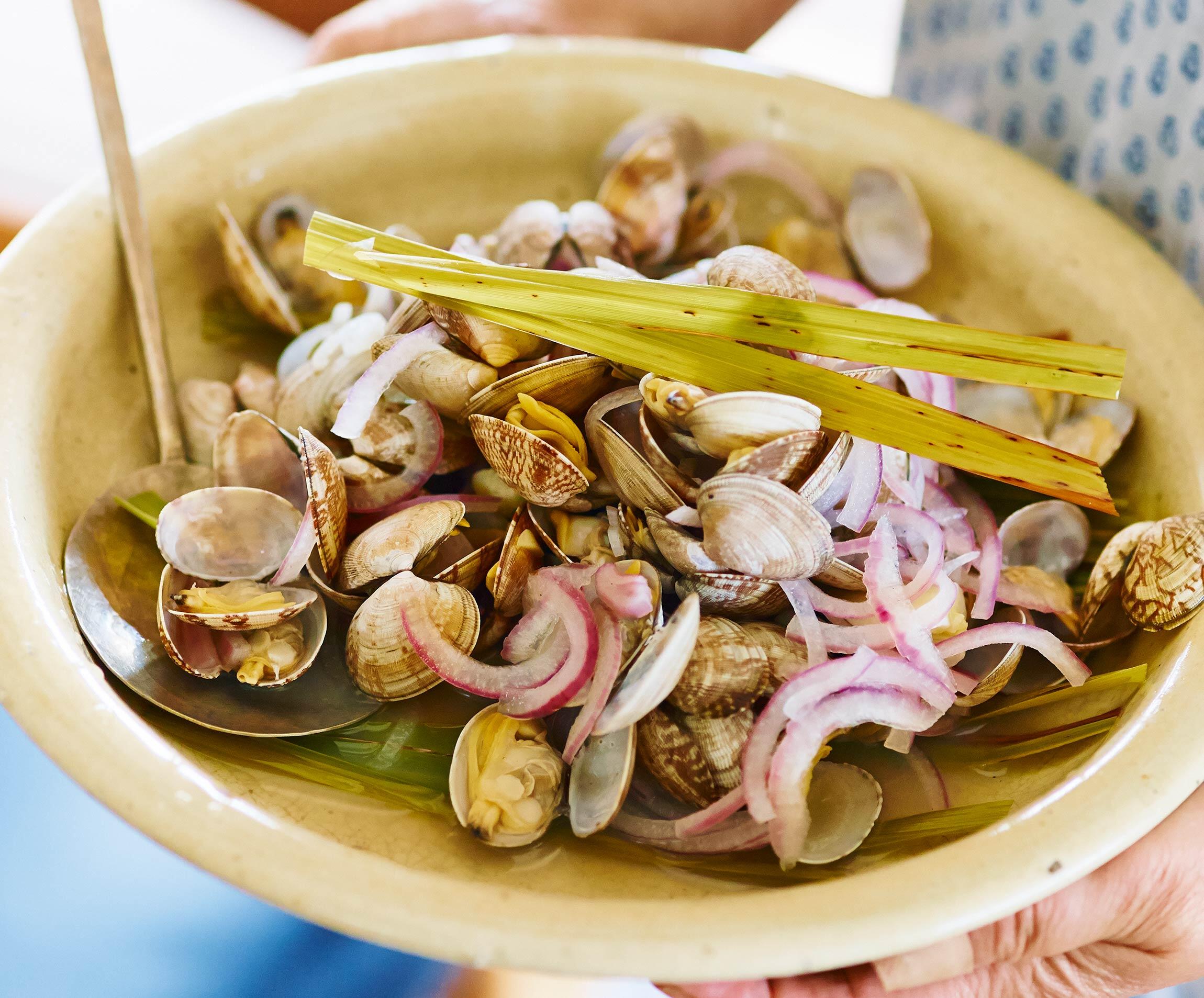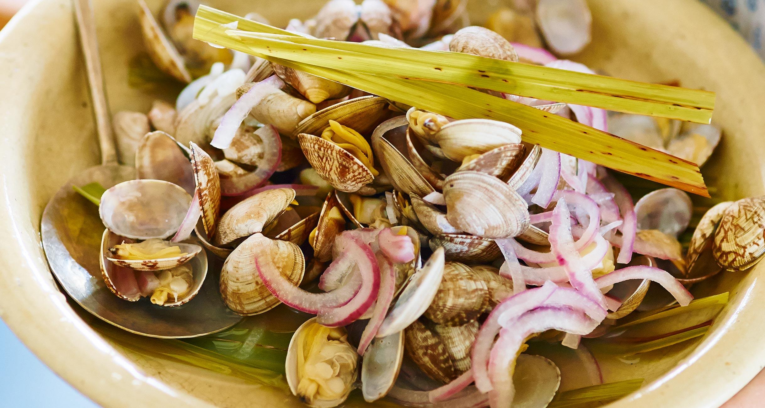 あさりの白ワイン蒸しはよくあるけれど、ここに清涼感のあるレモングラスを加えることで暑い日にもすっと胃に収まります。薬味は酒蒸しなら小ねぎですが、ここは赤玉ねぎのスライスを散らして。