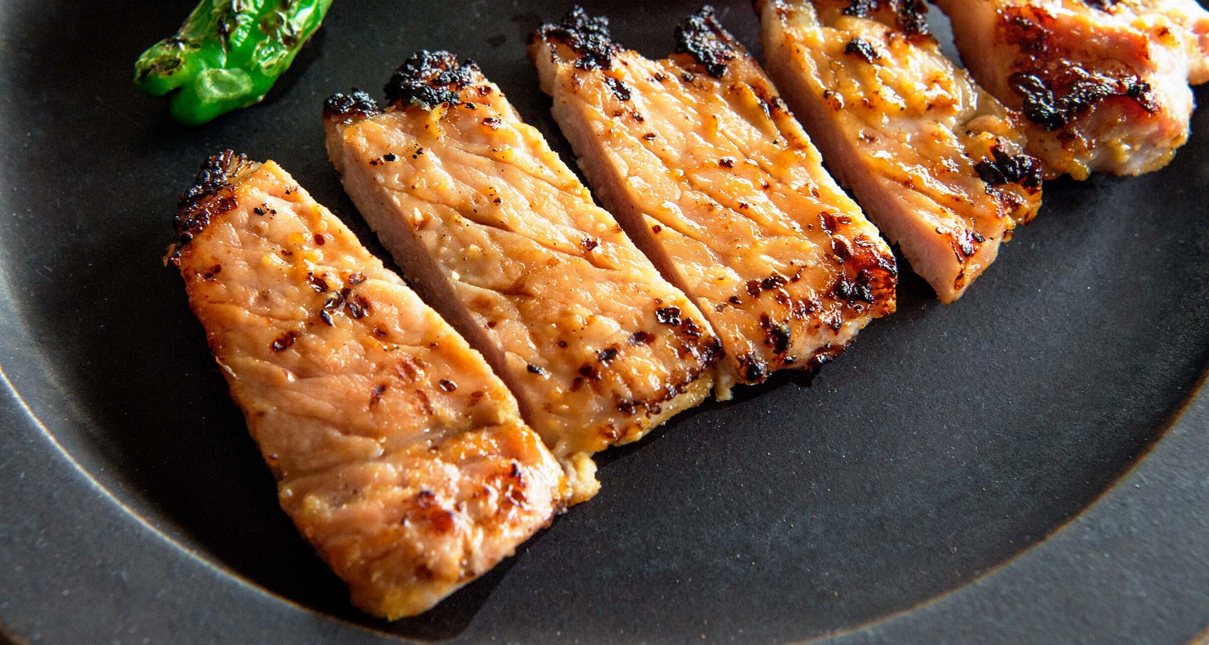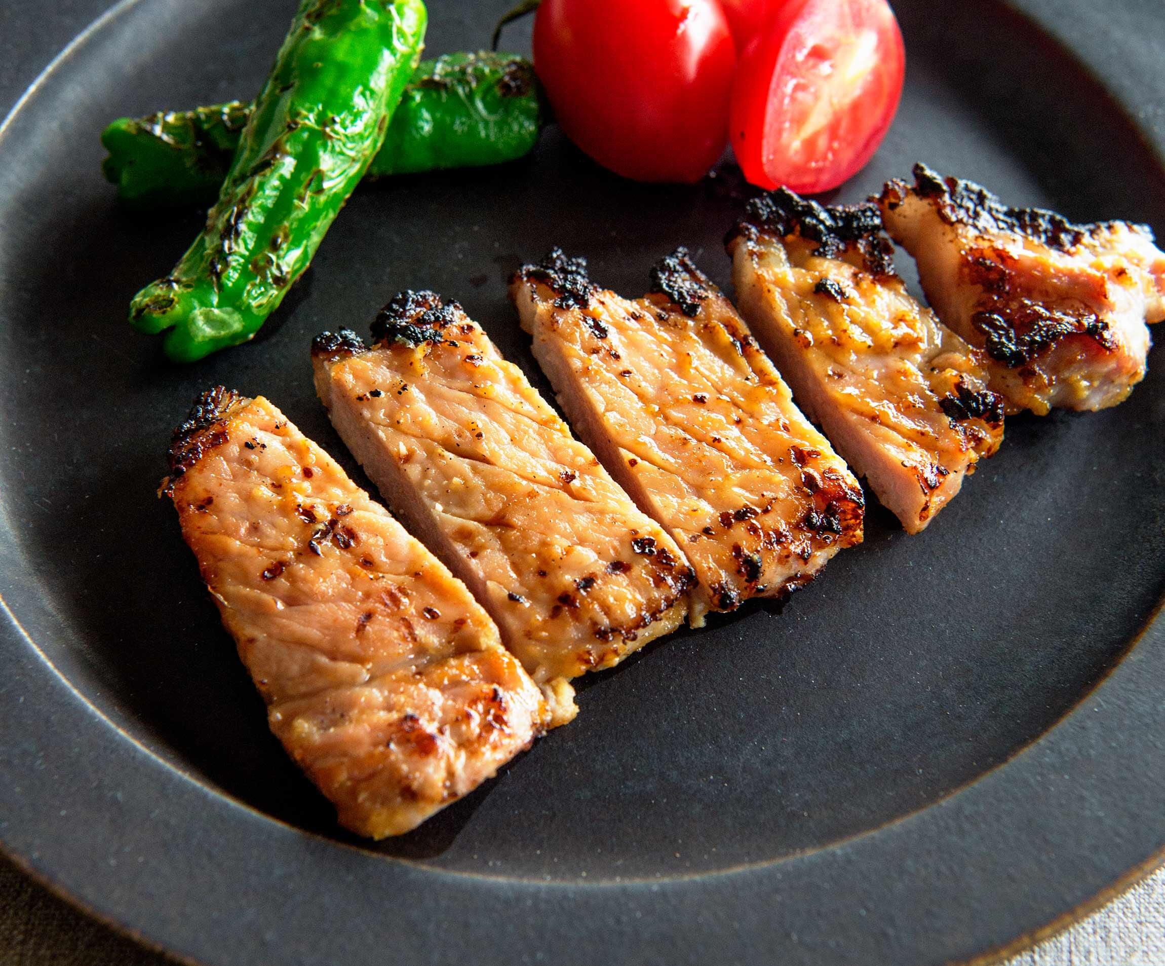 豚肉を冷蔵庫から出して、室温にもどし、味噌をゴムベラなどで取り除く。熱したグリルに並べてししとうをまわりに置き、12分ほど焼く。ししとうは途中で取り出す。