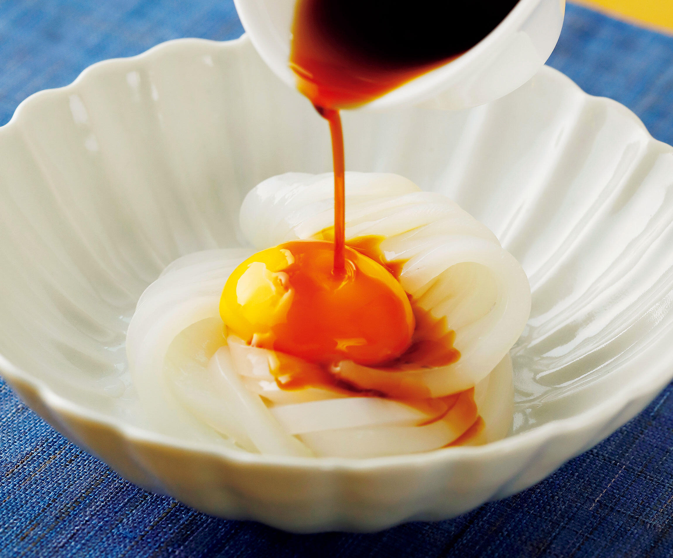 イカの刺し身をそうめん状に切って器に盛り、中心に卵黄をのせる。