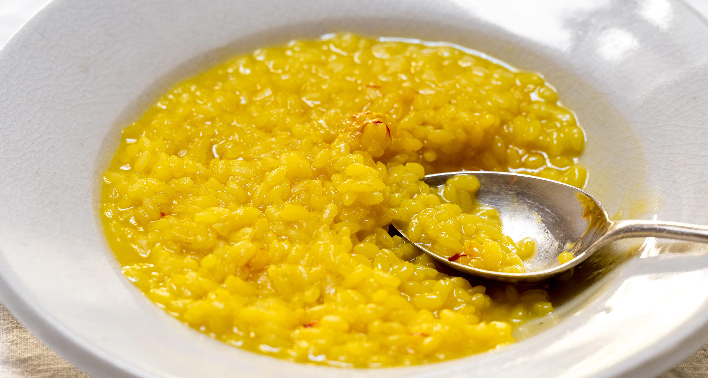 材料はシンプルながら、サフランの香りとだしの効いた、滋味深い旨味のあるリゾットです。サフランの黄色が鮮やかに食卓を彩ります。器と料理の組み合わせを提案する店「カモシカ」を主宰するオカズデザインさんに、器の紹介と、その器を引き立たせる、目にも舌にもおいしいレシピを教わりました。