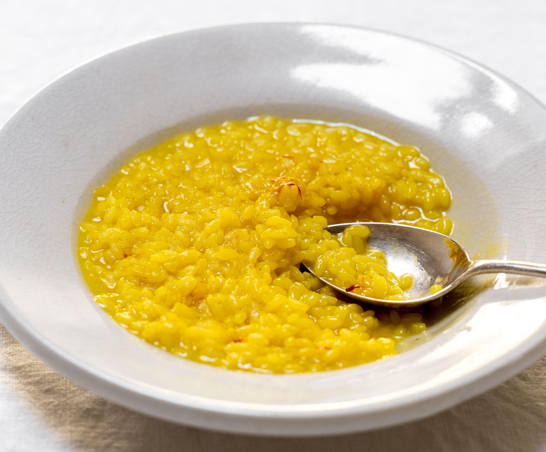 少ない材料だけど、思いっきり豊かな気持ちになれるディナーの献立。イタリアはミラノの代表的な料理であるサフランのリゾットは、米と玉ねぎ、サフランとスープストックというシンプルな材料でできるもの。サフランの匂い立つような美しい黄色が、伊藤環さんのぽってりと厚手の白い器によく映えます。
