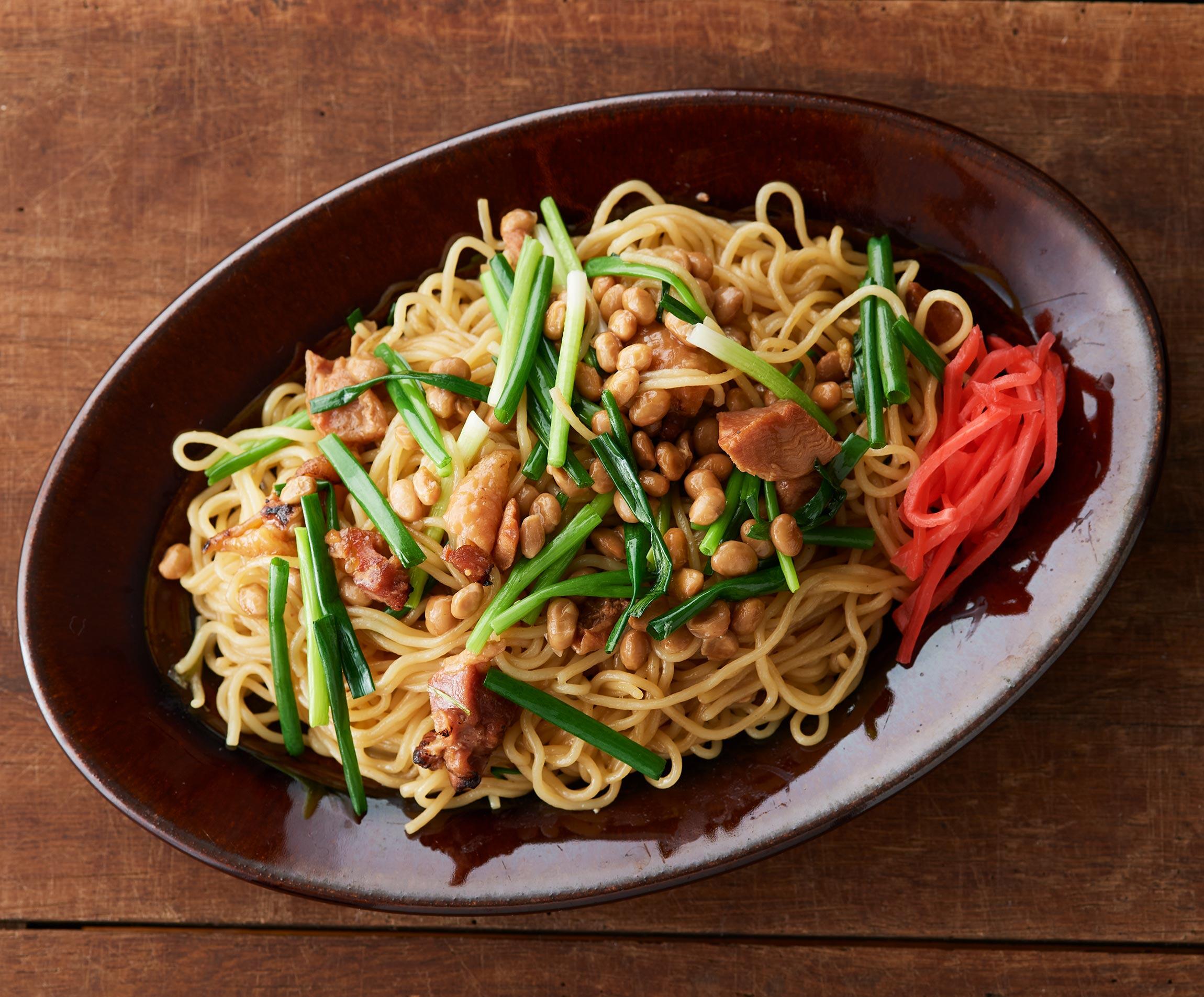フライパンに胡麻油を中火で熱し、2の焼きそば麺をほぐしながら炒める。焼き鳥、納豆、細ねぎ、Aを加え、汁気がとび、ねぎがしんなりするまで炒める。