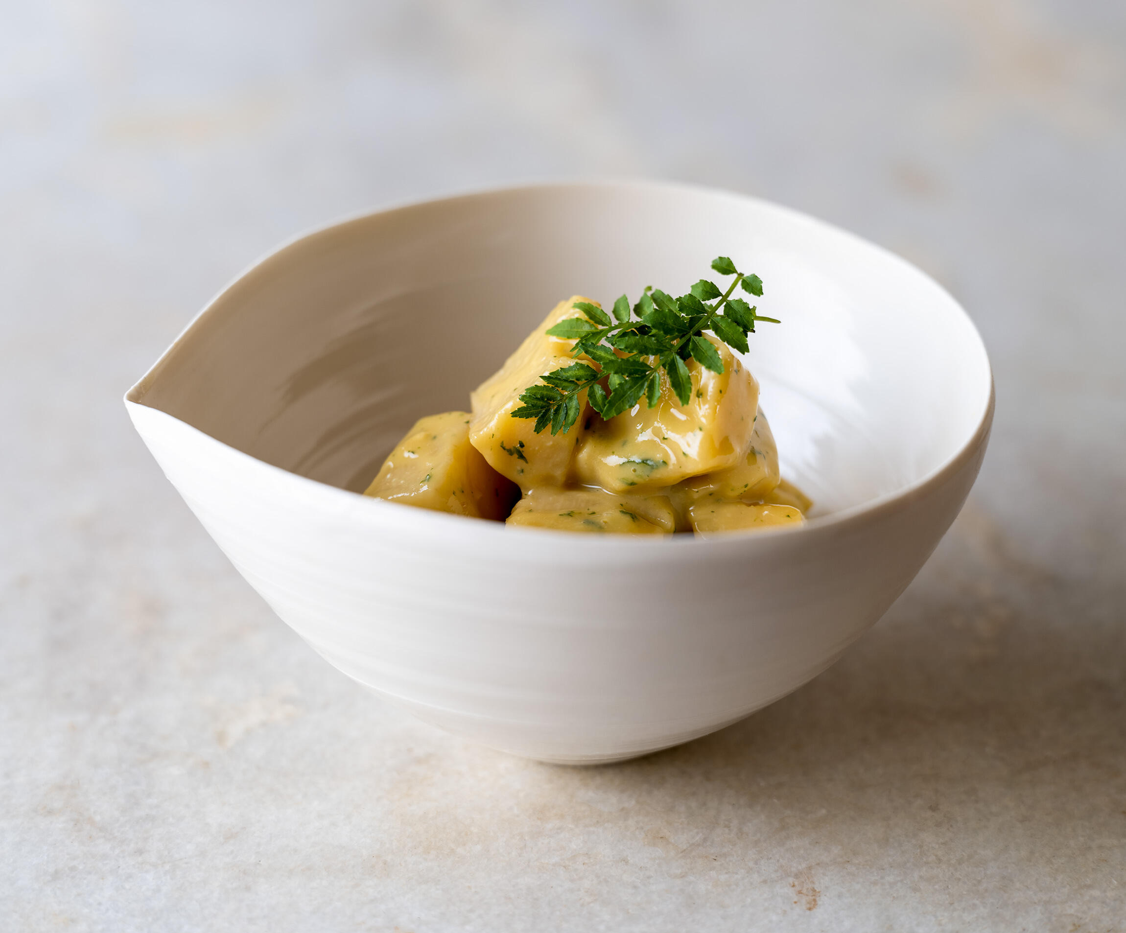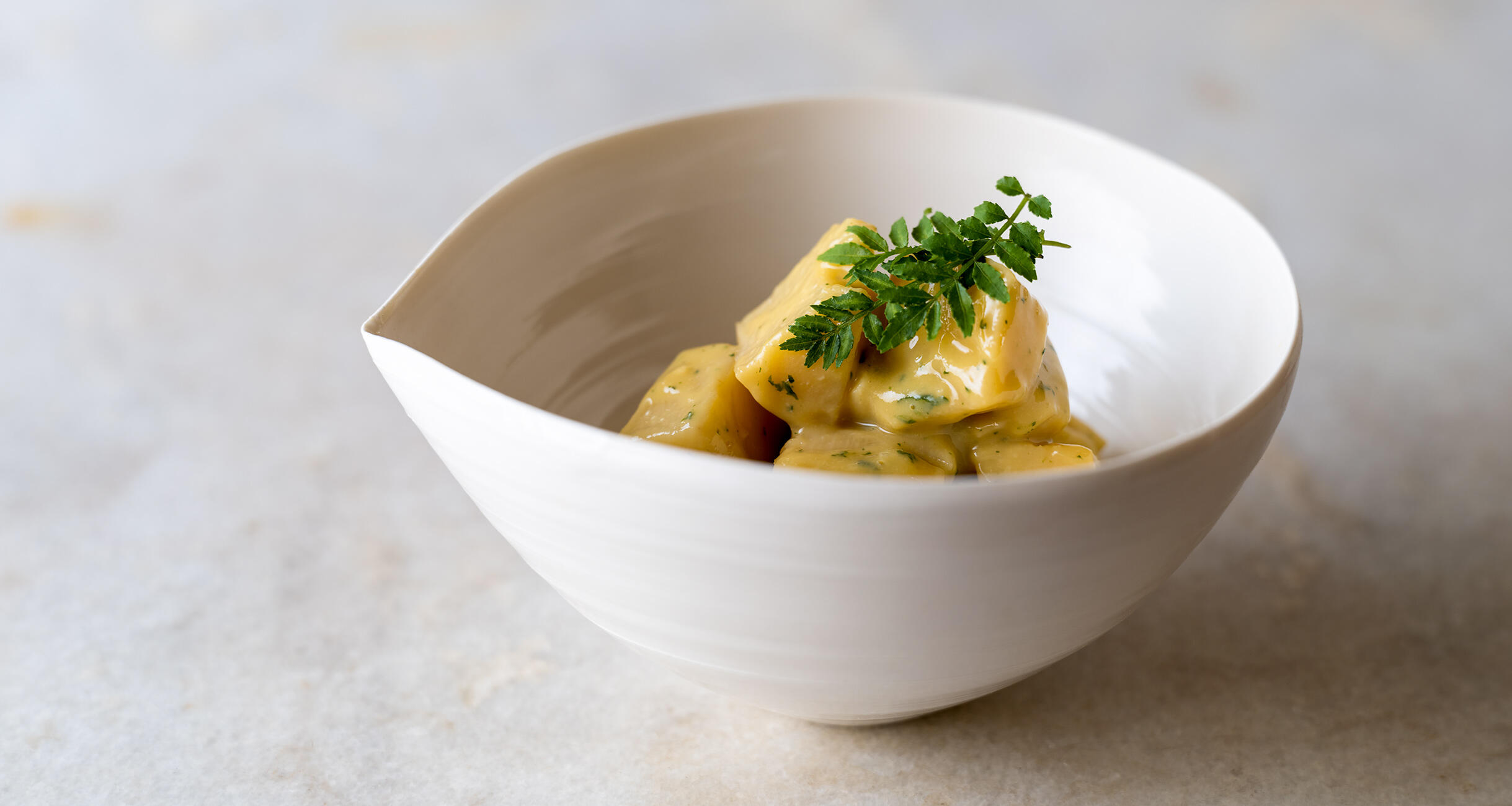 春の味覚を存分に味わえる一品。水煮した筍を使う場合は、たっぷりの湯に入れて煮立ってから約30秒ゆでるという下ごしらえをしておくと、独特の臭みもなく、すっきりした味に。合わせだしで煮浸しにし、乾煎りしてから木の芽味噌で和えますが、木の芽はできれば摘みたてをたっぷりと使うと風味が格段に上がります。だしに浸して半日、和えてから一晩ねかせることもポイント。平らな皿より深さのある鉢のほうが盛りやすく、片口だと流れができるので、よりバランスがとりやすいはず。