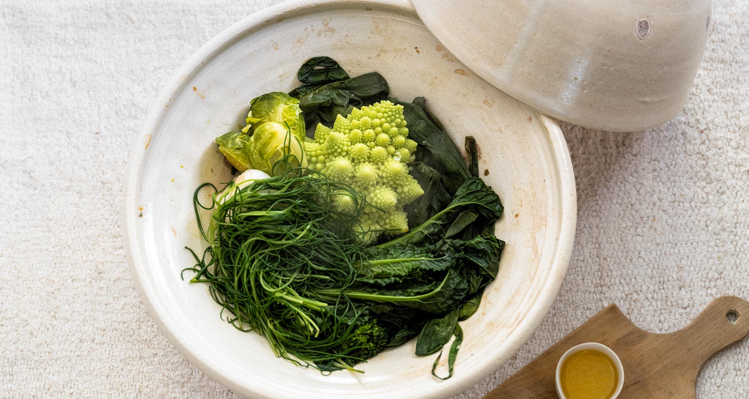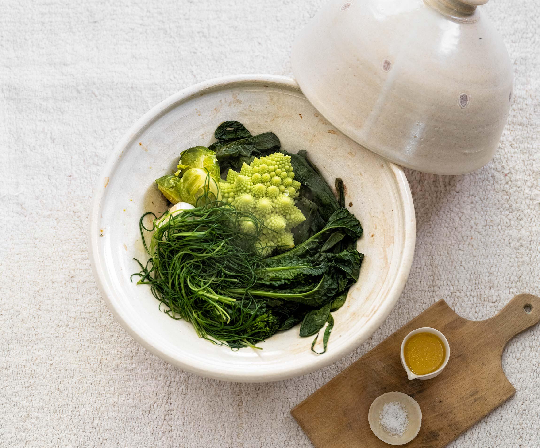 同じ耐火鍋ですが、市川孝さんの蒸し鍋は、見るからに温かな風合い。保温性のよい厚手の鍋に蒸し皿がセットになっていて、おかひじき、芽キャベツ、ロマネスコ、ケールなどをのせて火にかけます。タジン鍋のように背が高い蓋は、蒸気が対流するのでじんわりと効率よく加熱することができるのです。じんわりと加熱された野菜は、本来の甘さや旨味が引き出されて抜群のおいしさに。ワインビネガーとはちみつ、柑橘果汁を合わせたソースや、オリーブオイル、塩でいただきます。今回は完熟のシークヮーサーを使ったら、なんとも爽やかなおいしさになりました。