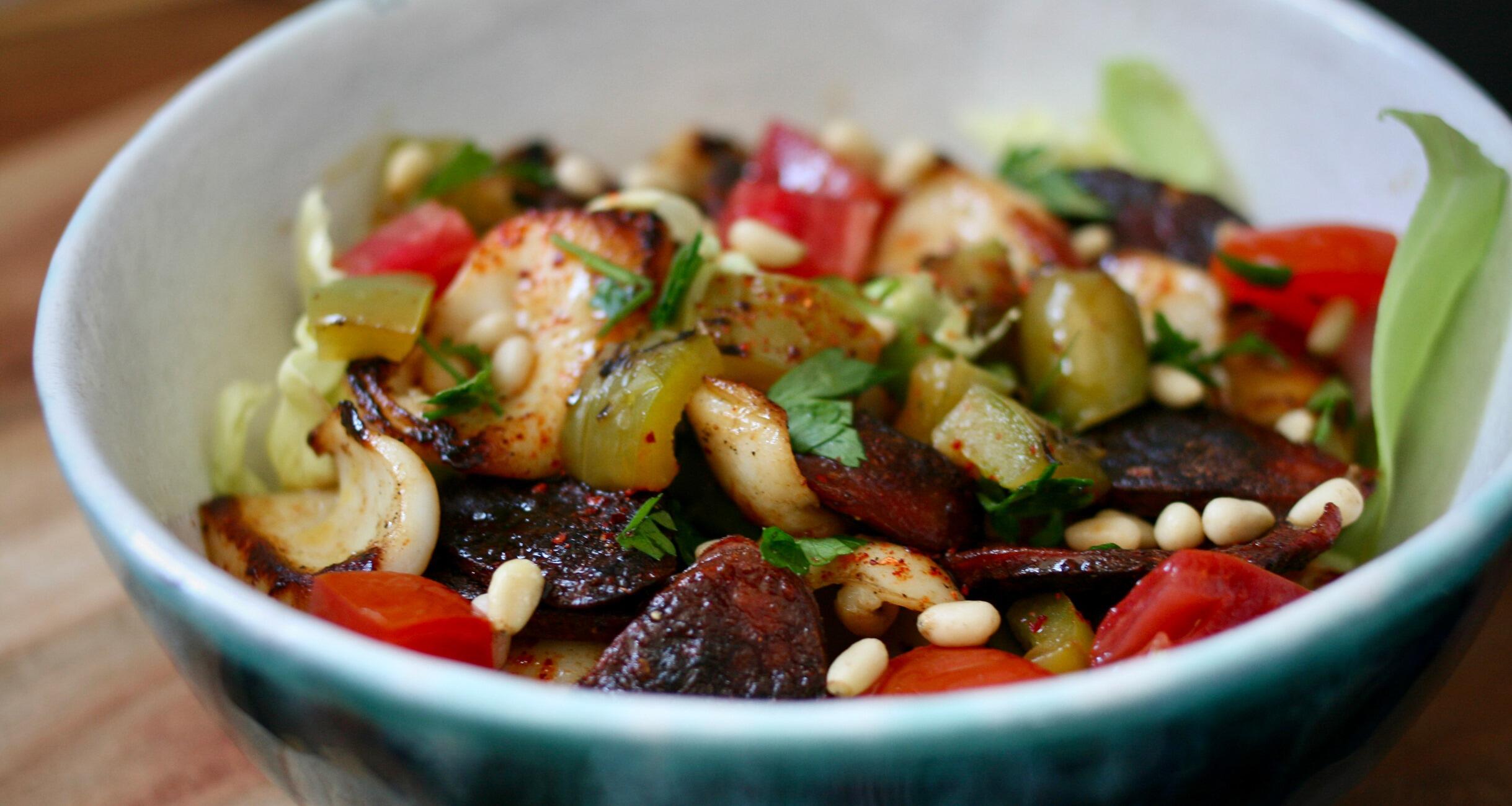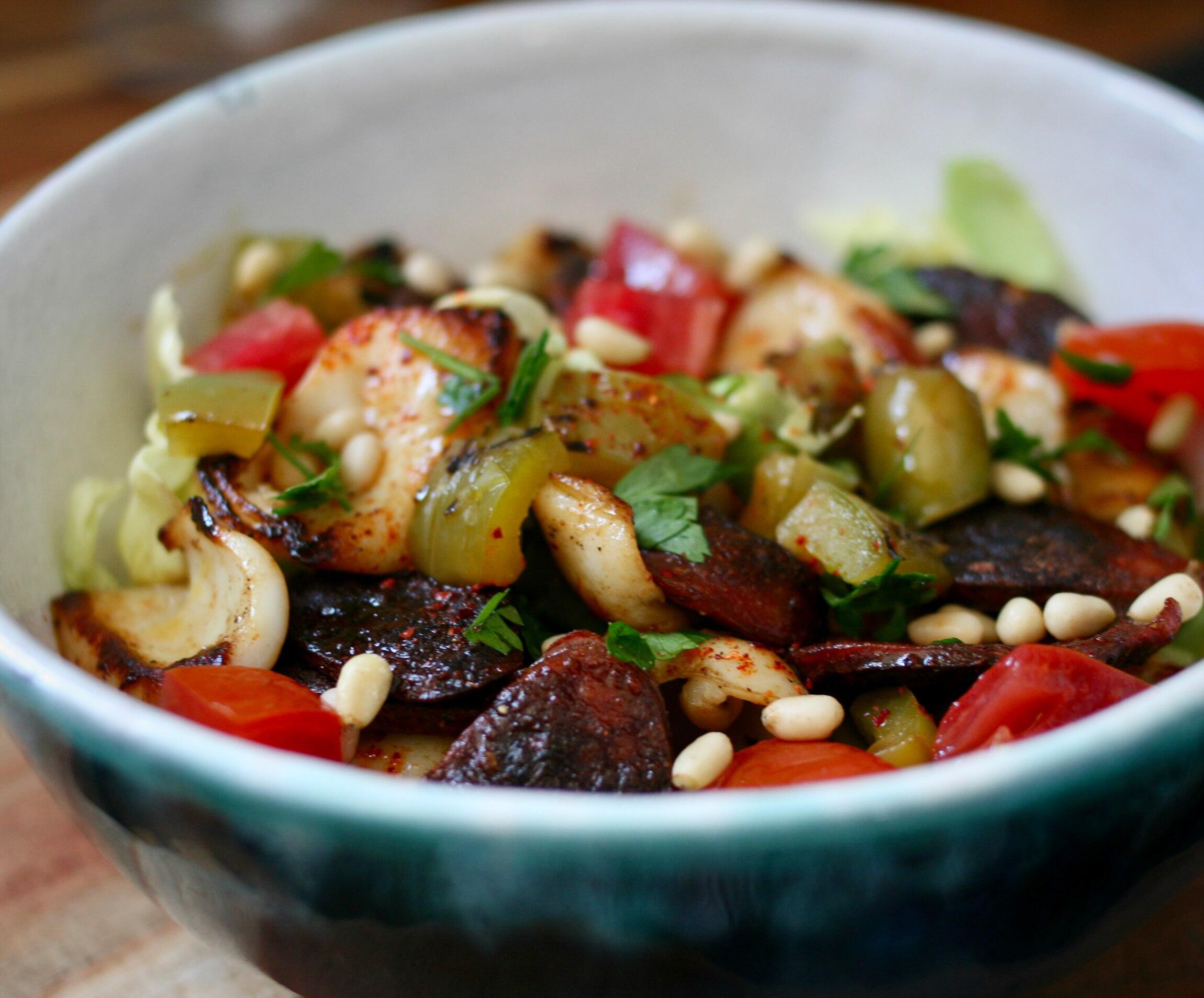 深皿にサラダ菜を敷き、小さく切ったピーマンのマリネ、イカ、チョリソ、トマトなどをのせ、最後にフライパンで炒った松の実とエスプレッド唐辛子、パセリを散らして完成となる。