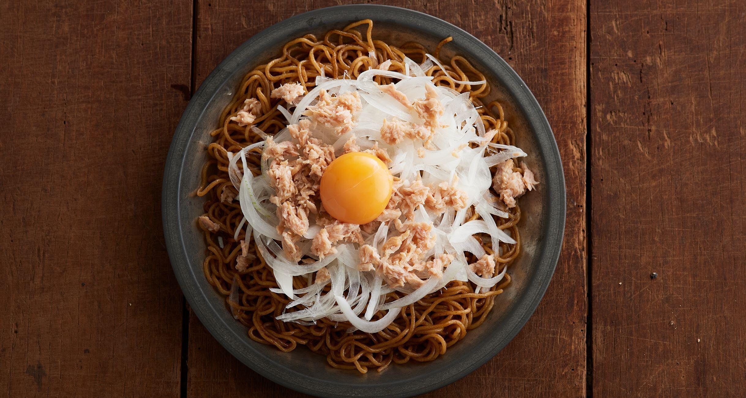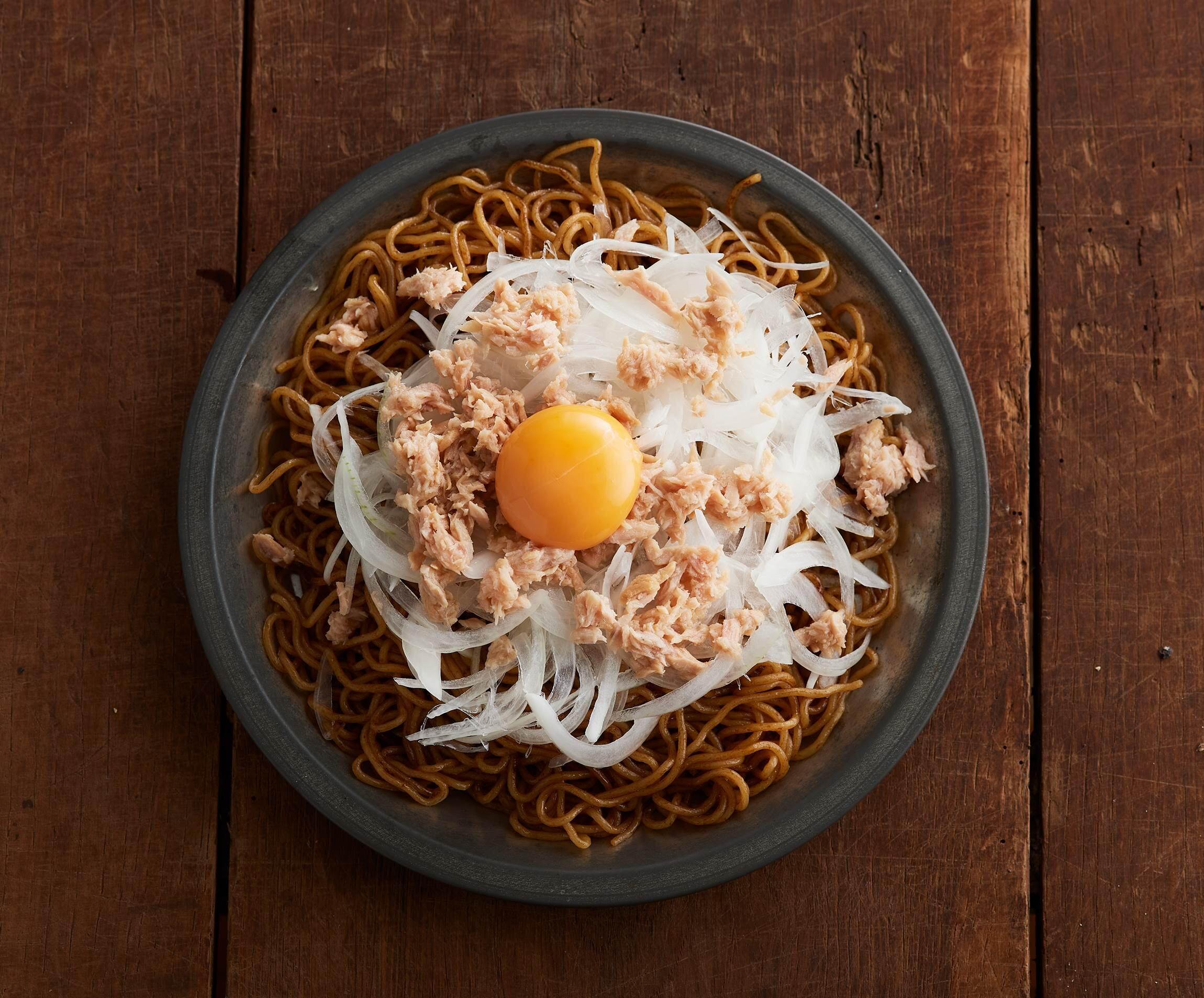 具は炒めずに麺にのせ、食べる直前にガーッと混ぜます。ツナの旨味、みずみずしい玉ねぎ、とろ~り卵黄と麺が一体化して、いつもの焼きそばとはひと味もふた味も違ったおいしさに!