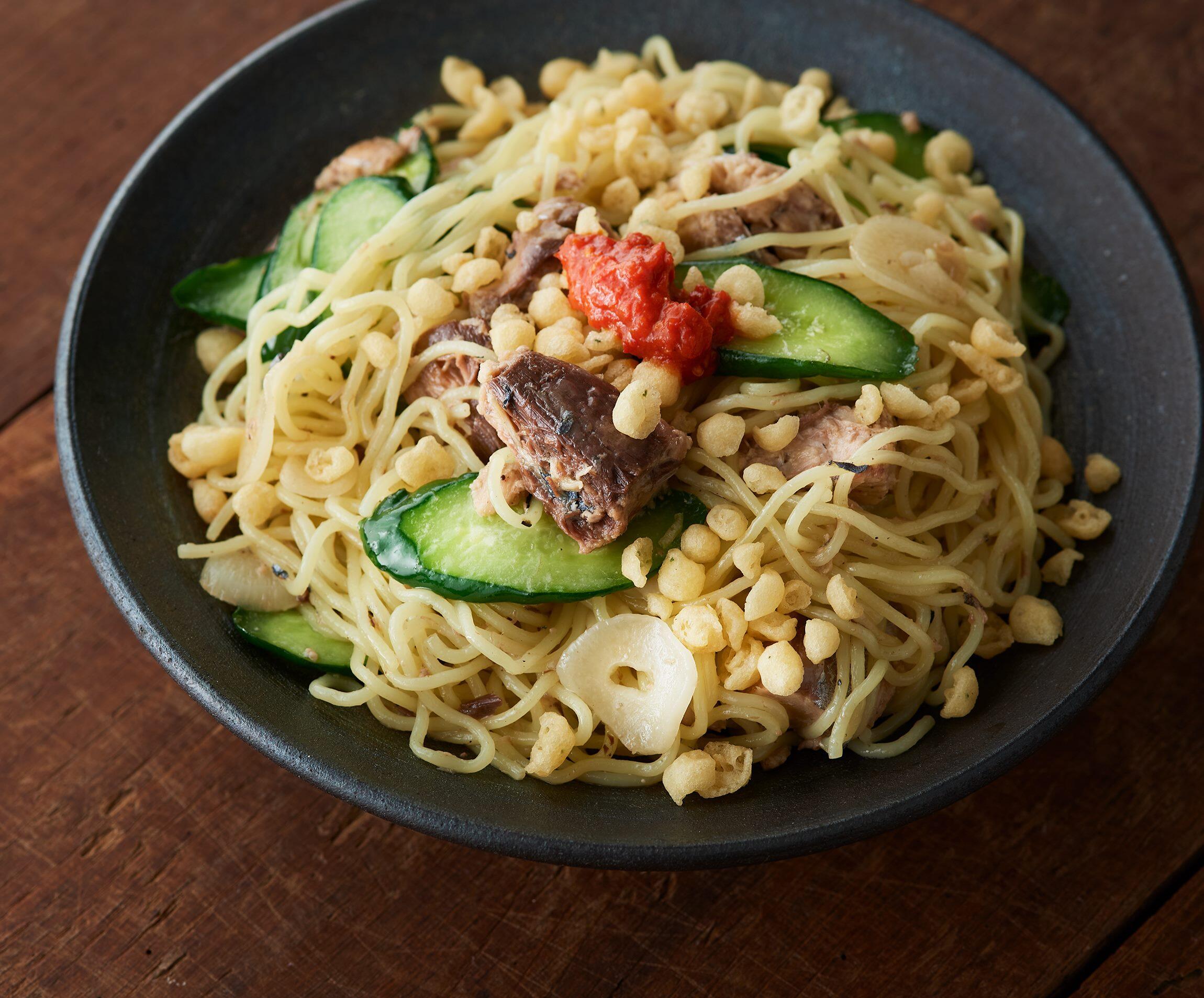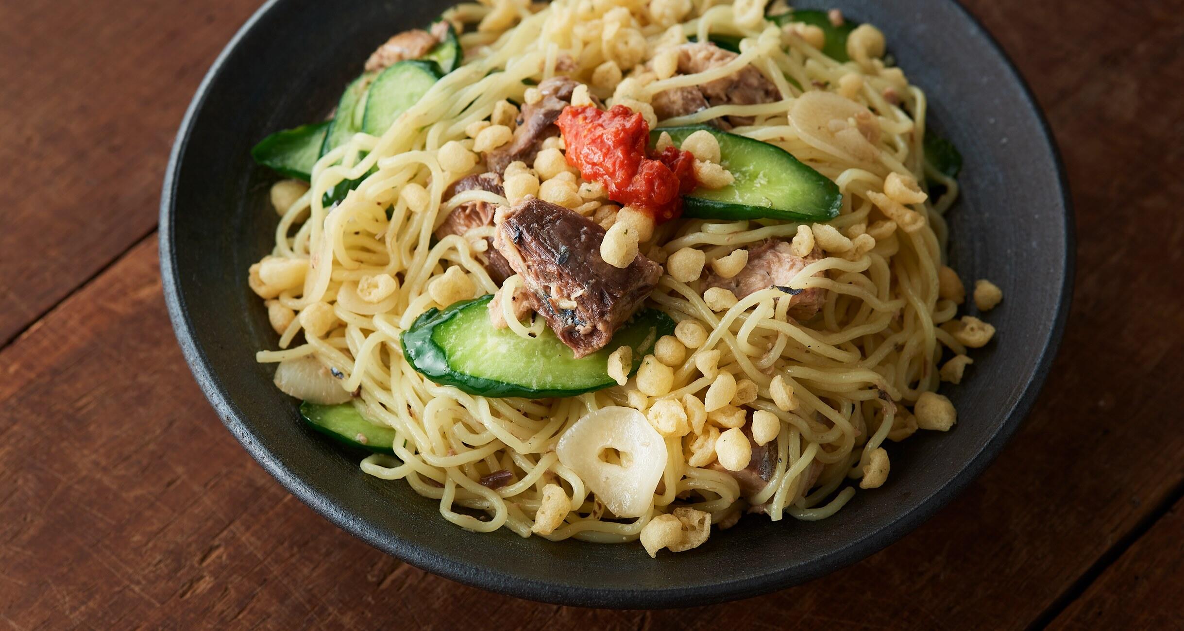 清涼感溢れるきゅうりがシャキシャキと食感よく、サバの旨味を引き立てる豆板醤とにんにくが効いてます!具もたっぷりで、満足感ある焼きそばです。今回は「料理するモチベーションがイマイチのときに助けてくれる存在」と、缶詰に絶大な信頼を寄せる料理研究家のきじまりゅうたさんに、さっとつくれる缶詰を使った簡単レシピを習いました。