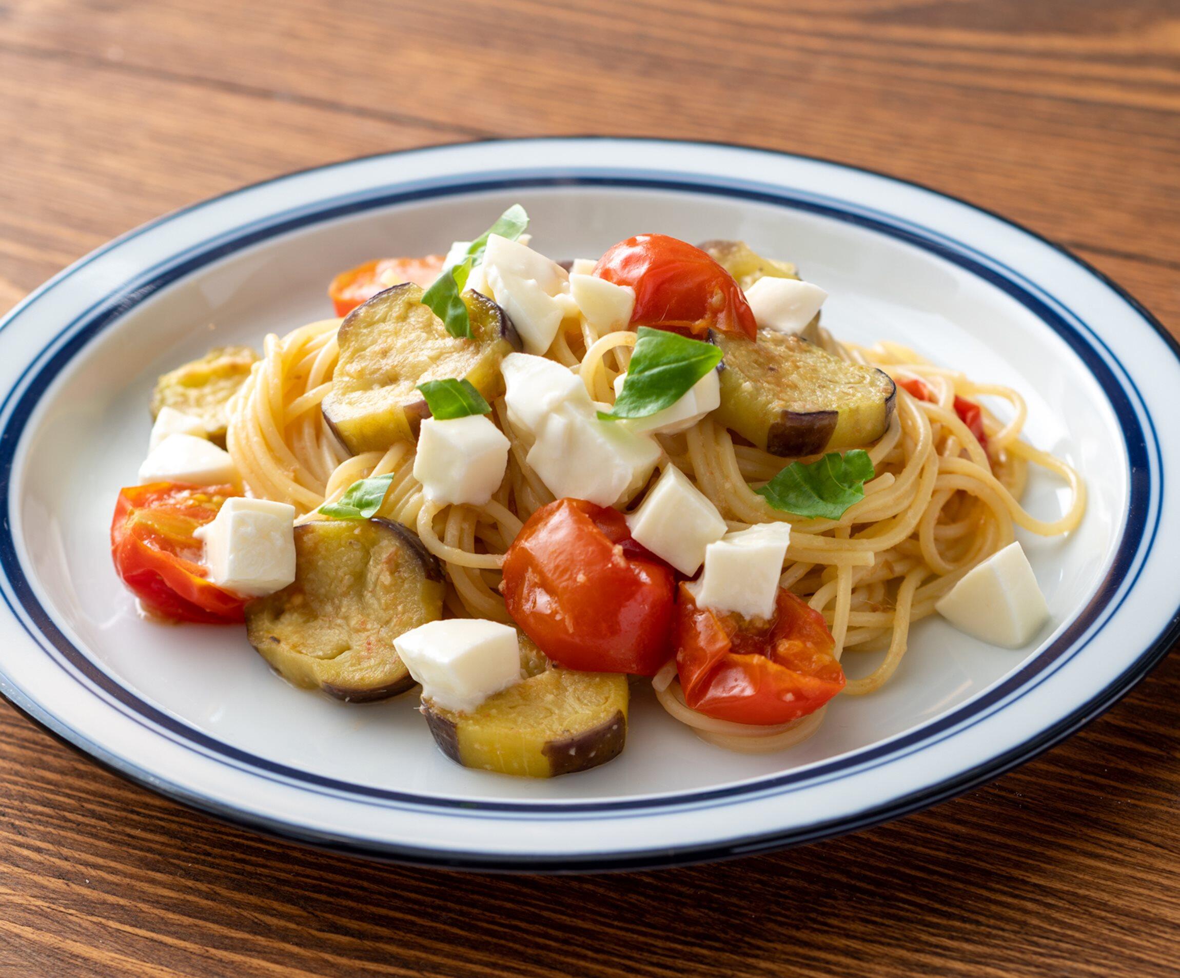 暑い日が続くと、しっかり食べなきゃと思いつつ、簡単にパスタで済ませちゃう日も多い。そんな時は、具のあるパスタで見た目から楽しくというのが良い。赤いミニトマトの酸味と、黒い茄子の旨味を、白いチーズのミルキーな甘さがぐいっとまとめてくれます。