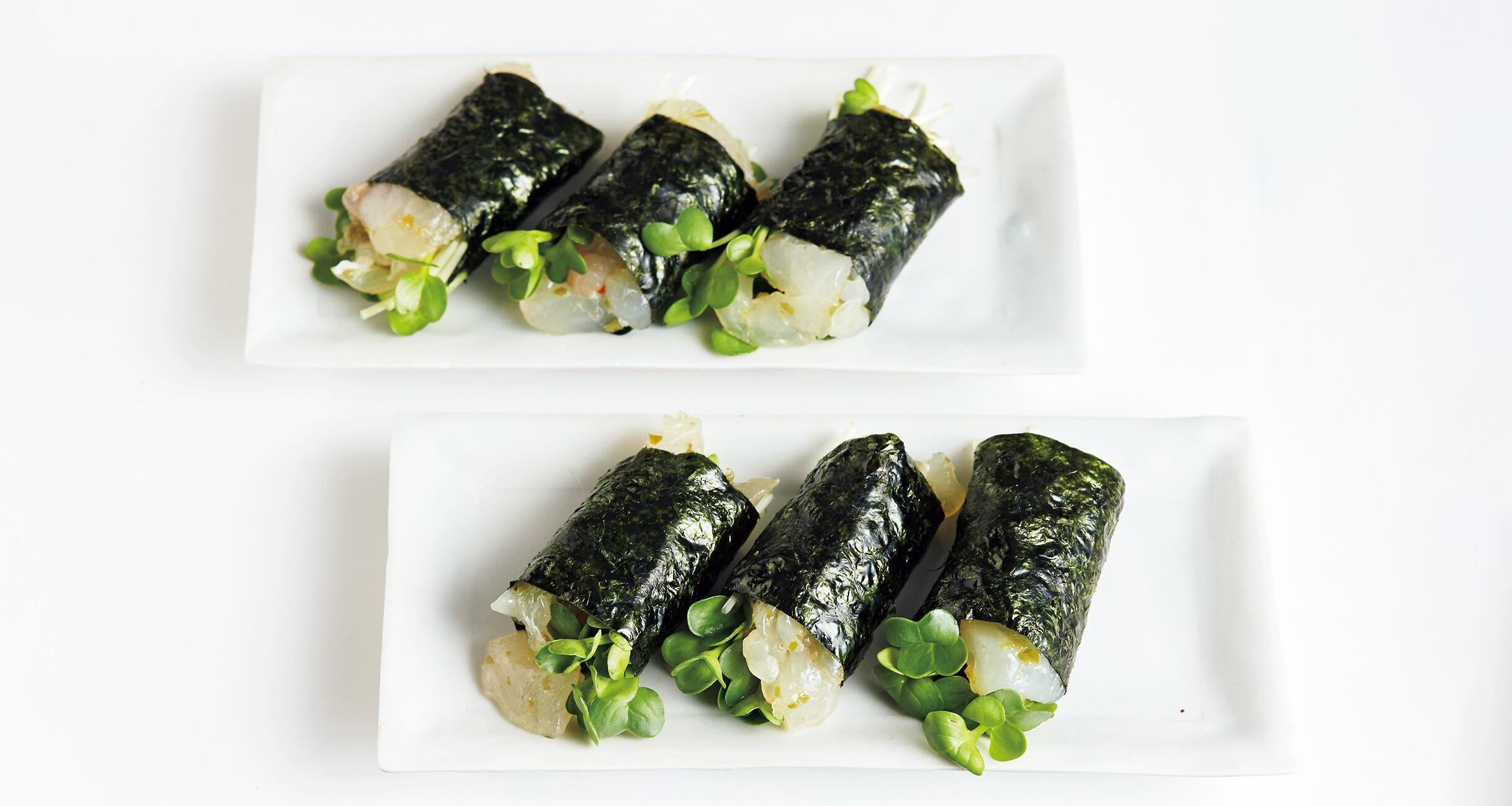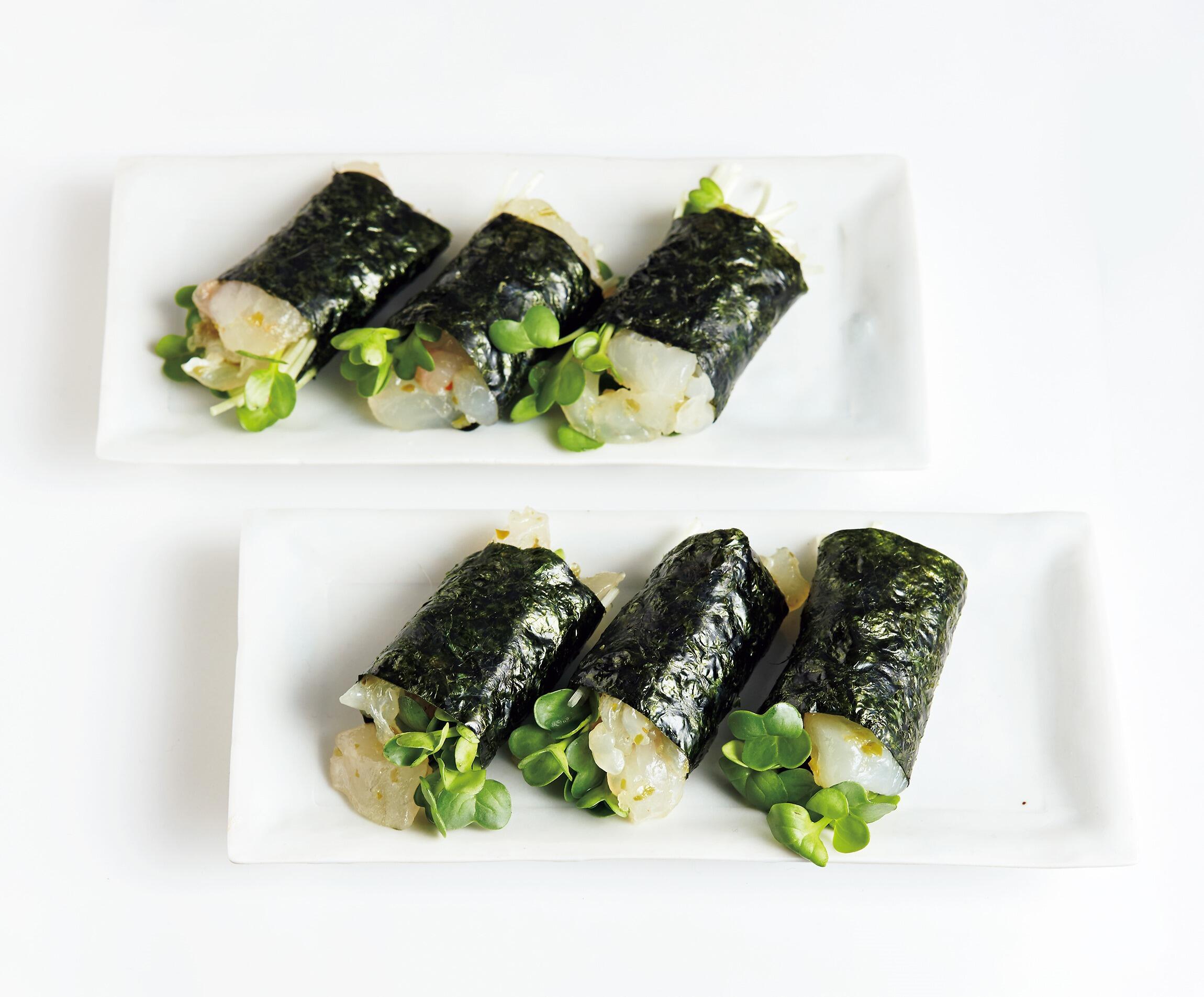 海苔は6等分の帯状に切り、白身魚、貝割れ菜をのせてくるりと巻く。