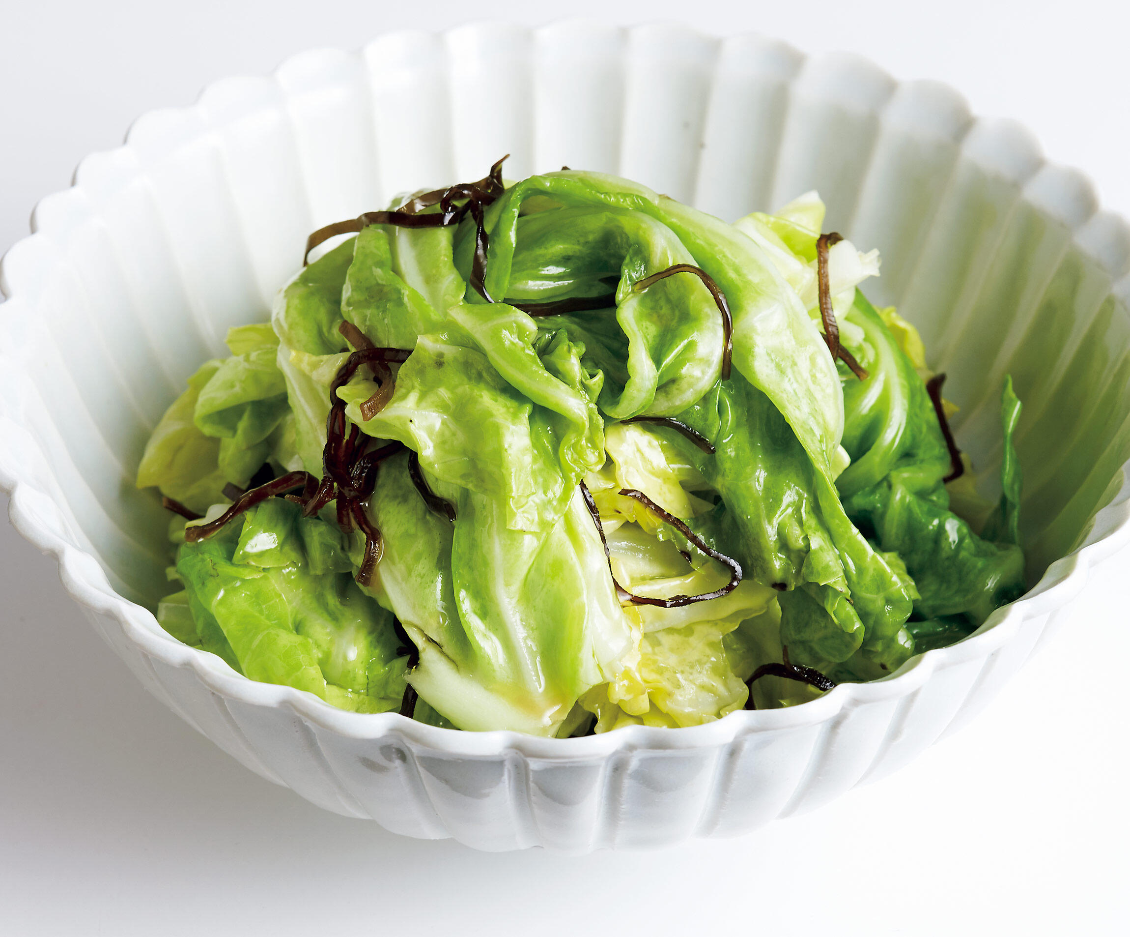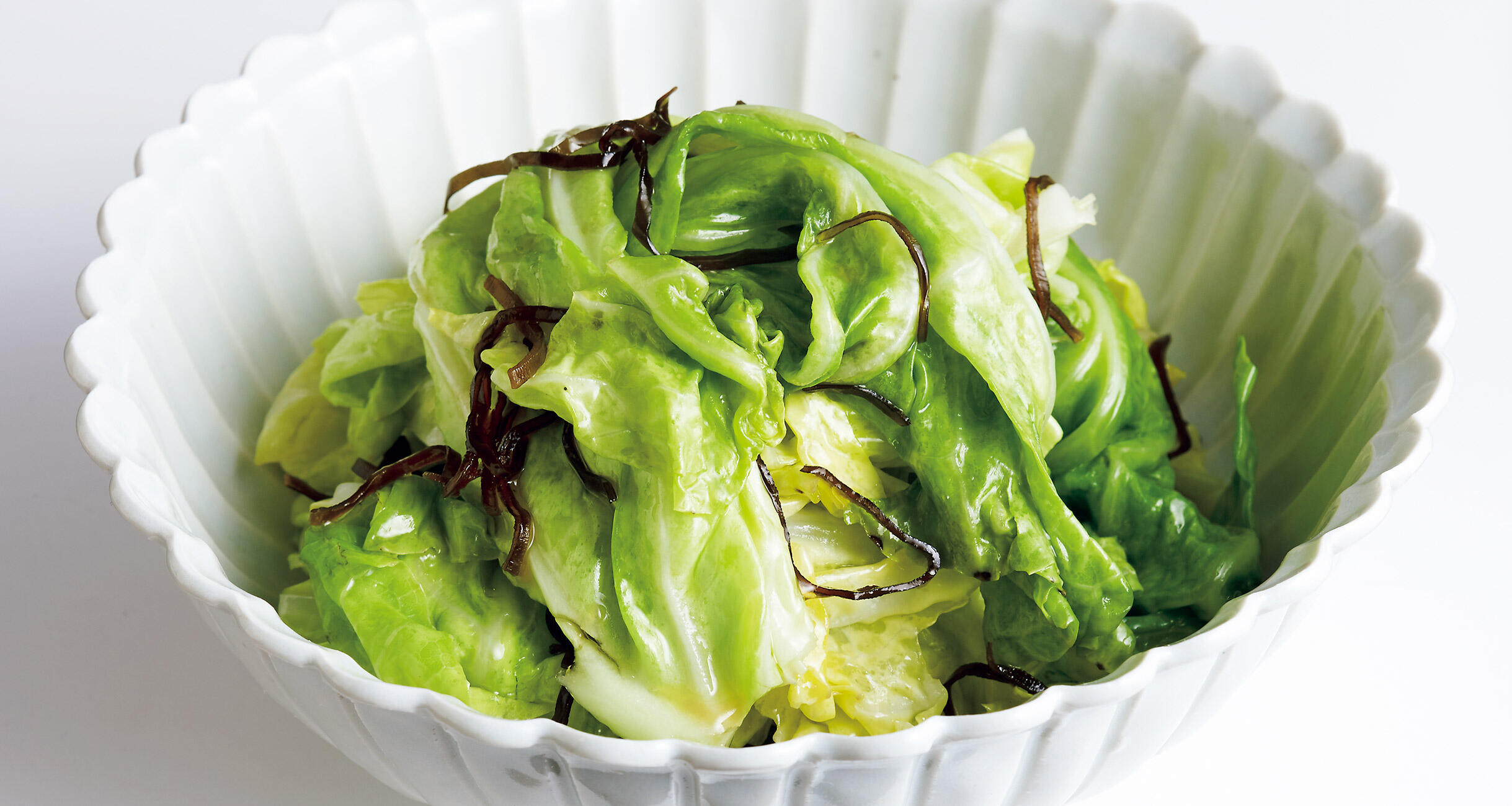 キャベツは手で大きくちぎりながら耐熱のボウルに入れ、塩昆布も加える。