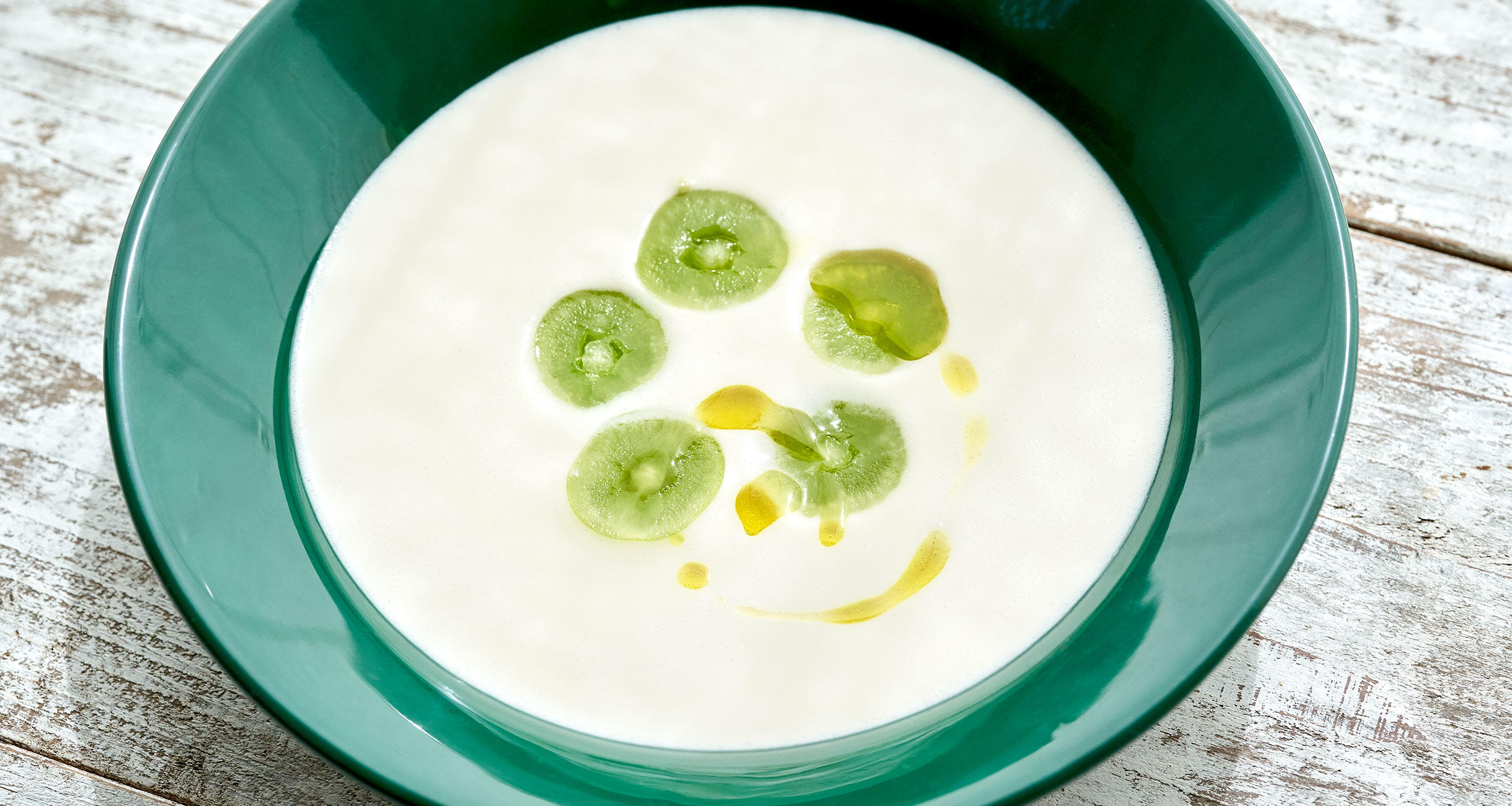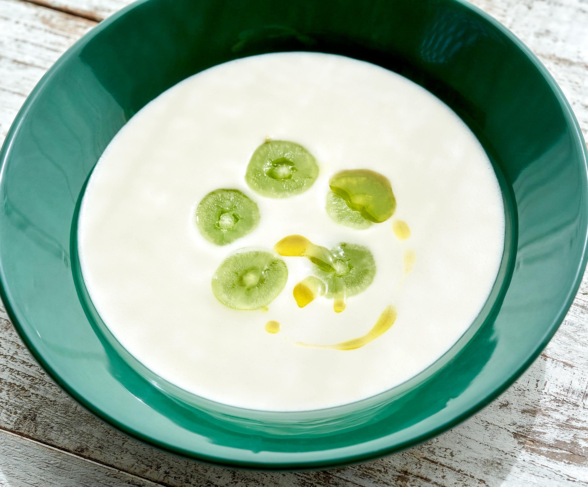 「白いガスパチョ」と聞くと、亜流に聞こえるかもしれない。だがこれ、アンダルシア地方では、定番のガスパチョのひとつ。白さはアーモンドパウダーによるもの。スペインのマルコナ種を使うと、深みのあるまろやかな味に仕上がる。なめらかながら、にんにくの風味がきいたパンチのある味わい。