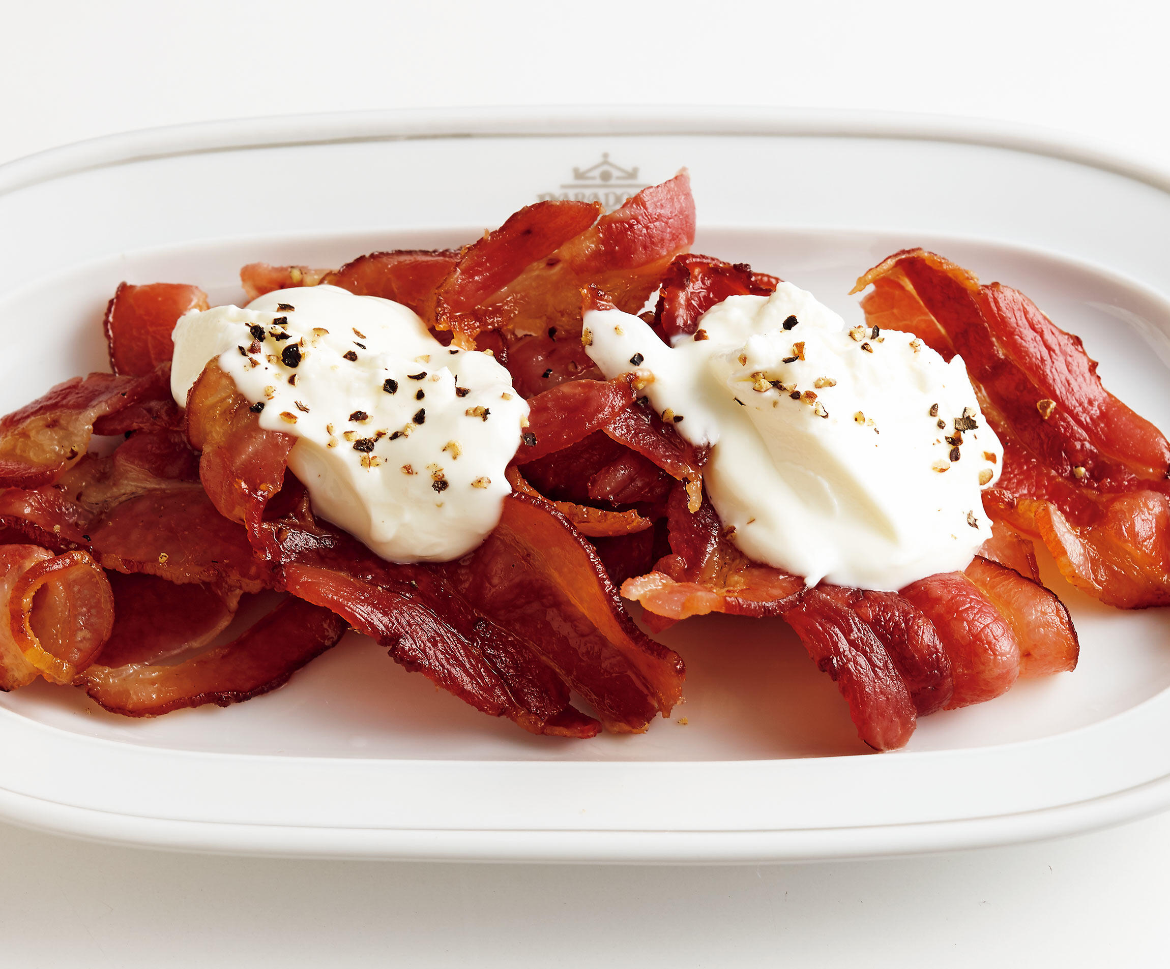 ベーコンの粗熱が取れたら長さを2~3等分にちぎり、器に盛ってサワークリームをかけ、粗挽き黒胡椒をふる。