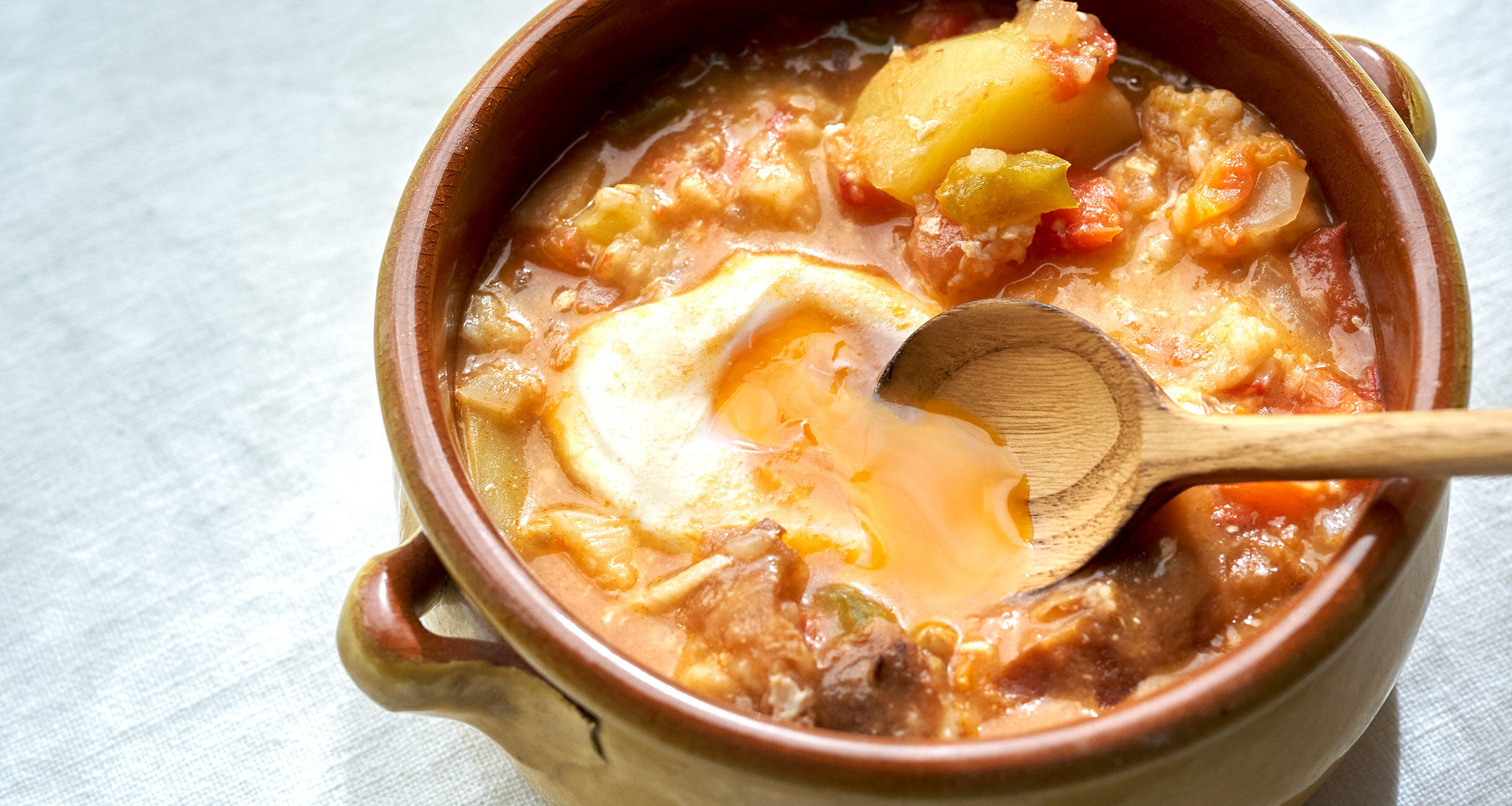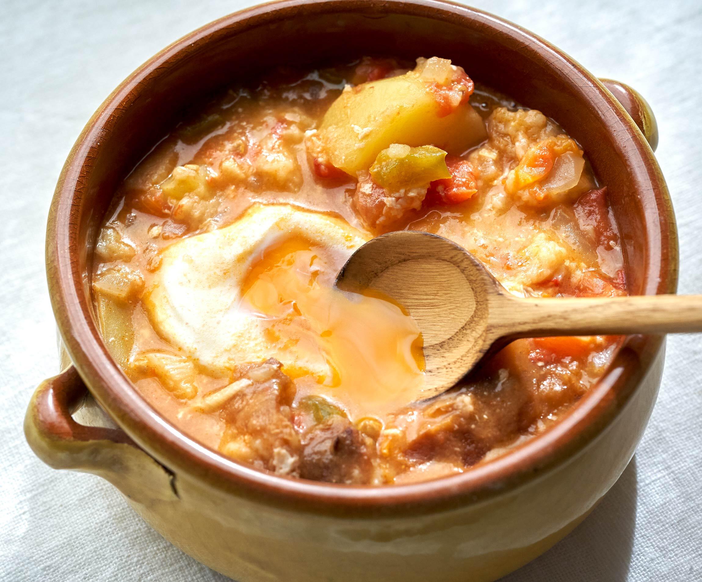 基本のガスパチョの素材をざくざく切り、じゃがいもを加えてグツグツ煮込み、ちぎったパンを加えた中に、卵を落として、出来上がり。卵をくずしながらボリュームたっぷりのアツアツを召し上がれ。