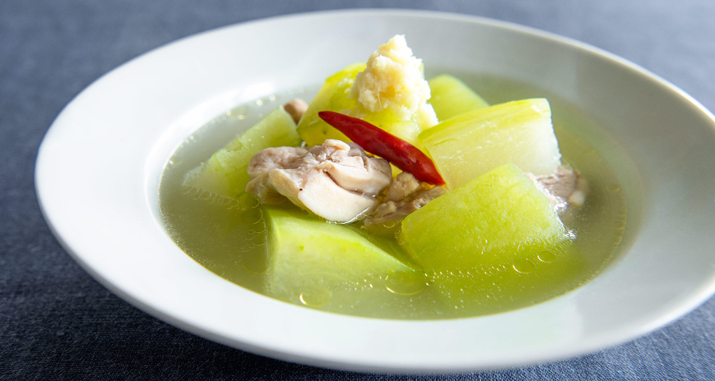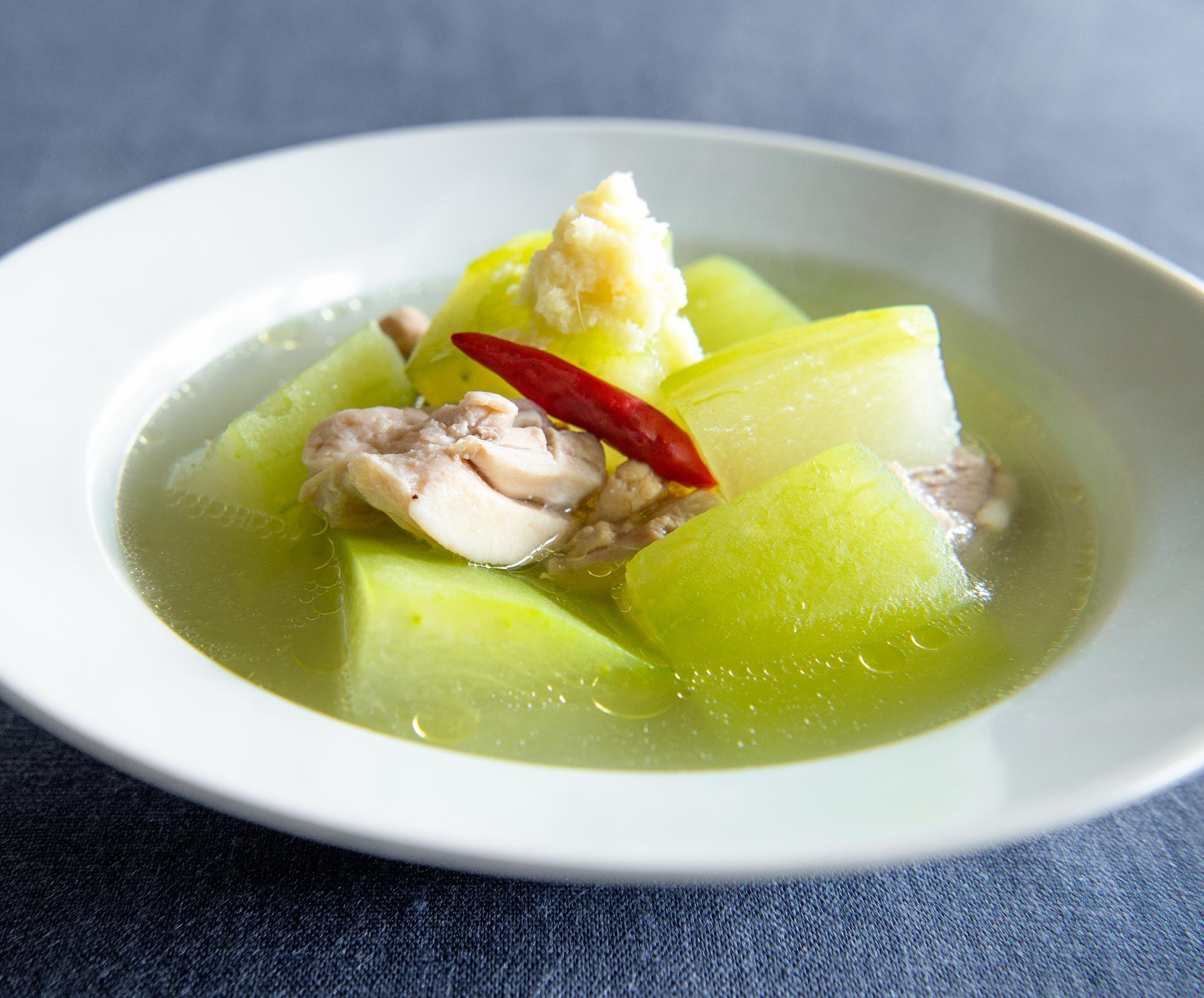 こちらも大庭先生のレシピです。透き通る淡い緑が美しく、ほんのりと生姜が香る滋味あふれるスープです。疲れた胃も喜ぶ、暑い日でもどこかホッとする温かいひと皿です。