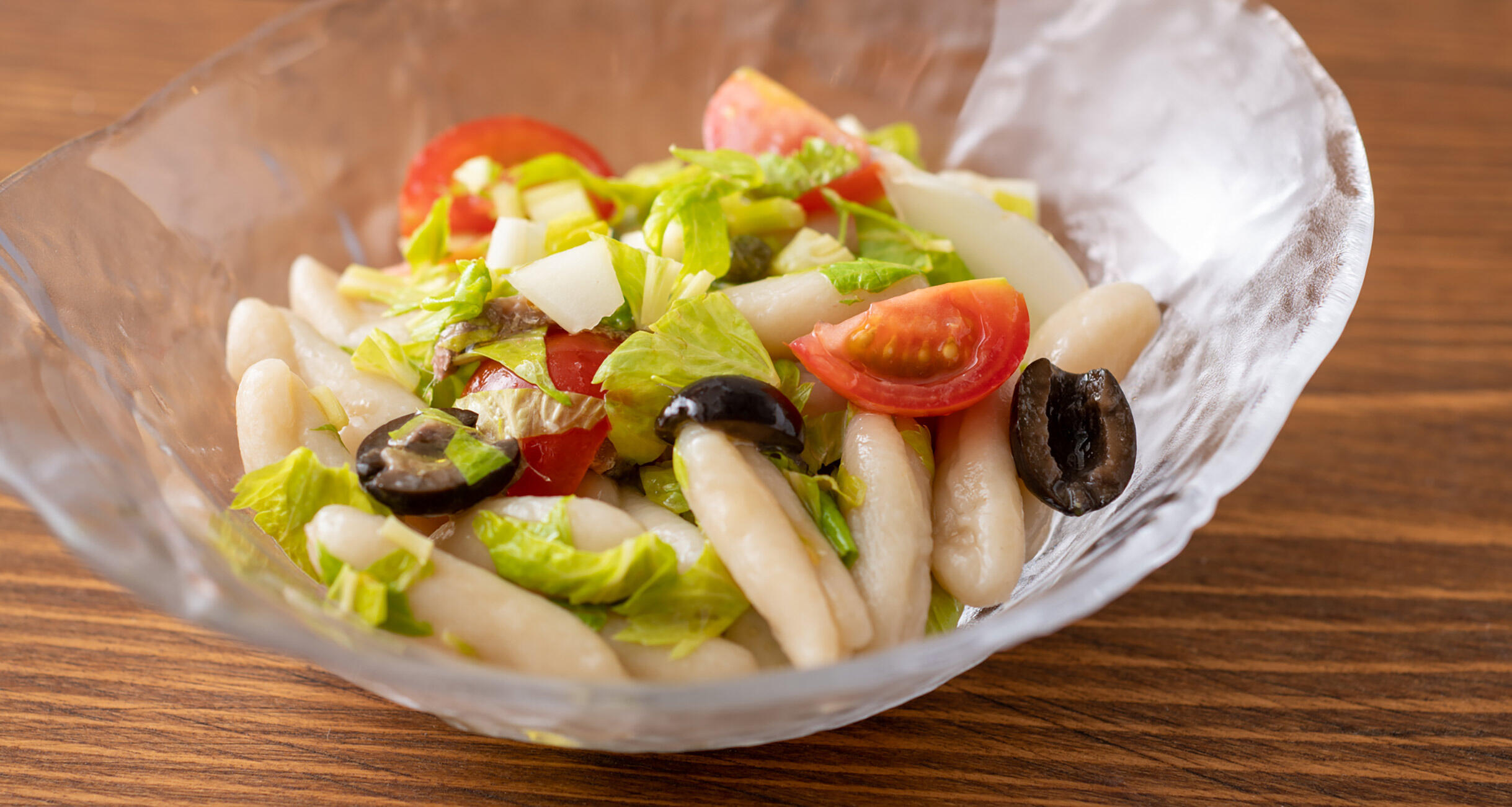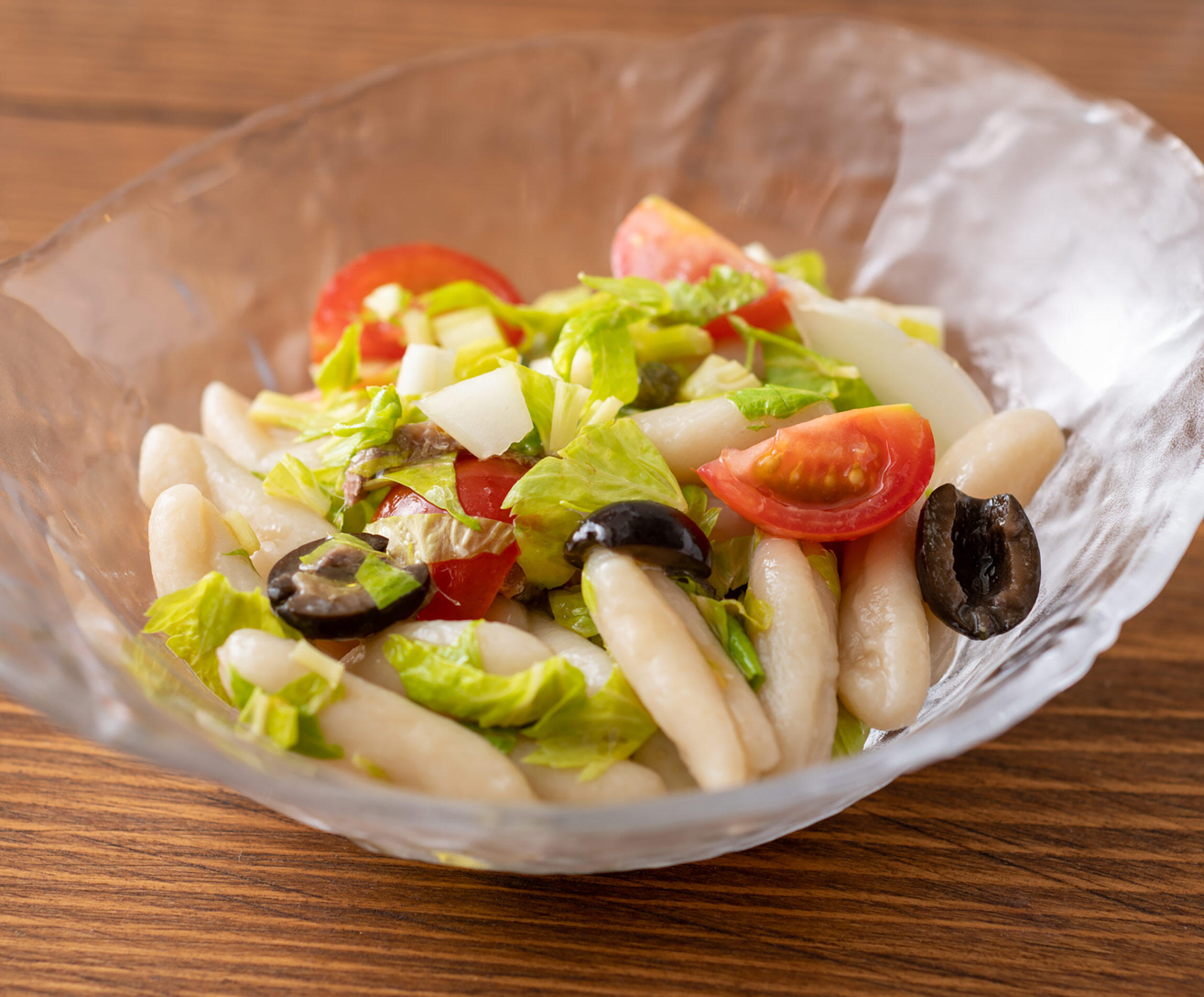 今回はセロリ、ミニトマト、オリーブですが、加熱しないで美味しい食材なら何でもOK。モッツァレラチーズもいいし、ルッコラやカニカマも美味しいですよ。手打ちのパスタが面倒なら、ペンネやフジッリなどのショートパスタを使うのもアリ。一度食べたら、半分生(具材は生、パスタは加熱)のパスタの面白さにきっと気付くはず!