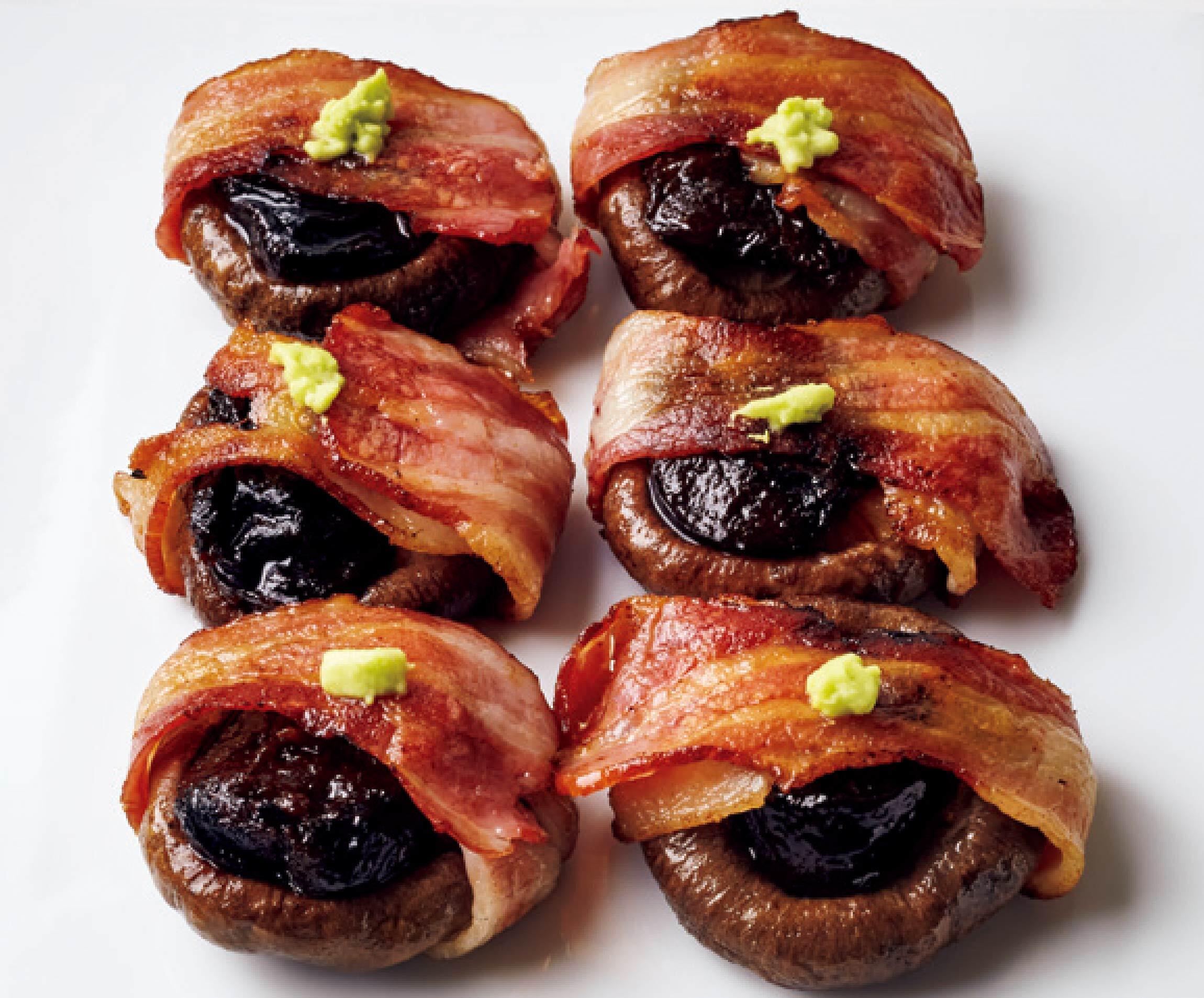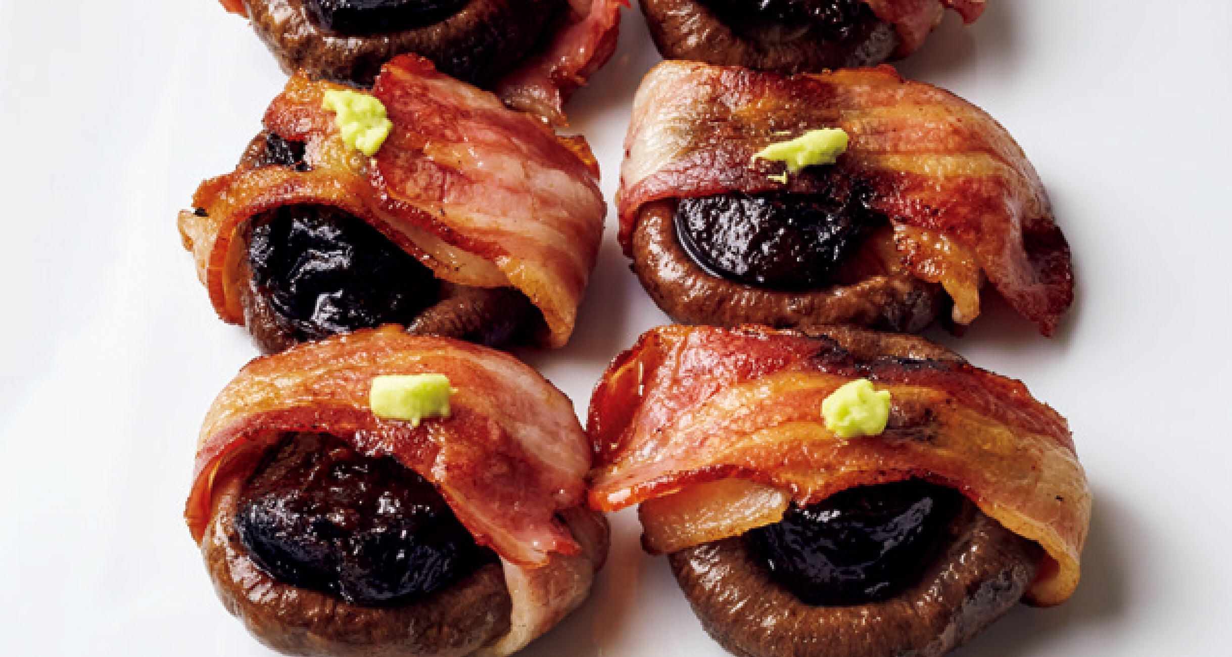 椎茸の笠の内側にプラムをのせてベーコンで巻き、つまようじで留める。