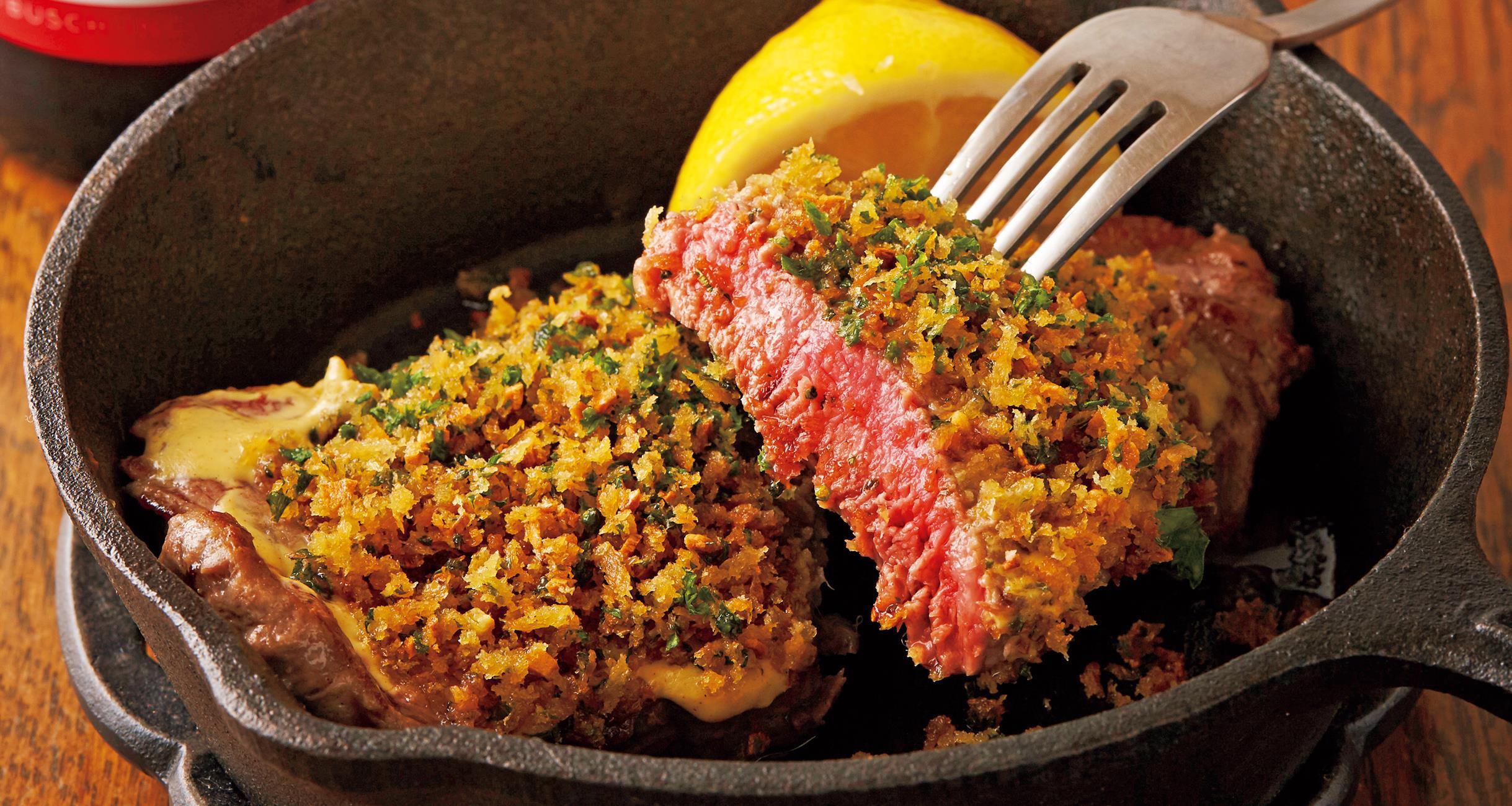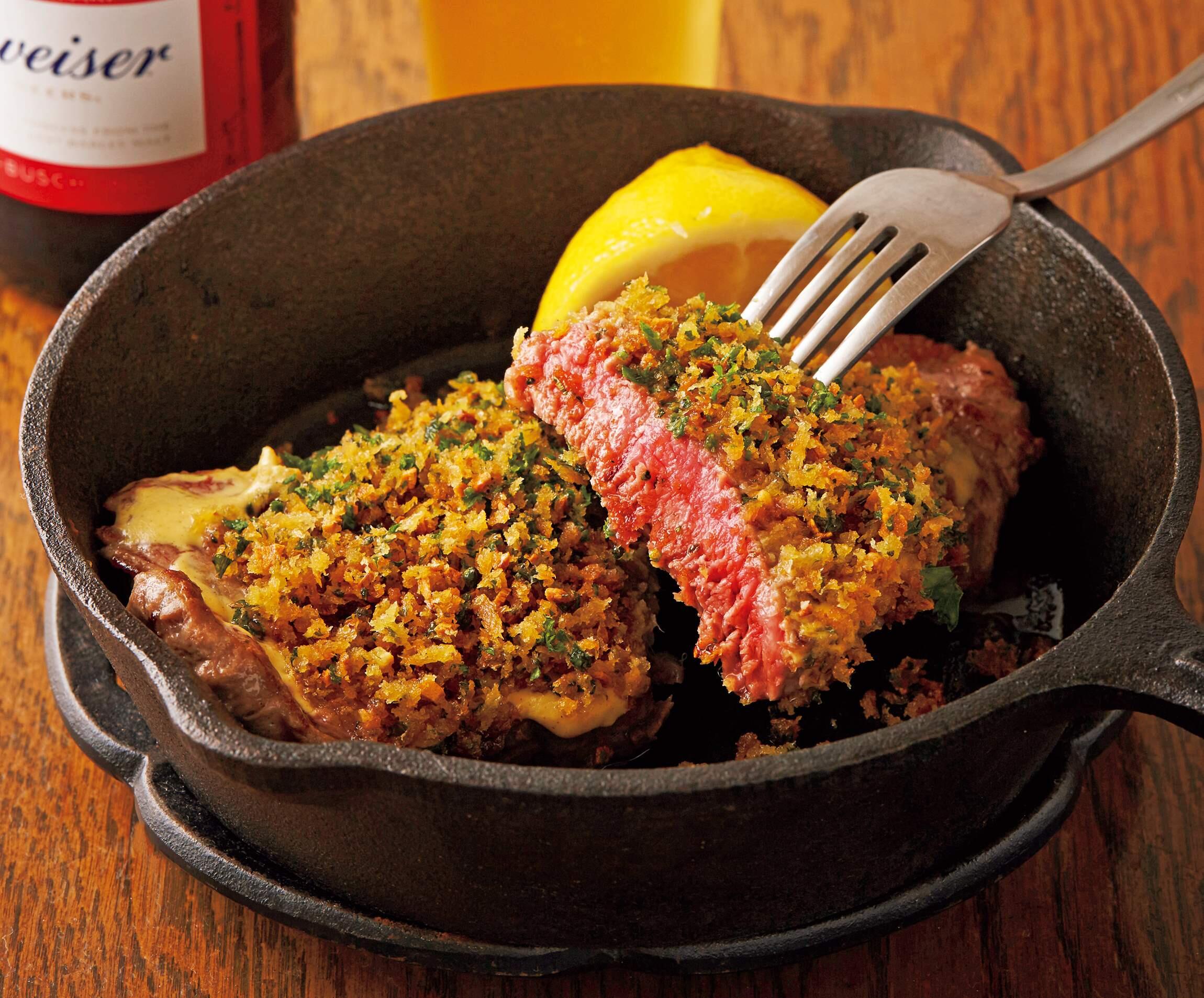 風味たっぷりの香りパン粉を使えばご馳走感アップ!キリリと冷えたビールと合わせるのがお薦めです。ワンパターンな味つけになりがちなステーキも、料理研究家の上田淳子さんの手にかかれば、あれよあれよという間にバリエーション豊かなつまみに変身。誰もが笑顔になる、お酒が進む豪快なステーキつまみを習いました。