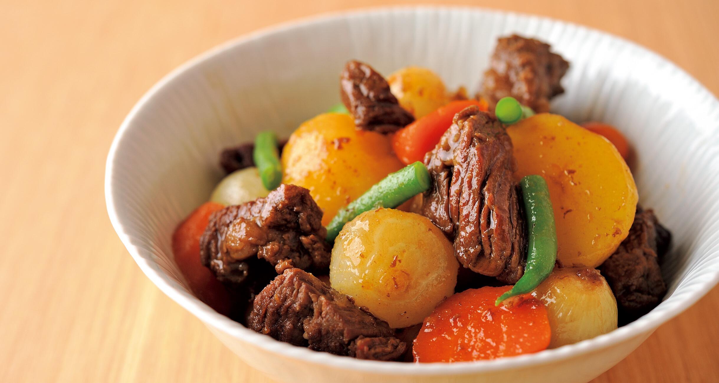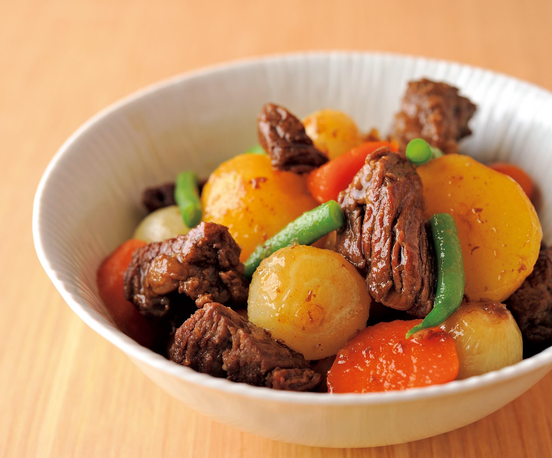 仕上げにじゃがいも、ペコロス、いんげん、醤油を入れ、落とし蓋をして弱火で20分煮込み、器に盛る。