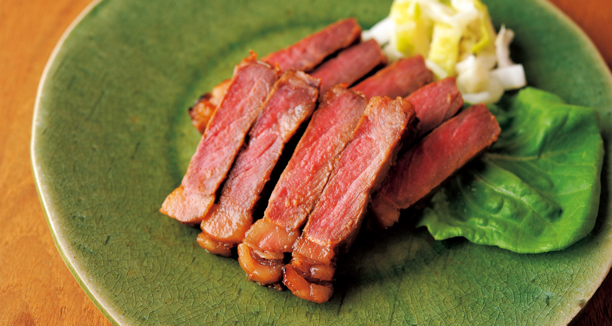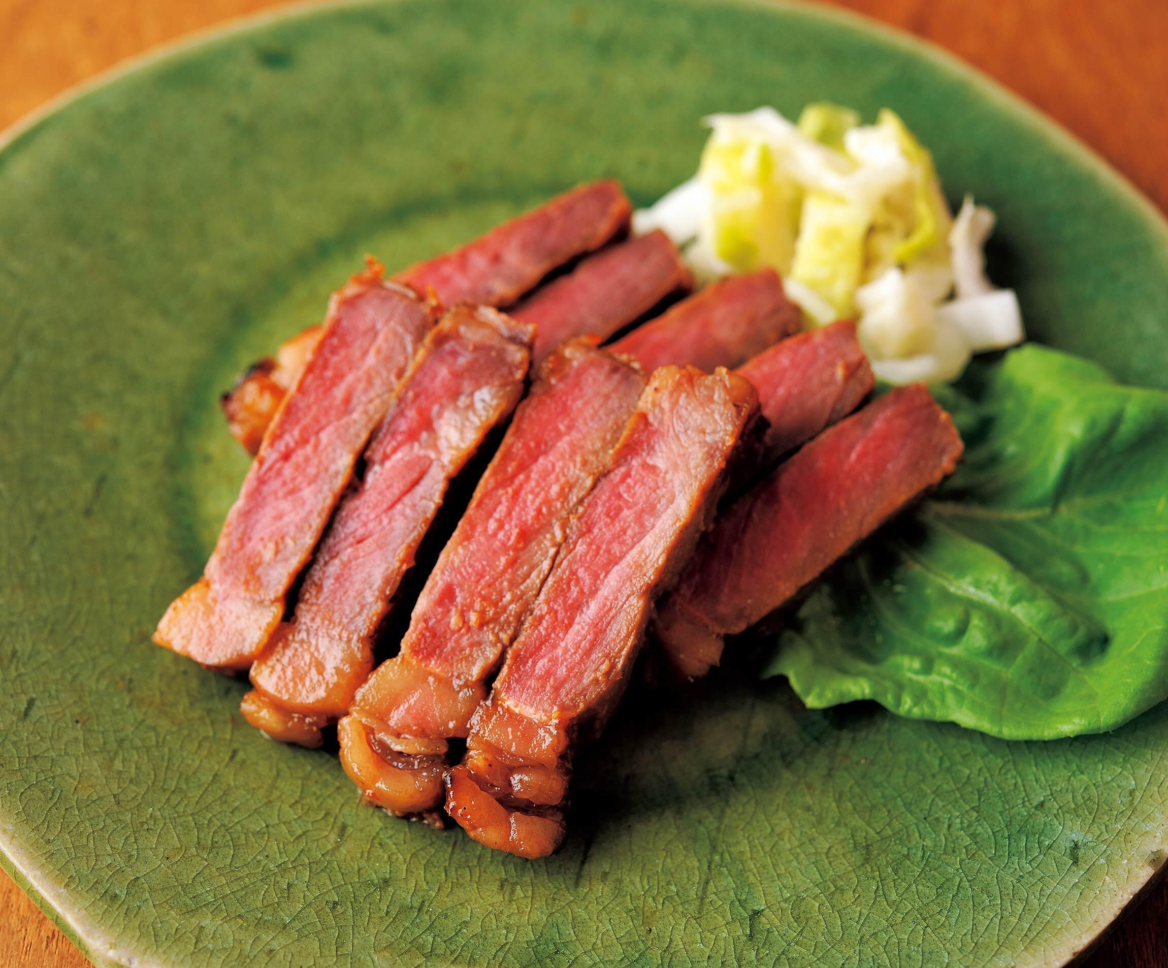 肉の表面のタレをきれいに拭き取り、予熱した魚焼きグリルを弱火にし、肉を上面3分、下面3分焼く。好みの幅に切り、皿に盛って完成。