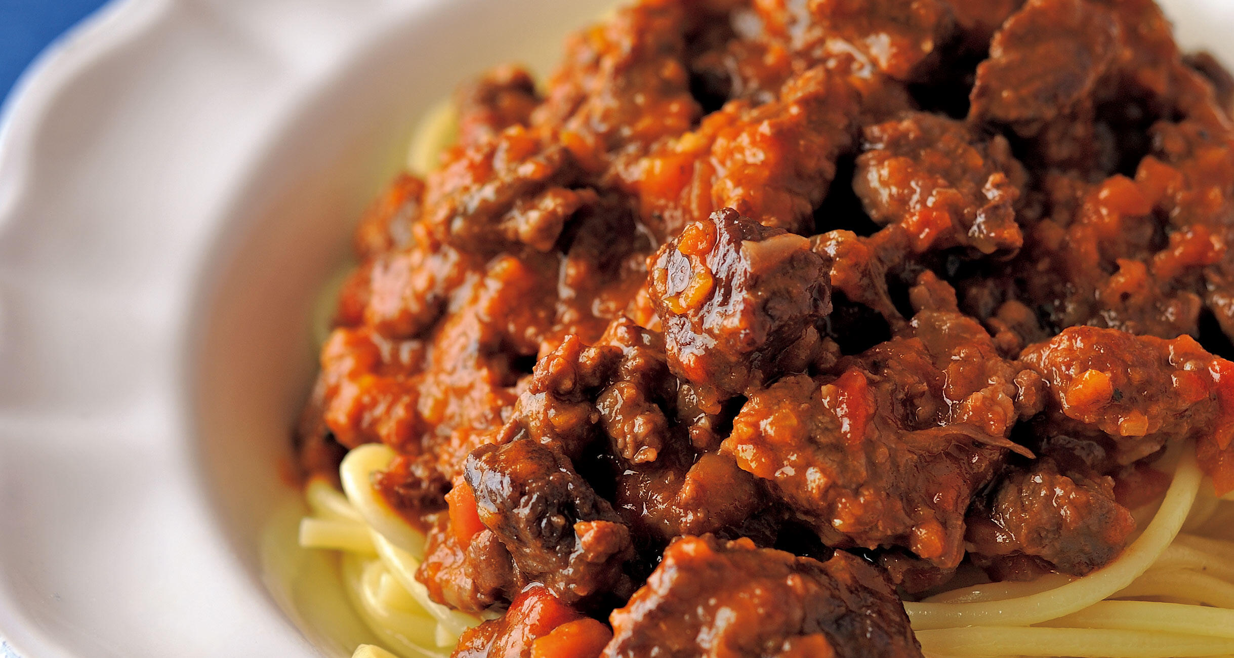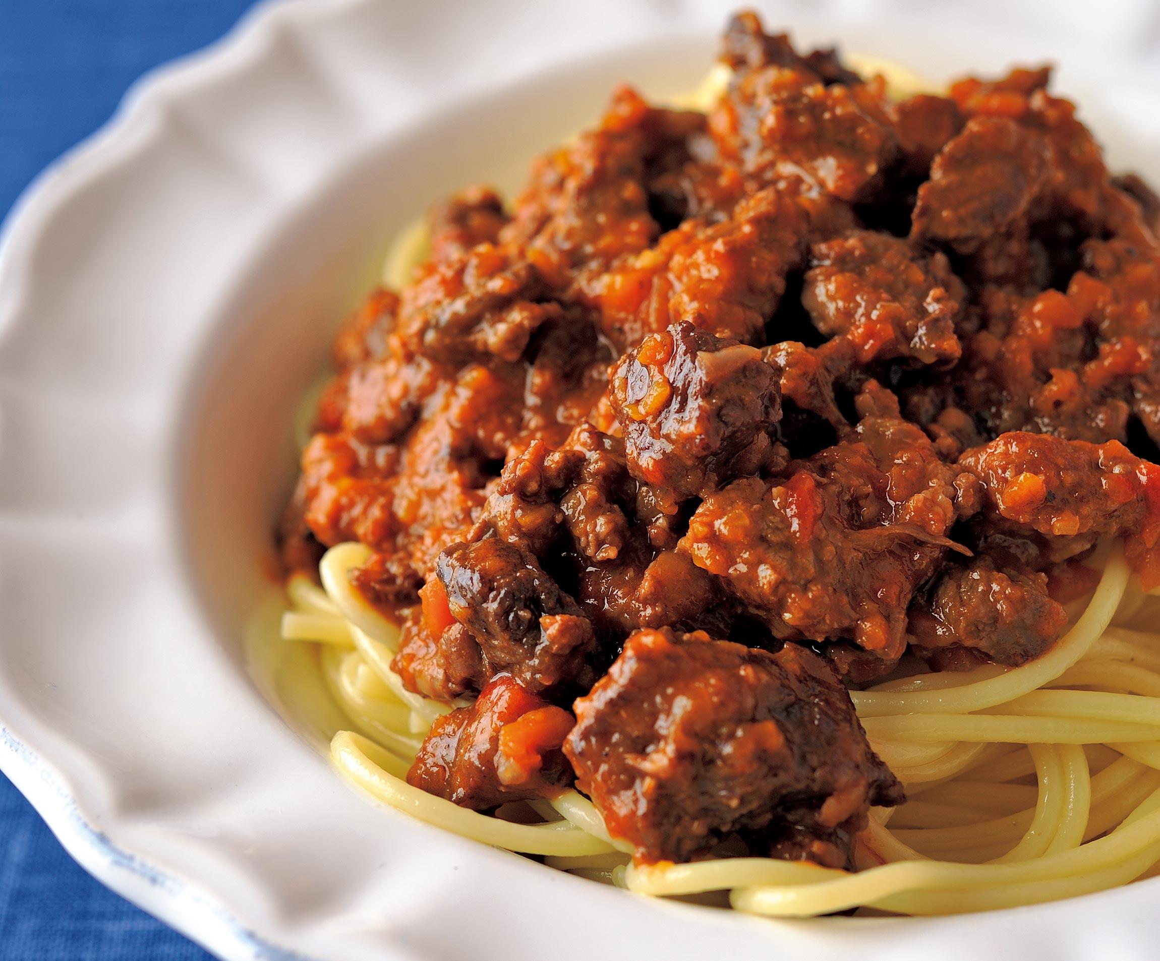 ひき肉+ゴロゴロ肉の満足感は手づくりならではの至福の味わい。パスタとの合わせを楽しむもよし、肉だけをつまんでほくそ笑むもよし。