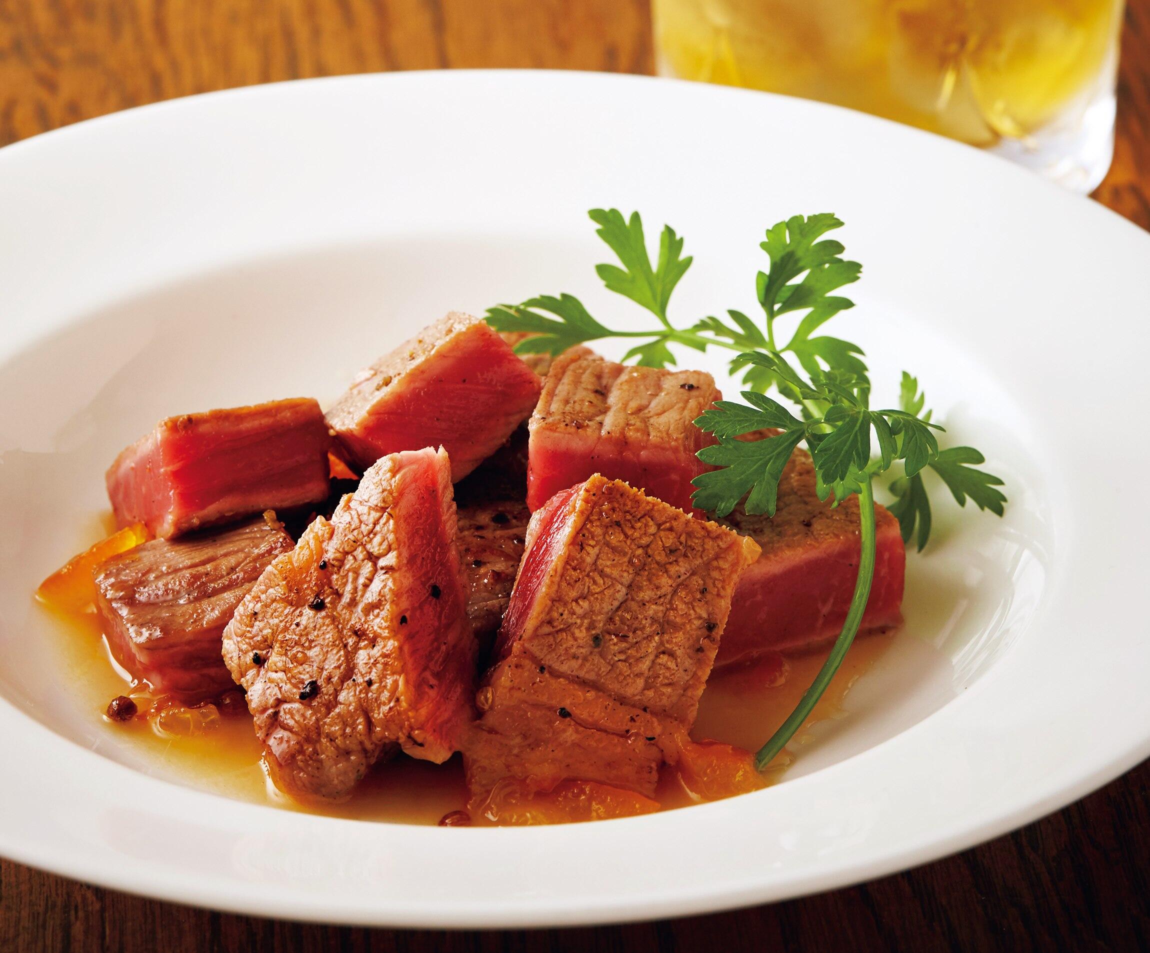 赤身肉の美味しさを引き立てるオレンジ・マーマレードベースのソースが美味。甘味を和らげる隠し味に、芳醇なウイスキーを加えて風味アップ。ワンパターンな味つけになりがちなステーキも、料理研究家の上田淳子さんの手にかかれば、あれよあれよという間にバリエーション豊かなつまみ変身。誰もが笑顔になる、お酒が進む豪快なステーキつまみを習いました。